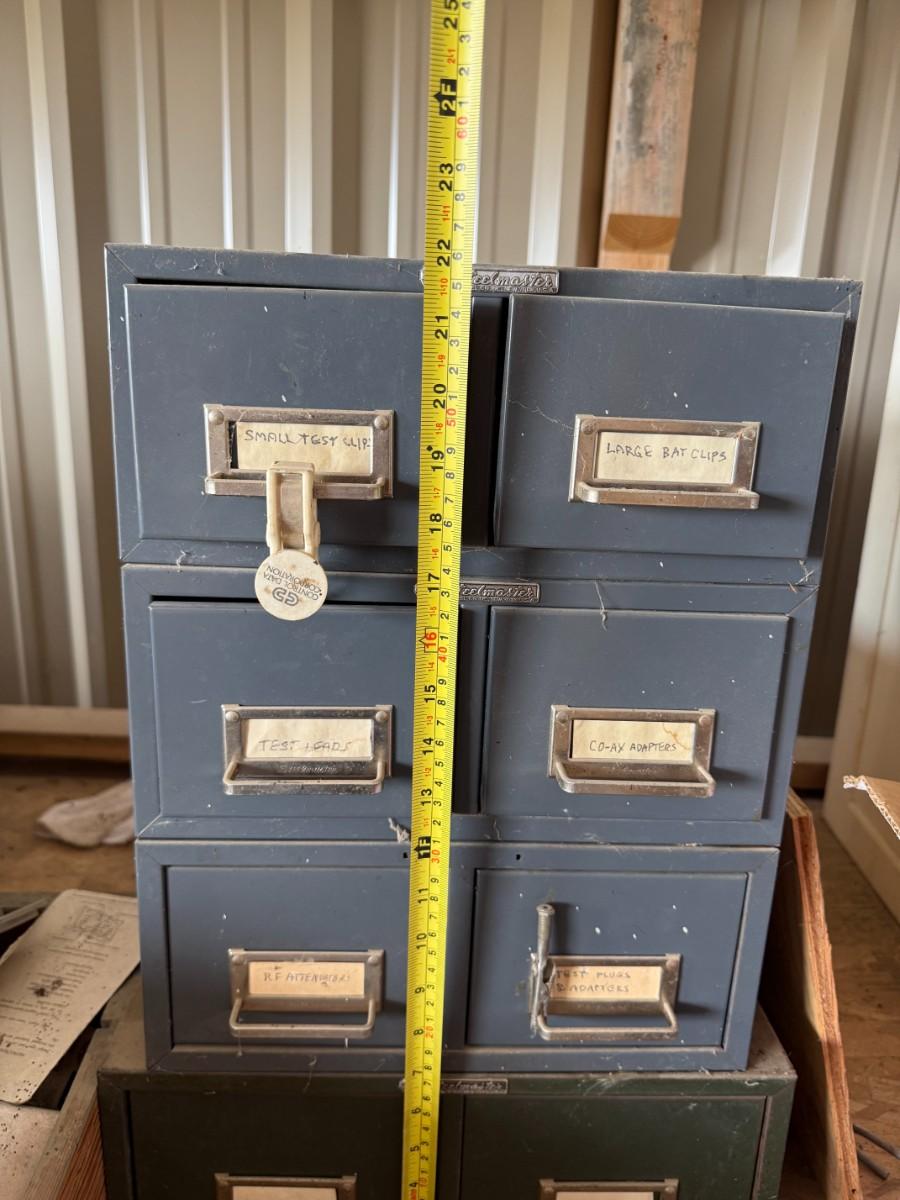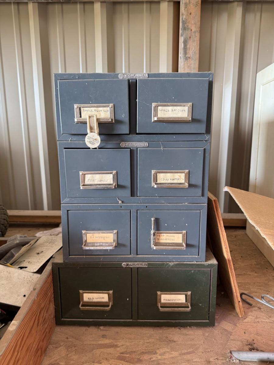 Industrial metal storage drawers labeled for hardware and components. Perfect for garages, workshops, or craft storage.