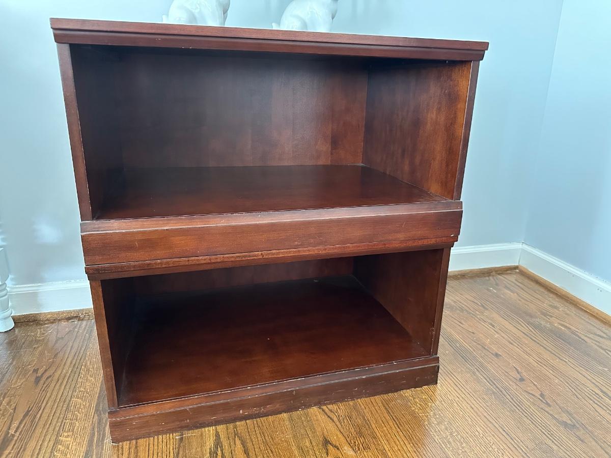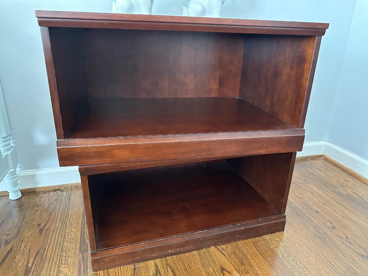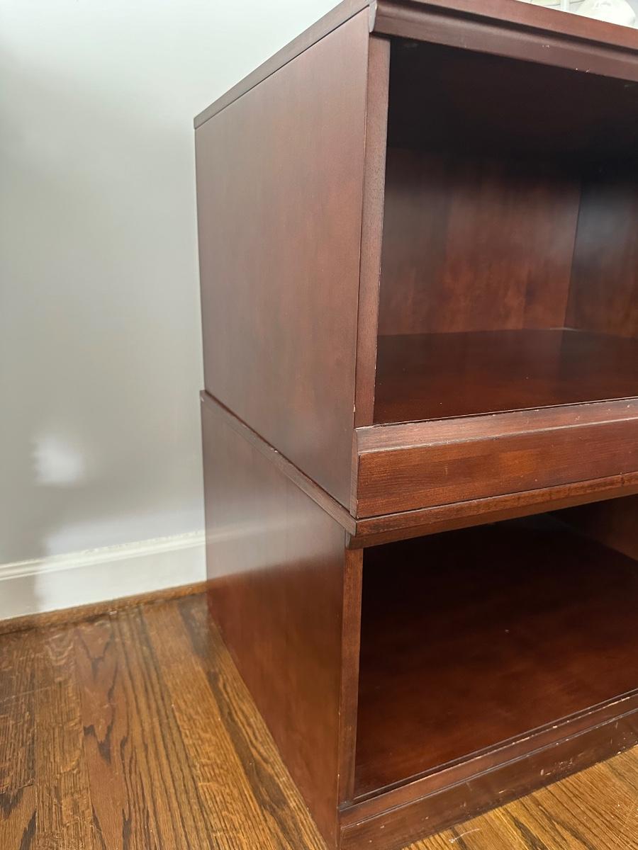 SET OF 4 STACKING CUBE WOOD SHELVES, USE SEPARATE OR TOGETHER FOR HEIGHT 15 1/2 TALL X 30X30 SOME CHIPPING ON BOTTOMS