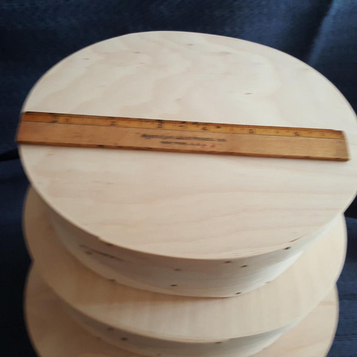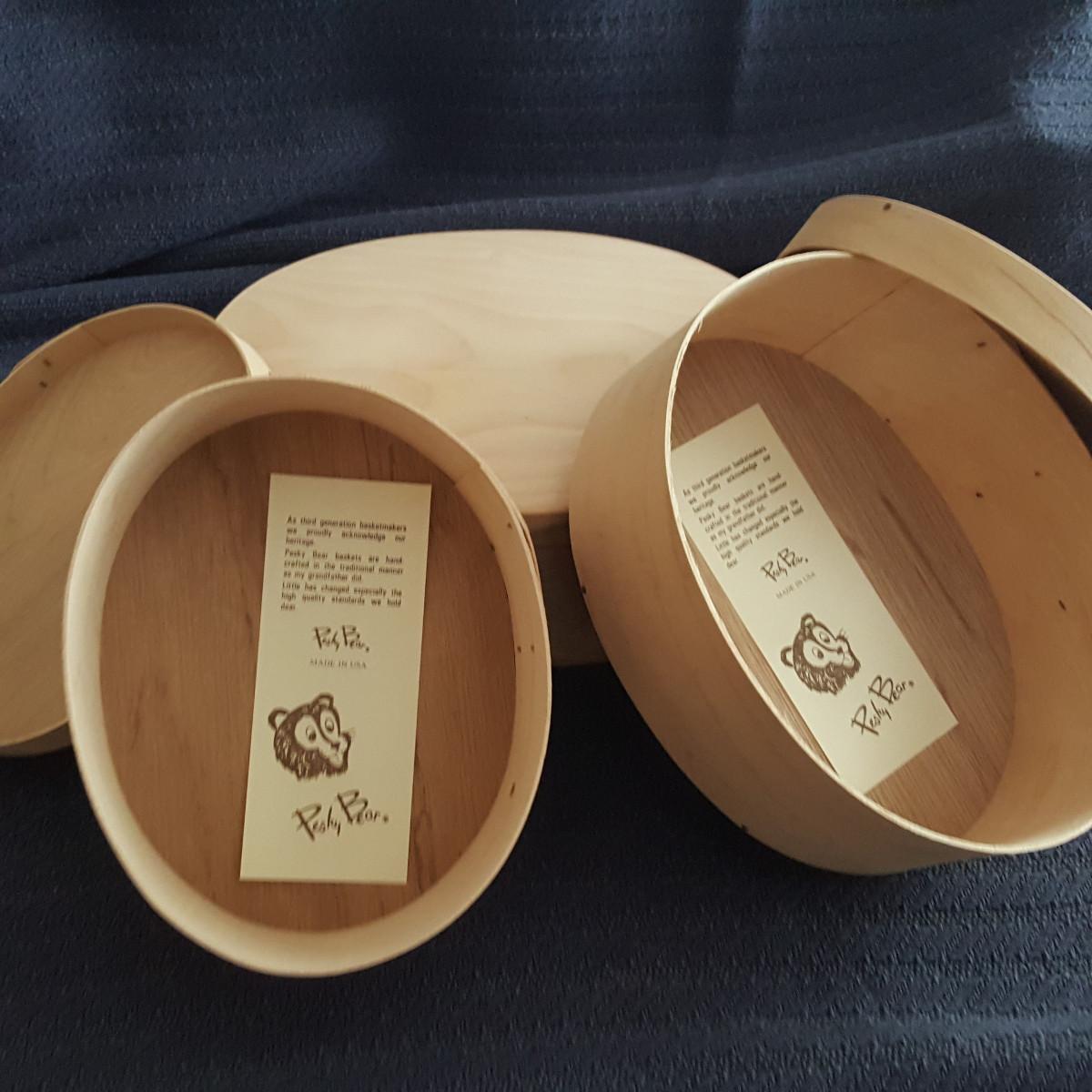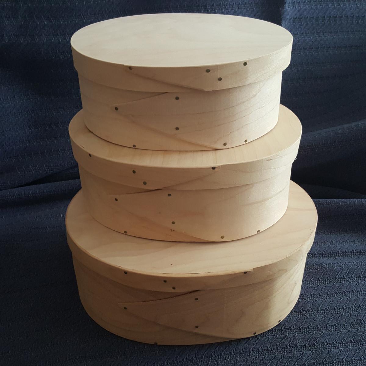 This auction lot is for a Stacking Set of 3 USA-Made Shaker-Style Boxes. The boxes are sanded wood and unstained. The largest box measures about 9.5-inches across the widest part of the oval and about 7.5-inches across the middle. The box stands about 3.5-inches tall. The remaining two boxes are progressively smaller to fit within. This set of boxes is part of a new liquidation we are doing for a lady who owned a large herb catalog business in the early 80s and these were part of her stock - which over time, as the catalog changed - got shoved to the back of her basement unsold. She told us that she bought these wholesale from the Pesky Bear Basket Company in Wisconsin. They do not show these boxes in their on-line catalog and may no longer make them.