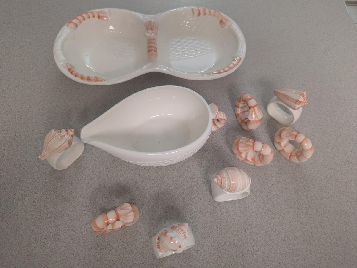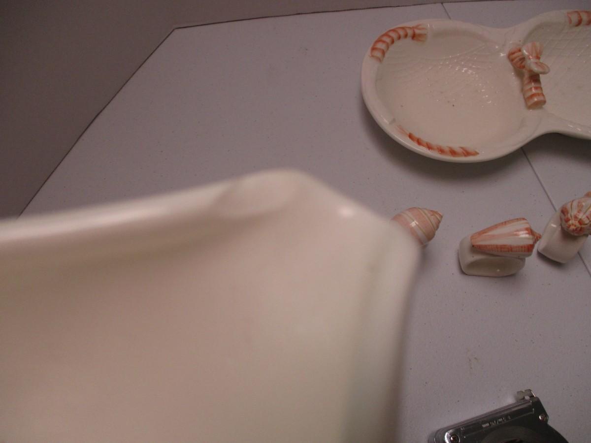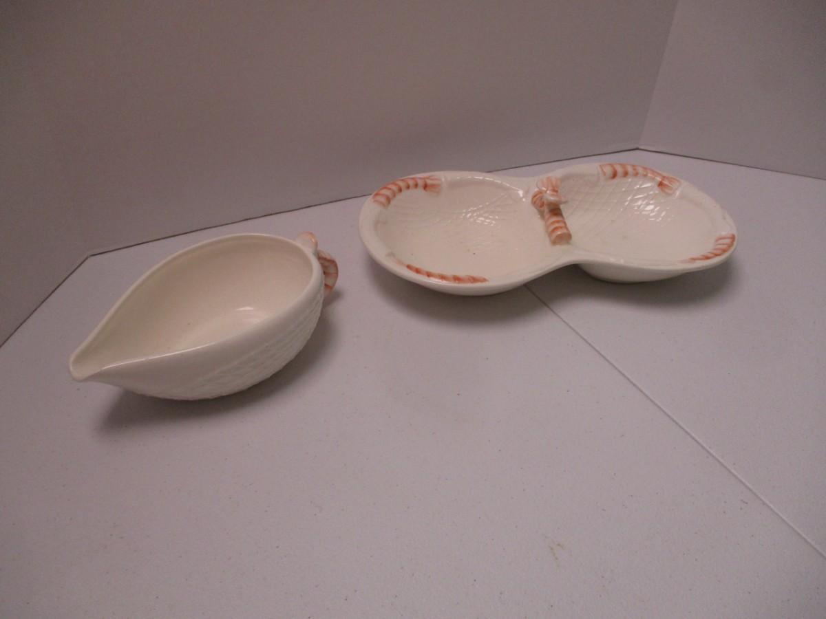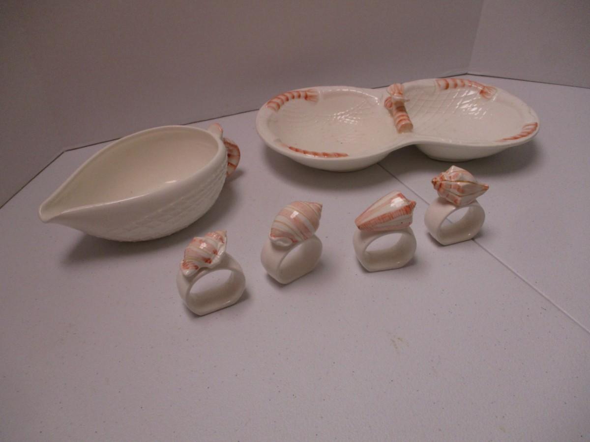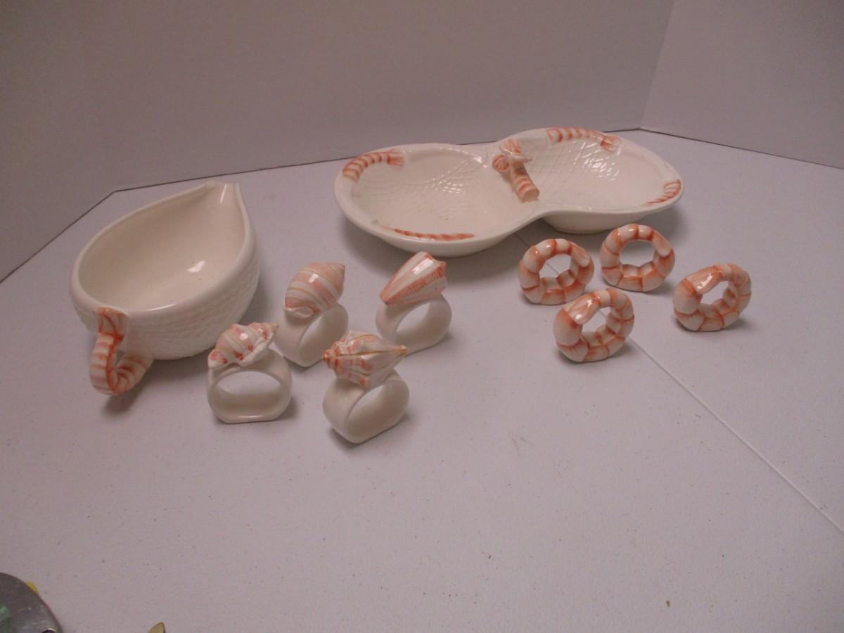 Stafford 1986 Japan Sea Fare Porcelain White & Coral Ceramic Shrimp Dishes & Napkin Holders (K)