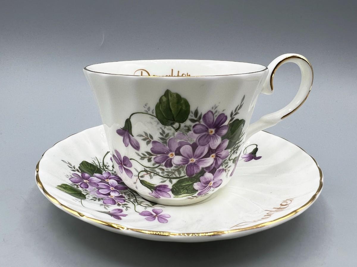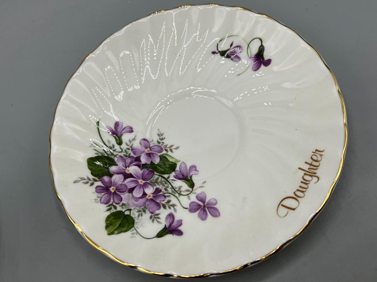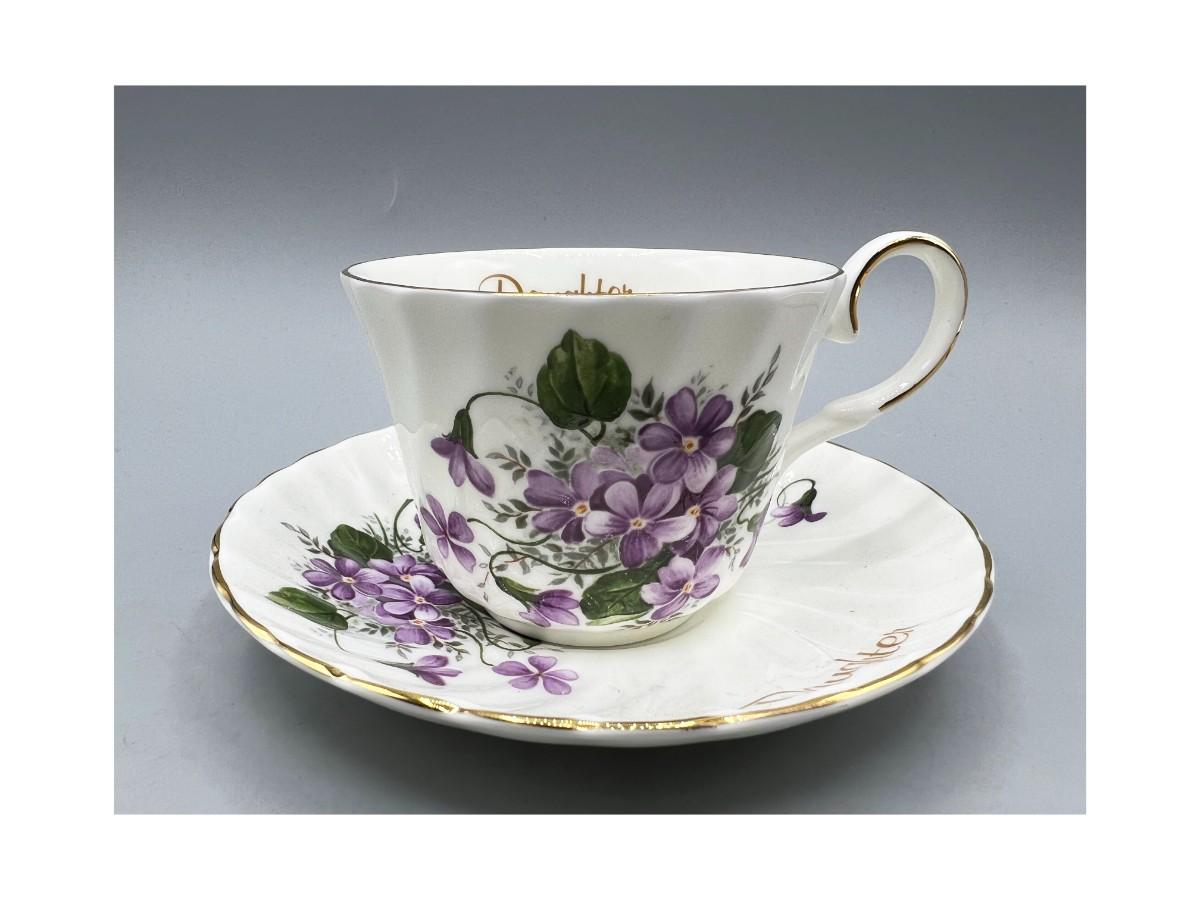 Staffordshire Collection Purple Violet Flowers Daughter Gift Teacup & Saucer. In good condition.