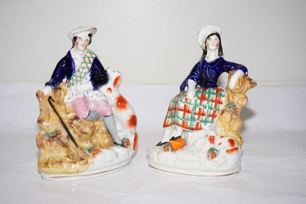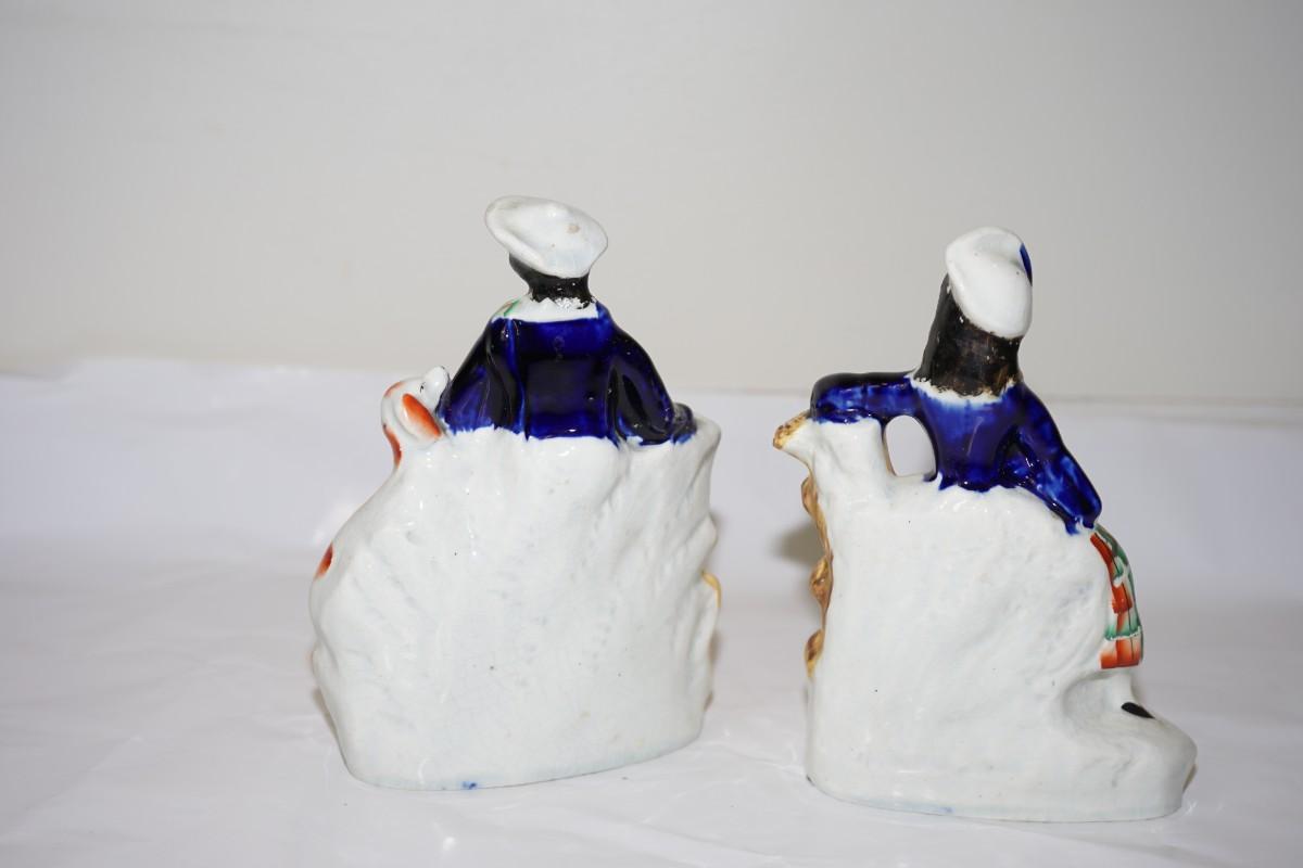 ANTIQUE 1860'S STAFFORDSHIRE FIGURINES MAN & WOMAN IN SCOTTISH ATTIRE LEANING ON ROCK