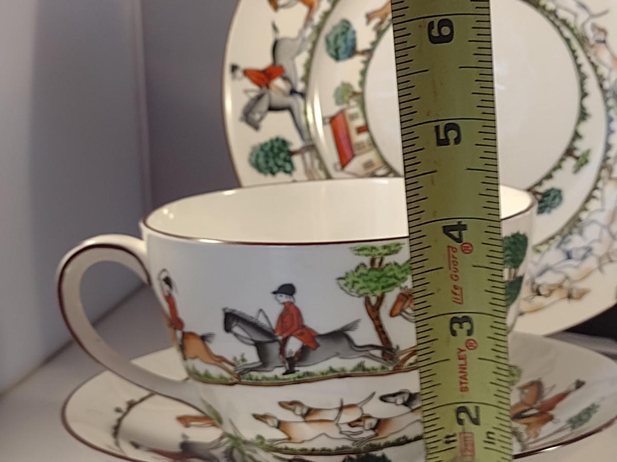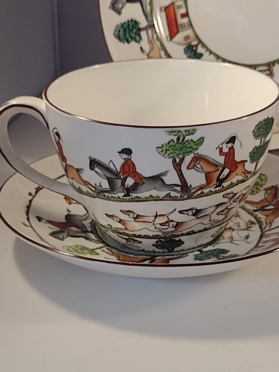 Staffordshire Fox Hunt Design China- 6 Pieces. Two luncheon plates, regular cup and saucer, large cup and saucer.