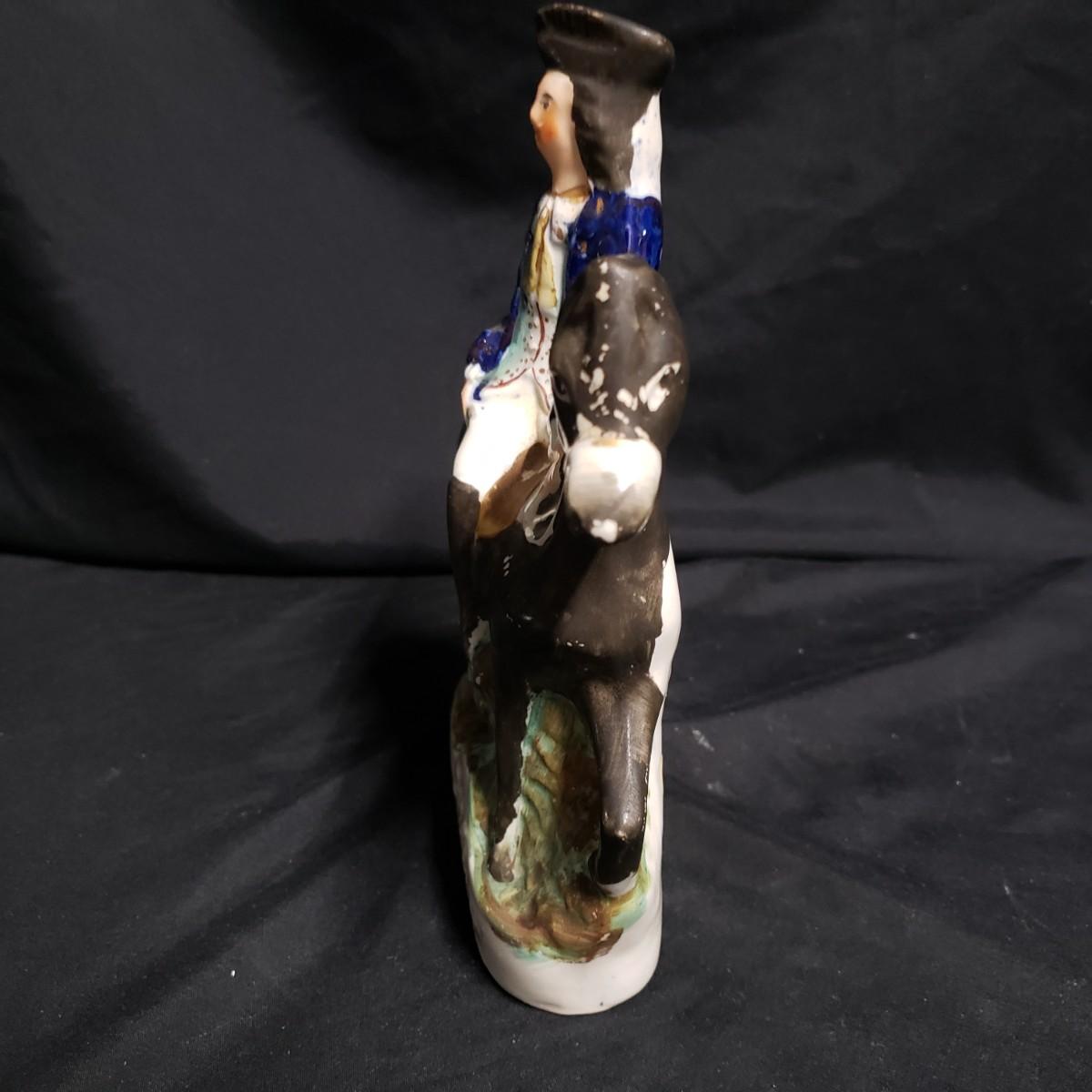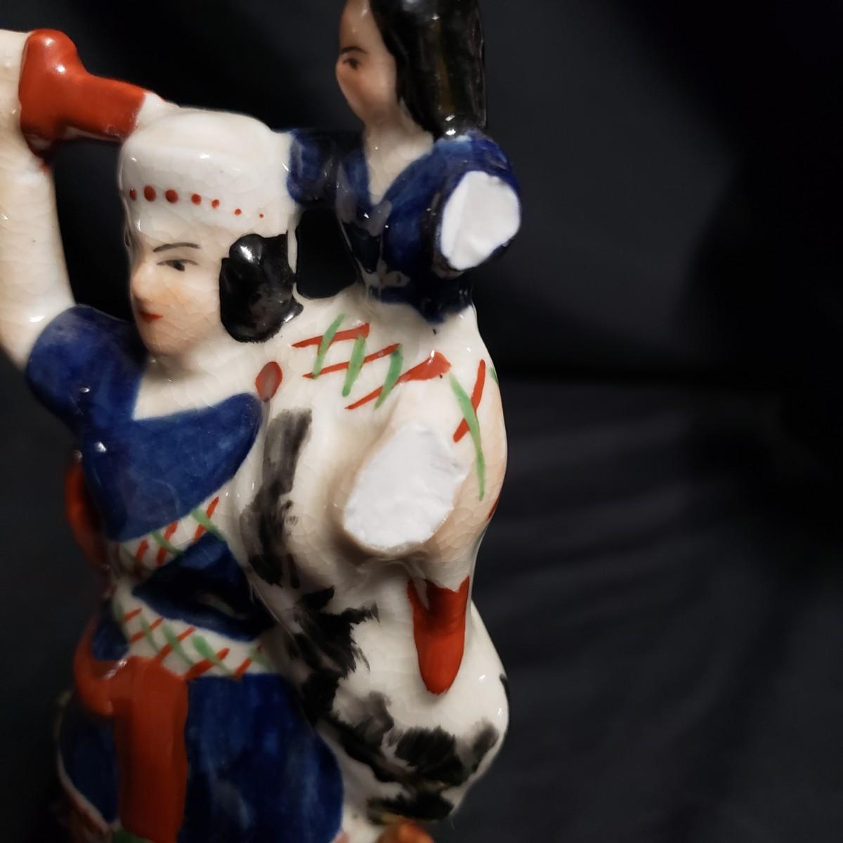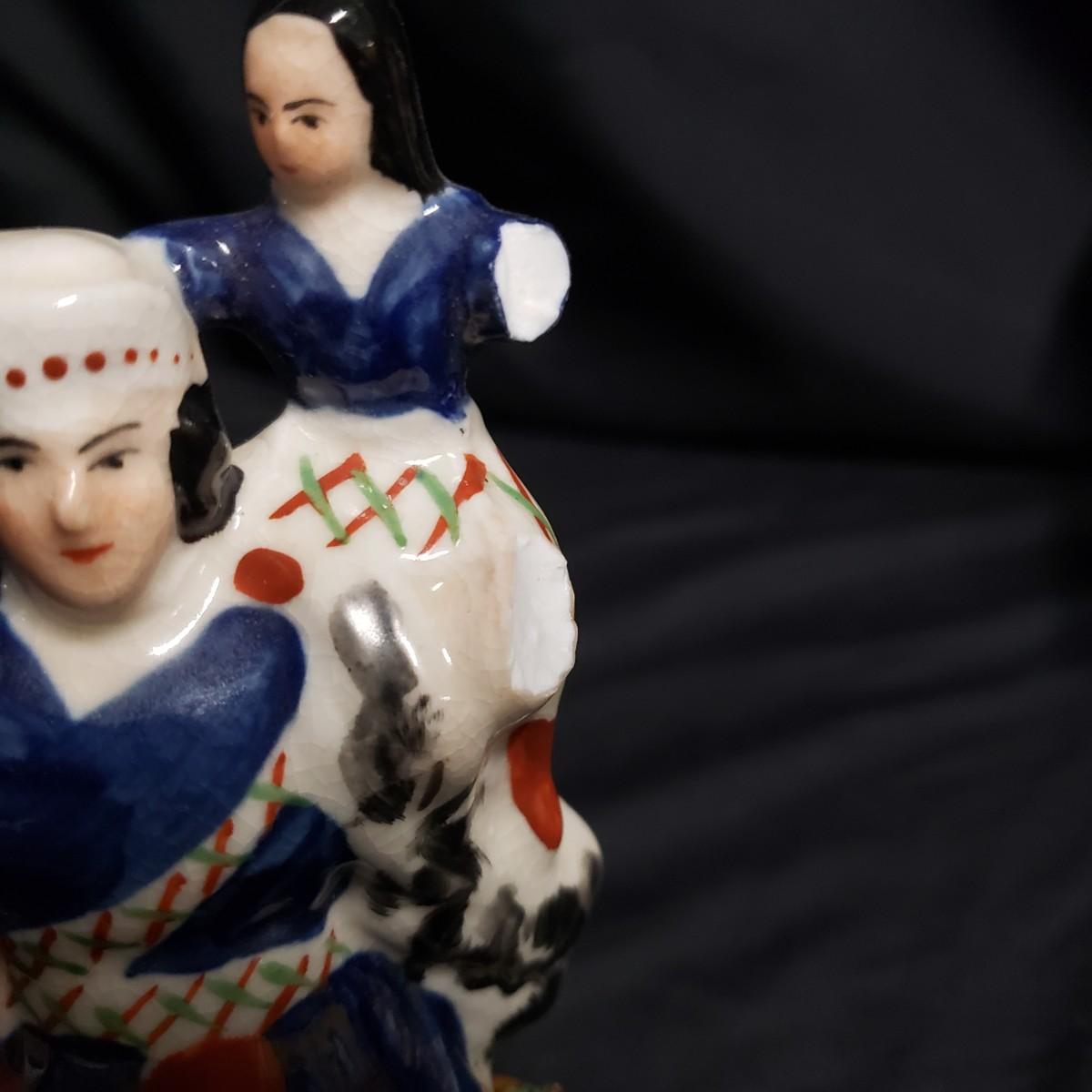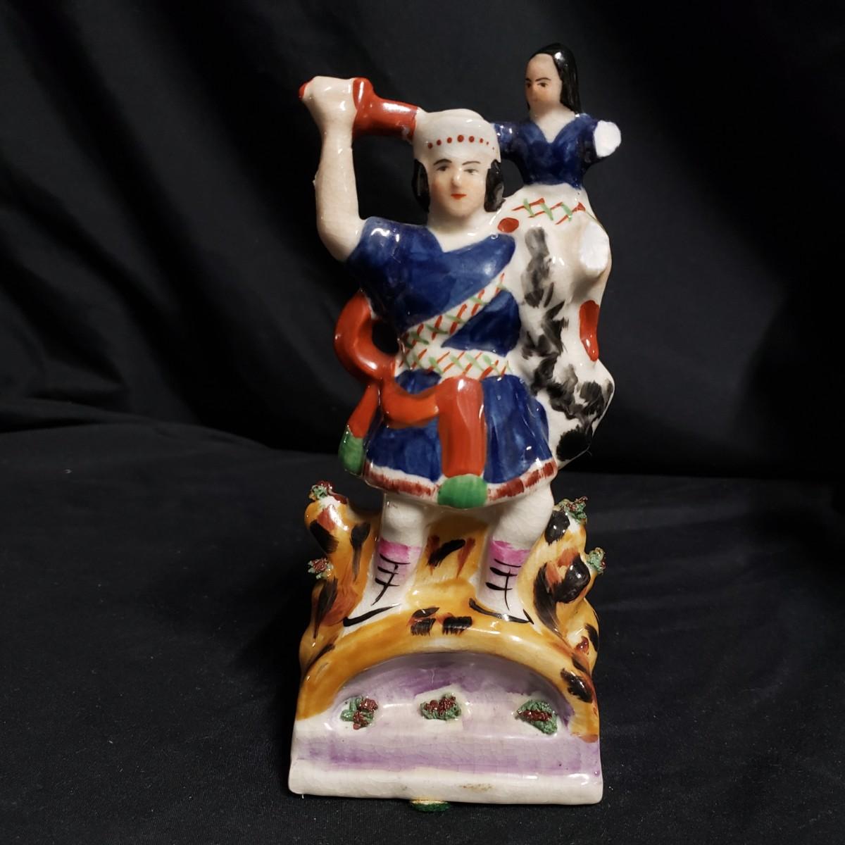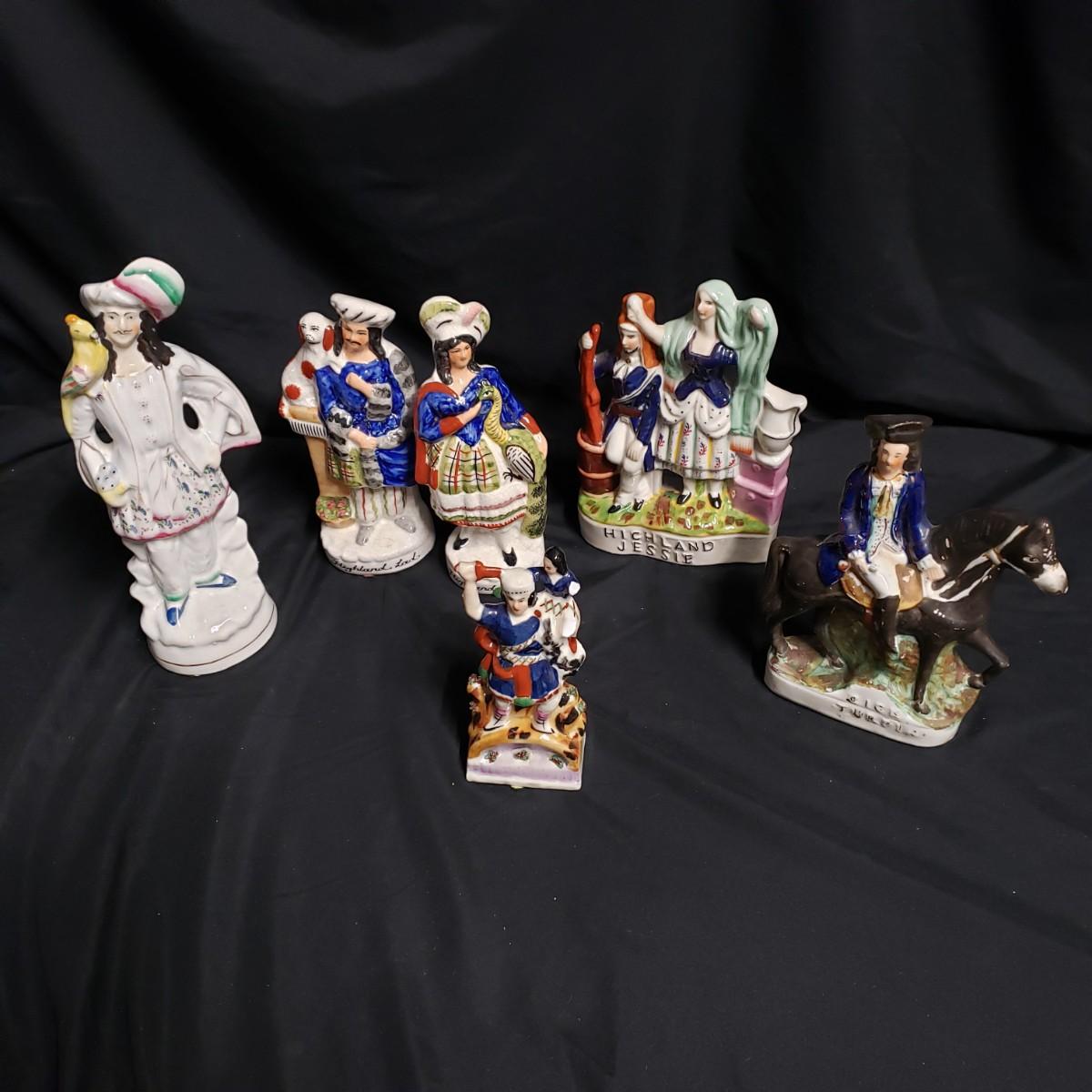 This six piece, possibly Staffordshire figurines feature Highland Lad and Lass, Highland Jessie, Rolla Circus Strong Man, Dick Turpin and a man and his parrot. The Highland figurines measure approximately 4" x 2" x 8"H. Unfortunately, the parrot wanted to fly off and broke off the man's shoulder. The circus strong man holding a woman is missing an arm and leg, yet the show must go on!