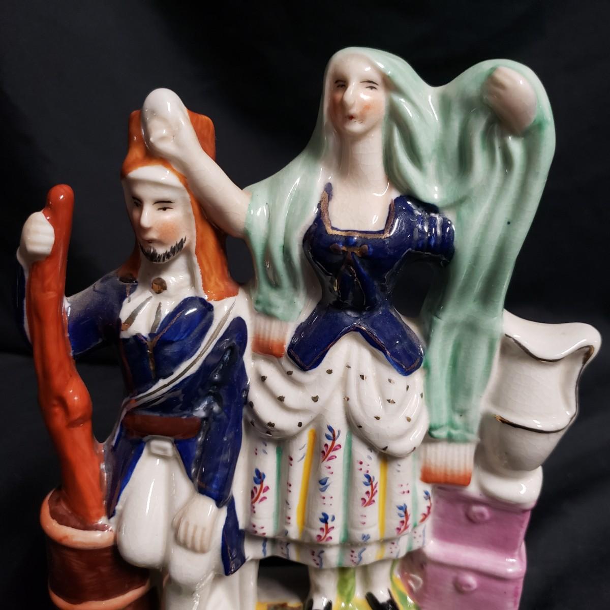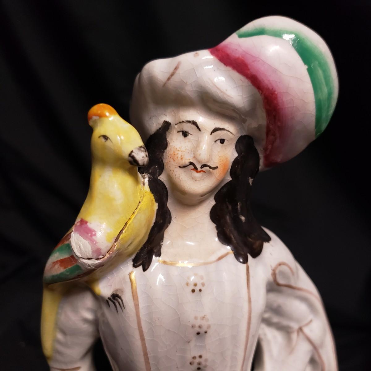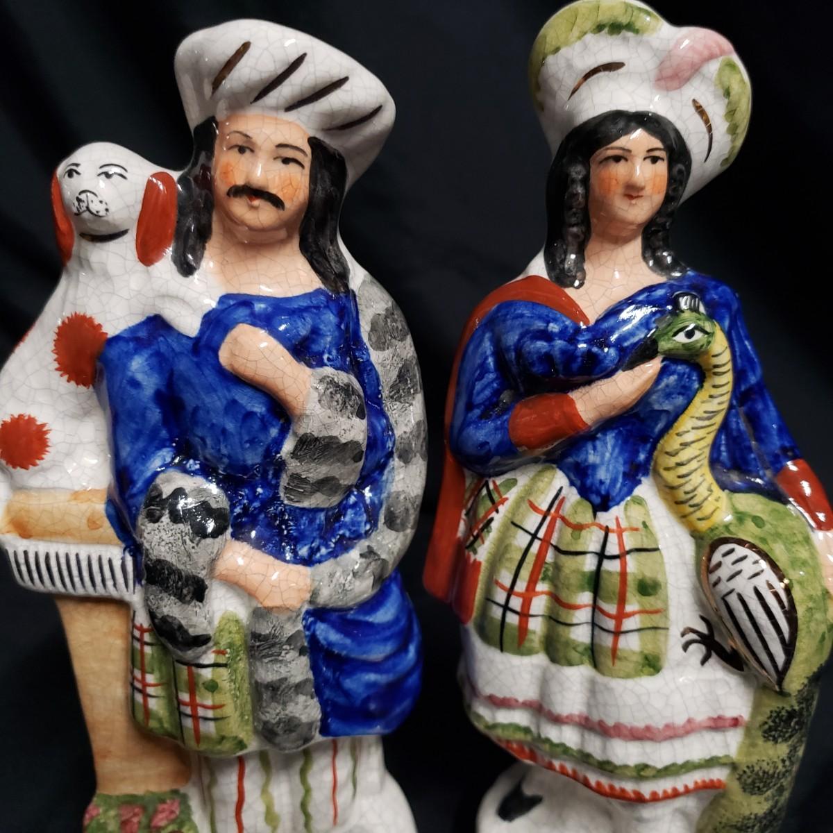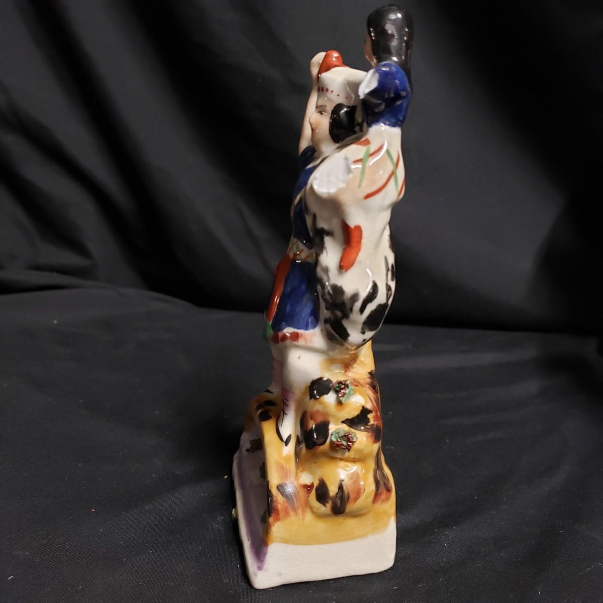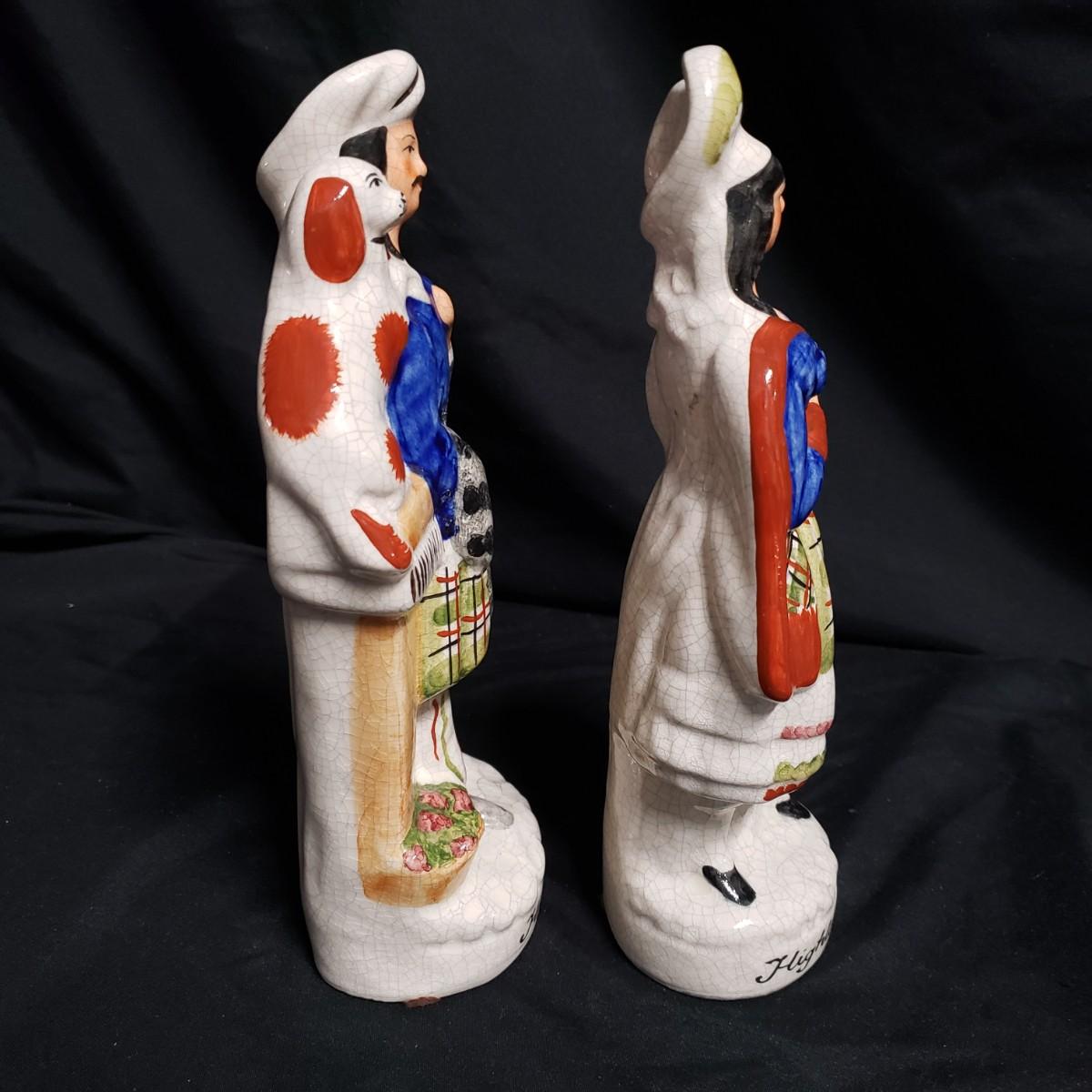 This six piece, possibly Staffordshire figurines feature Highland Lad and Lass, Highland Jessie, Rolla Circus Strong Man, Dick Turpin and a man and his parrot. The Highland figurines measure approximately 4" x 2" x 8"H. Unfortunately, the parrot wanted to fly off and broke off the man's shoulder. The circus strong man holding a woman is missing an arm and leg, yet the show must go on!
