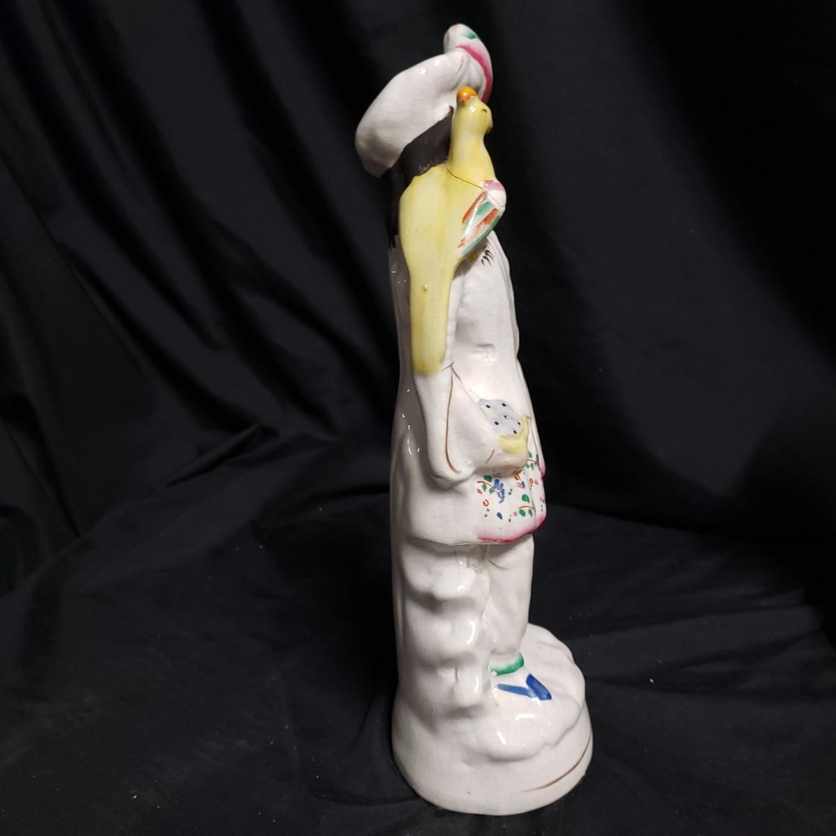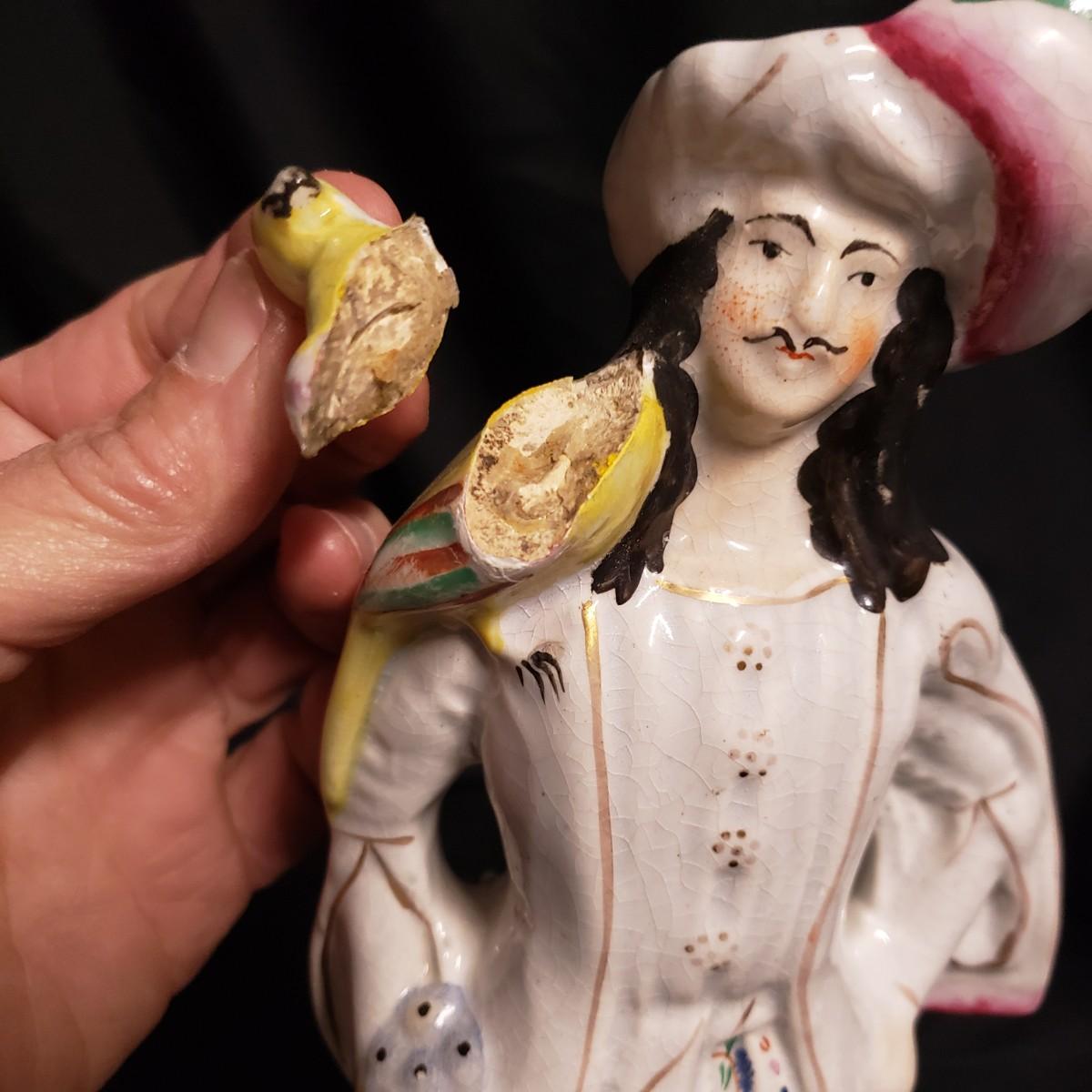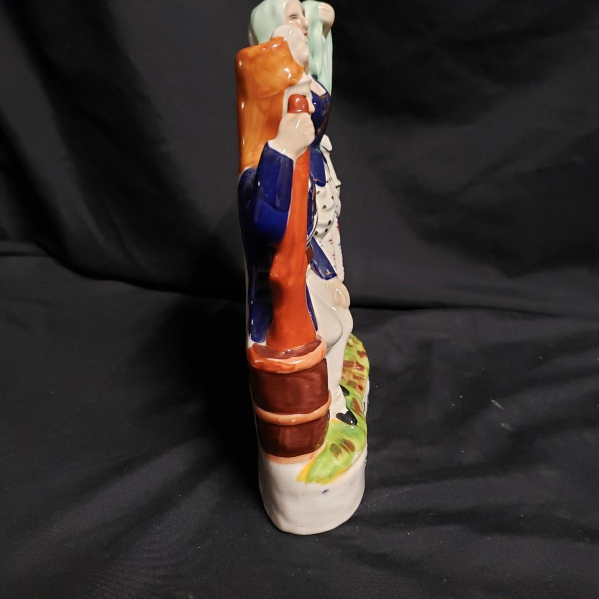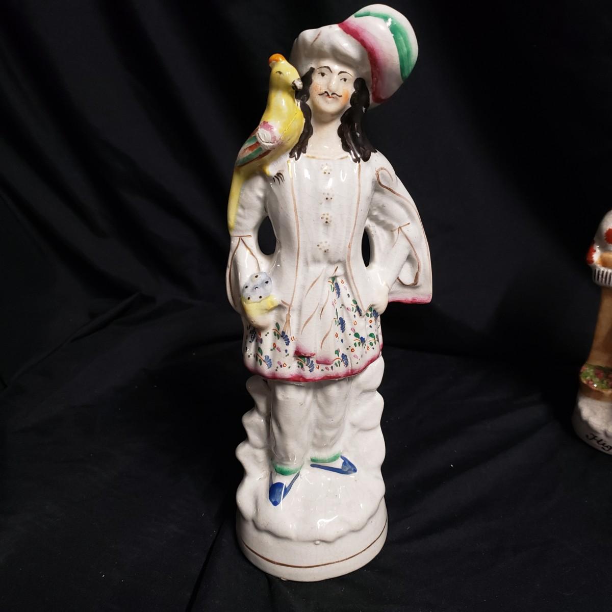 This six piece, possibly Staffordshire figurines feature Highland Lad and Lass, Highland Jessie, Rolla Circus Strong Man, Dick Turpin and a man and his parrot. The Highland figurines measure approximately 4" x 2" x 8"H. Unfortunately, the parrot wanted to fly off and broke off the man's shoulder. The circus strong man holding a woman is missing an arm and leg, yet the show must go on!