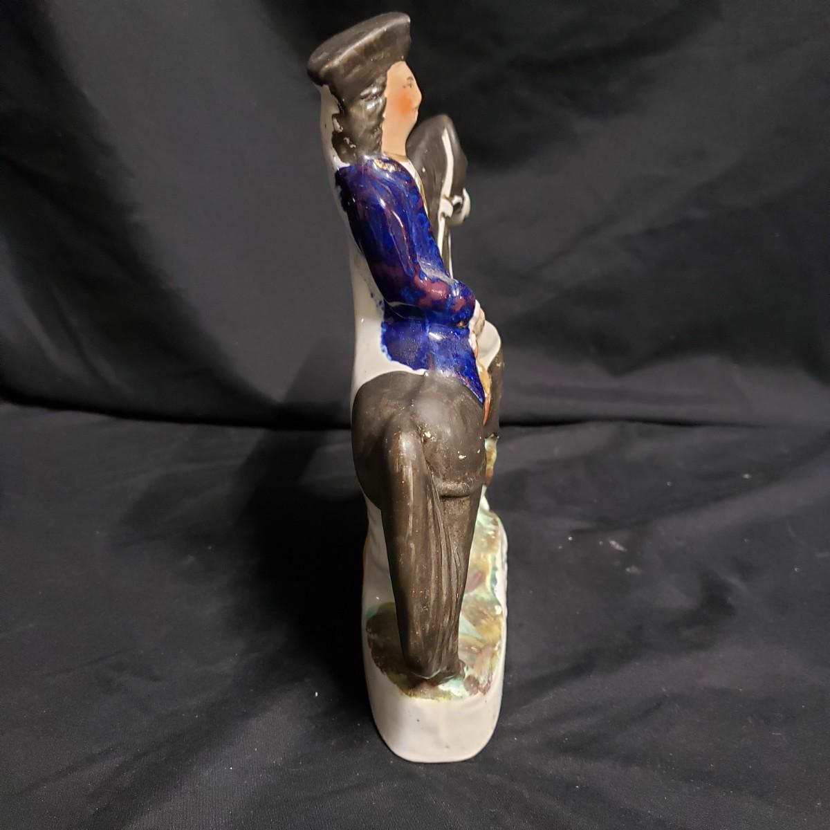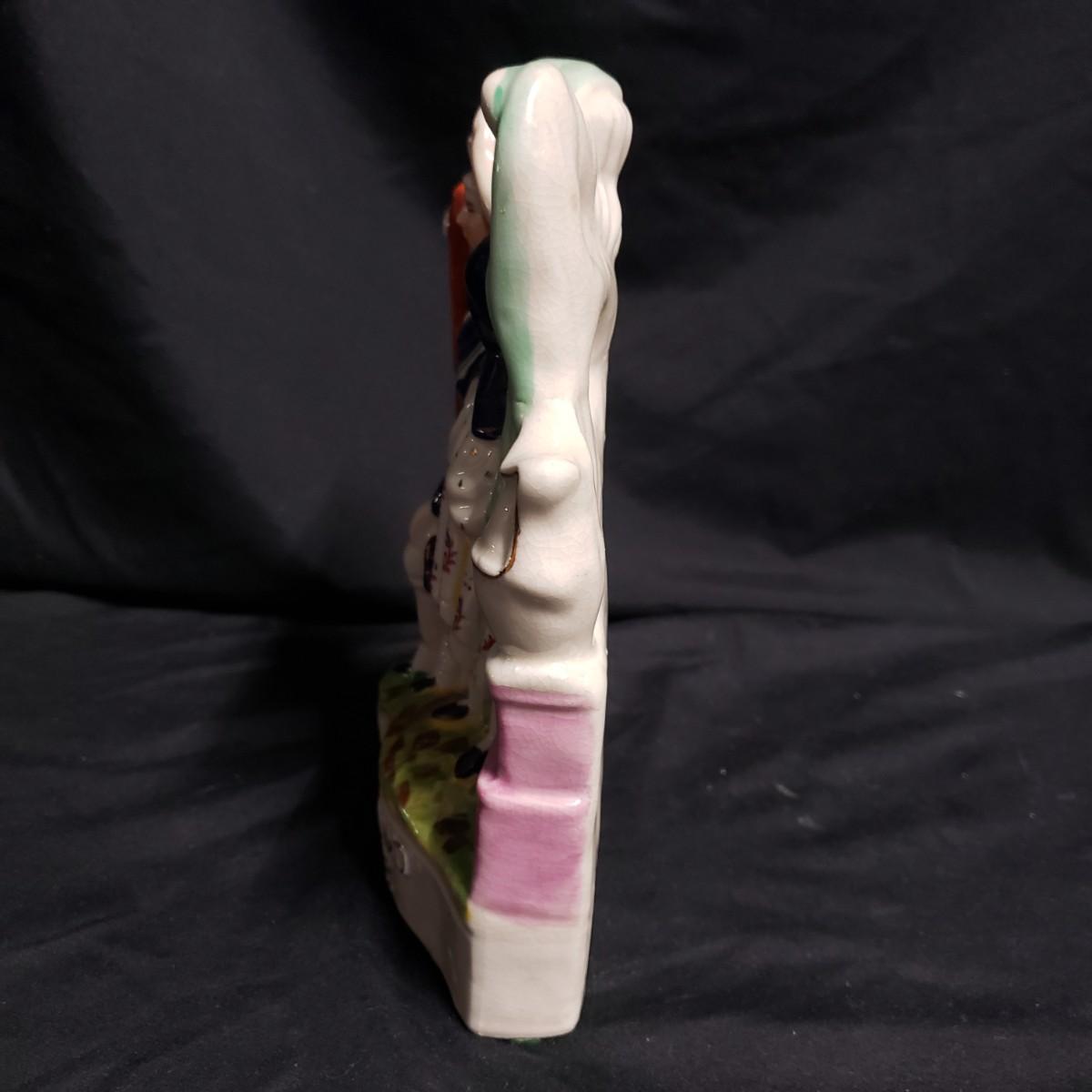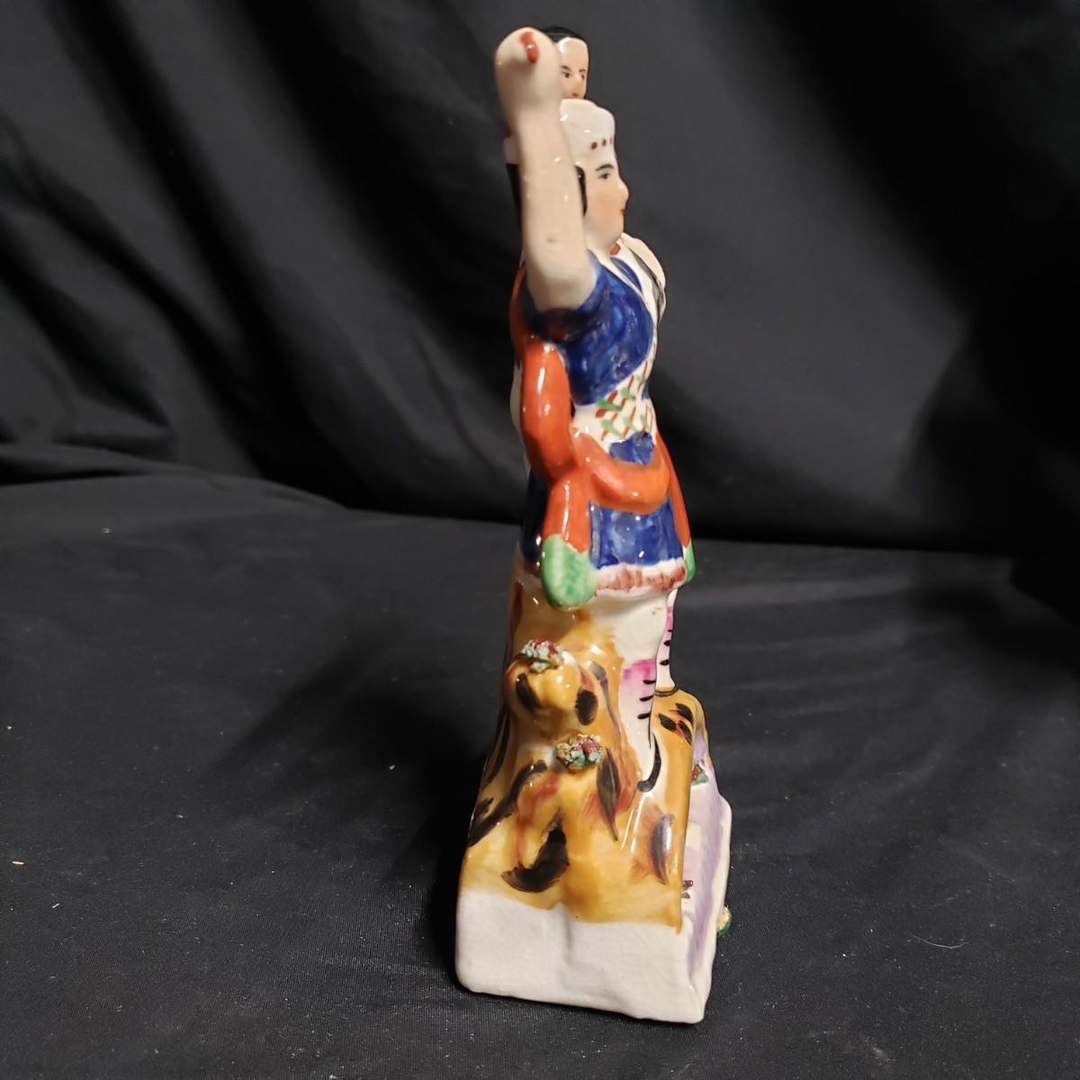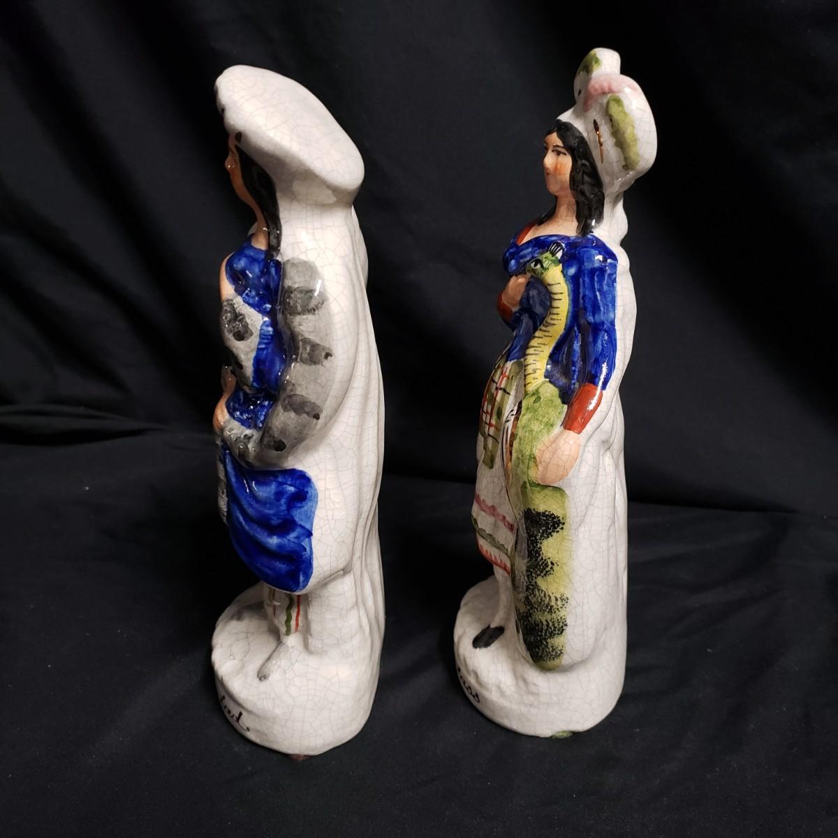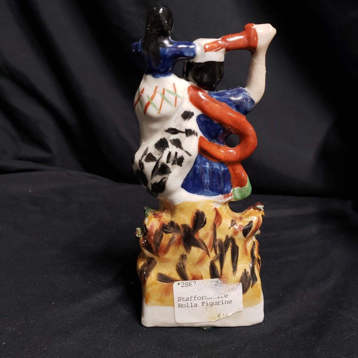 This six piece, possibly Staffordshire figurines feature Highland Lad and Lass, Highland Jessie, Rolla Circus Strong Man, Dick Turpin and a man and his parrot. The Highland figurines measure approximately 4" x 2" x 8"H. Unfortunately, the parrot wanted to fly off and broke off the man's shoulder. The circus strong man holding a woman is missing an arm and leg, yet the show must go on!