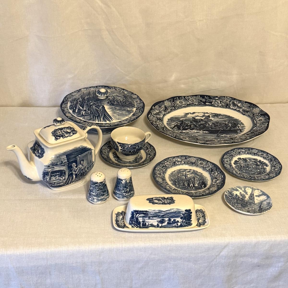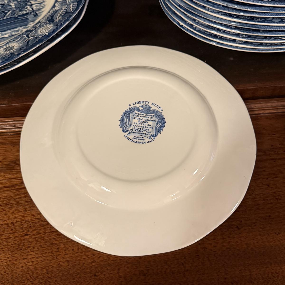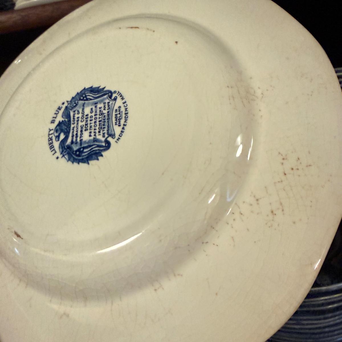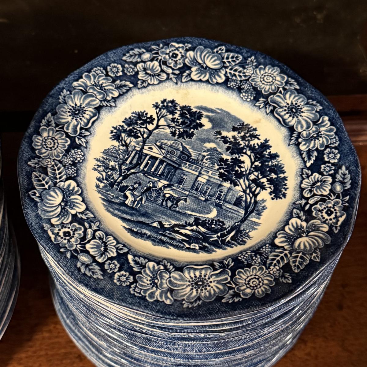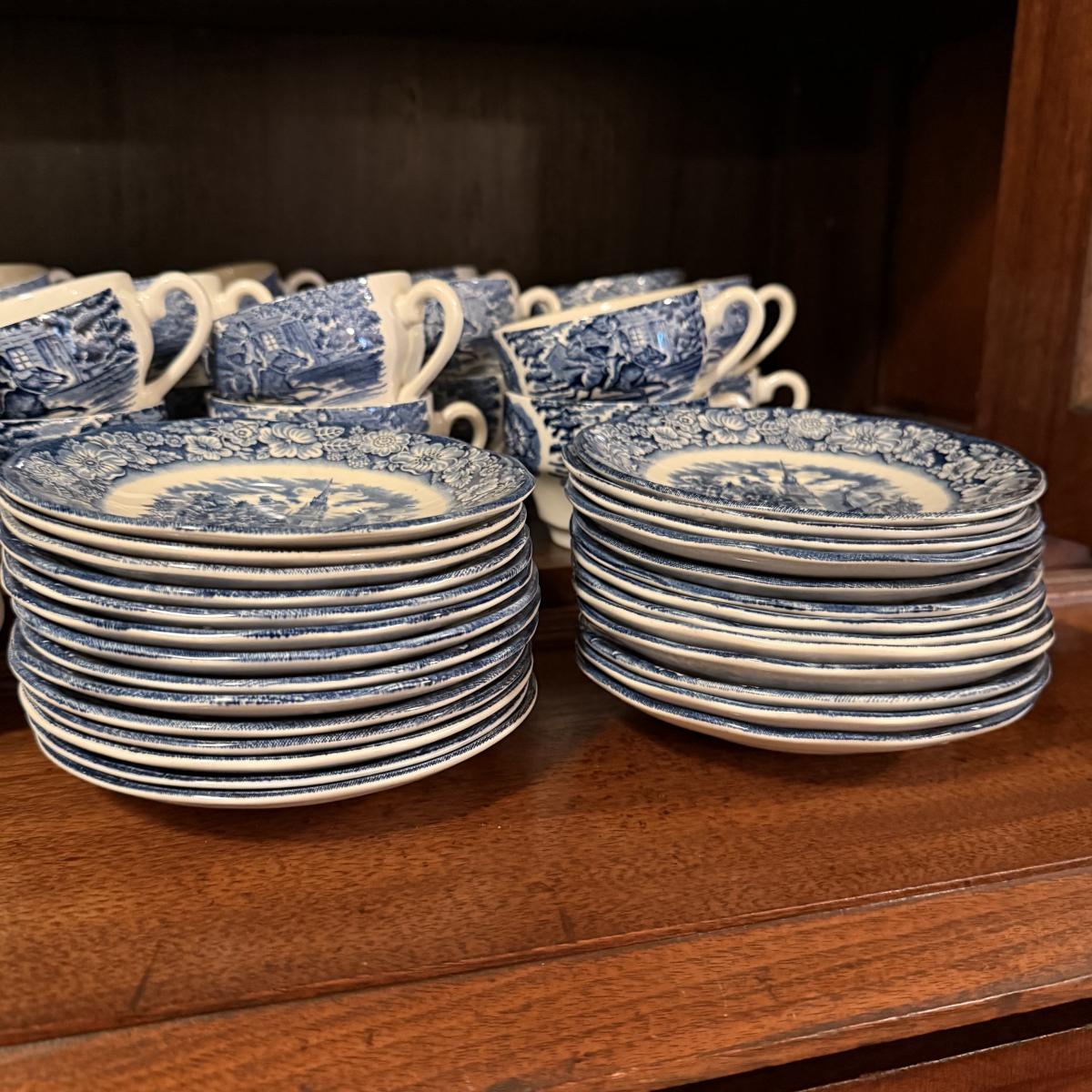 200+ pieces of Staffordshire ironstone dishes in their Liberty Blue pattern. this large collection includes five sizes of plates (4”, 6”, 7”, 9”, 10”), plus multiple bowls, cups, saucers, serving plates, salt and pepper shakers, and more. Please see photos for inventory. All dishes were not thoroughly inspected, but only two chips were noticed.