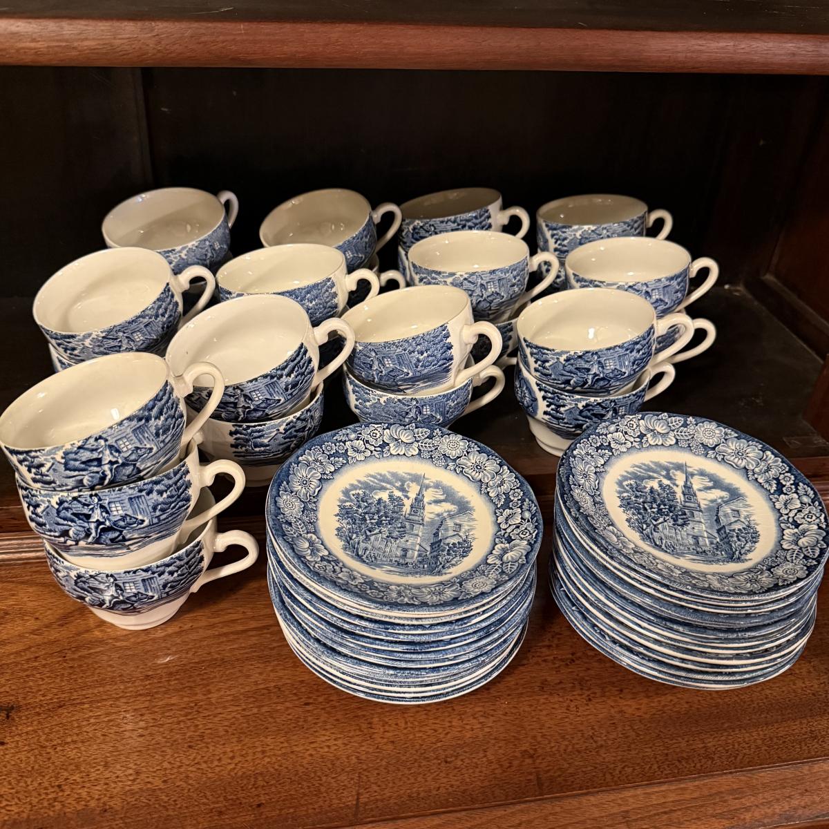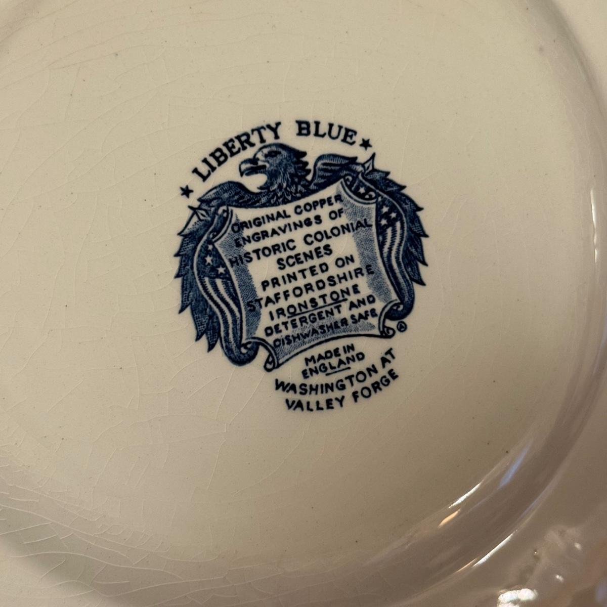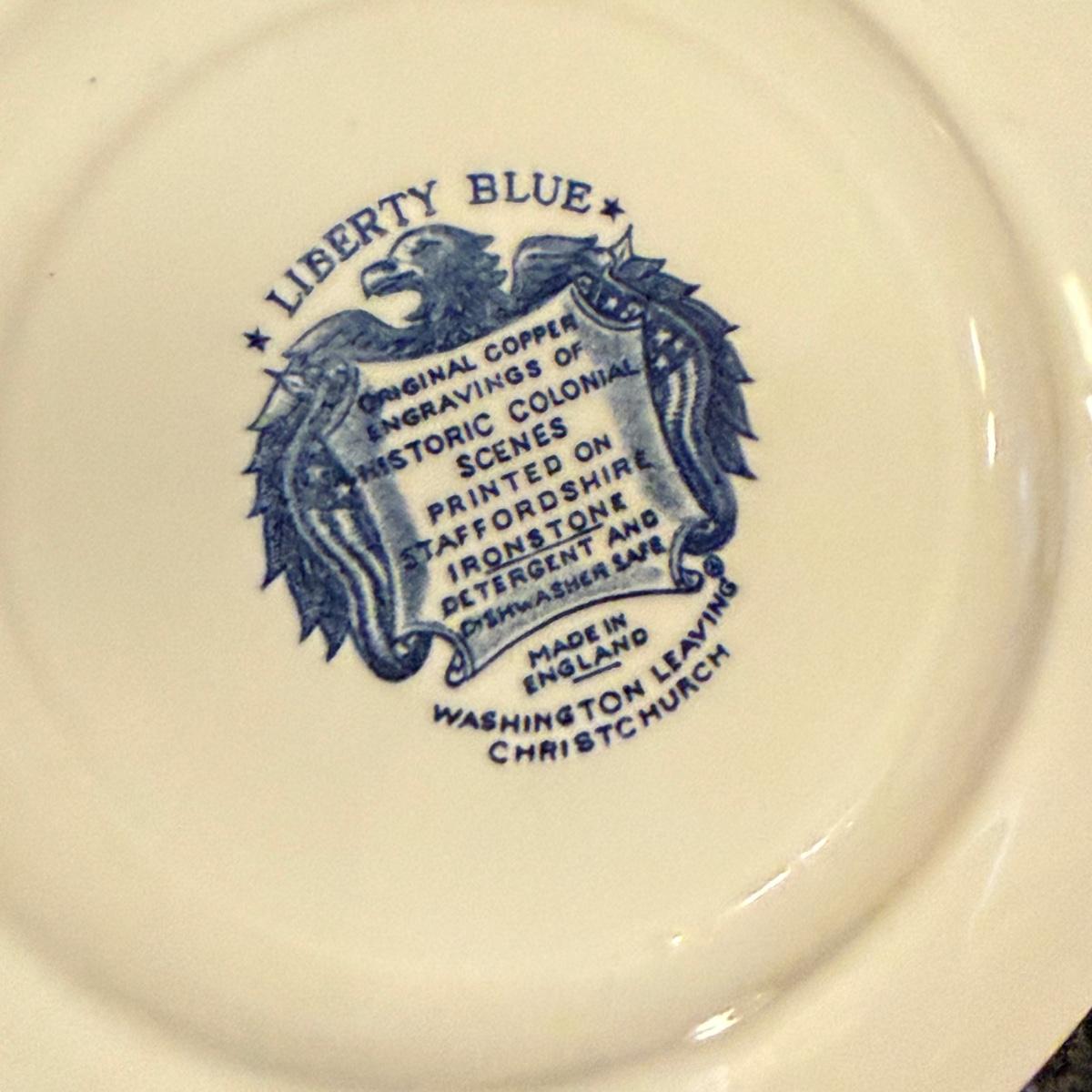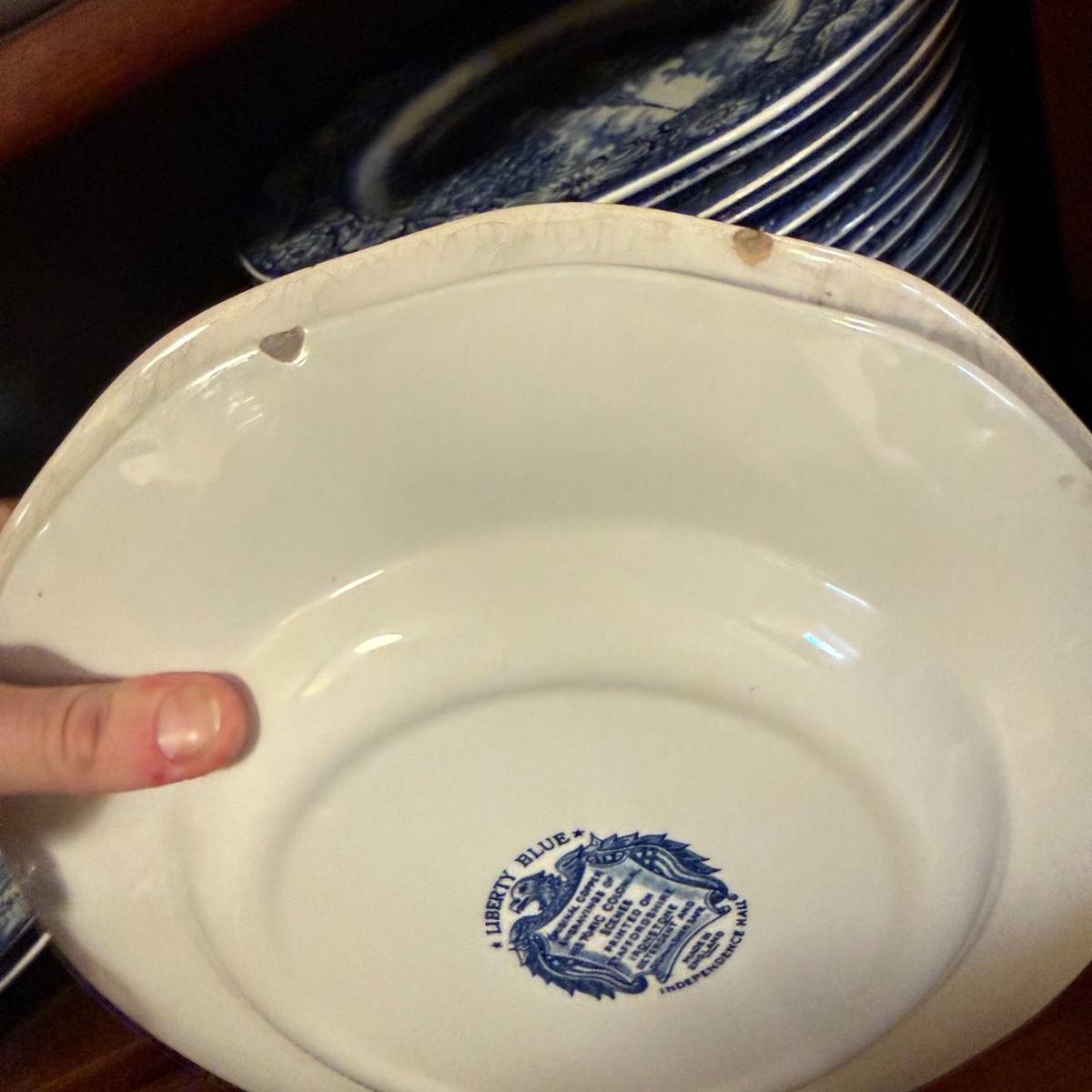 200+ pieces of Staffordshire ironstone dishes in their Liberty Blue pattern. this large collection includes five sizes of plates (4”, 6”, 7”, 9”, 10”), plus multiple bowls, cups, saucers, serving plates, salt and pepper shakers, and more. Please see photos for inventory. All dishes were not thoroughly inspected, but only two chips were noticed.