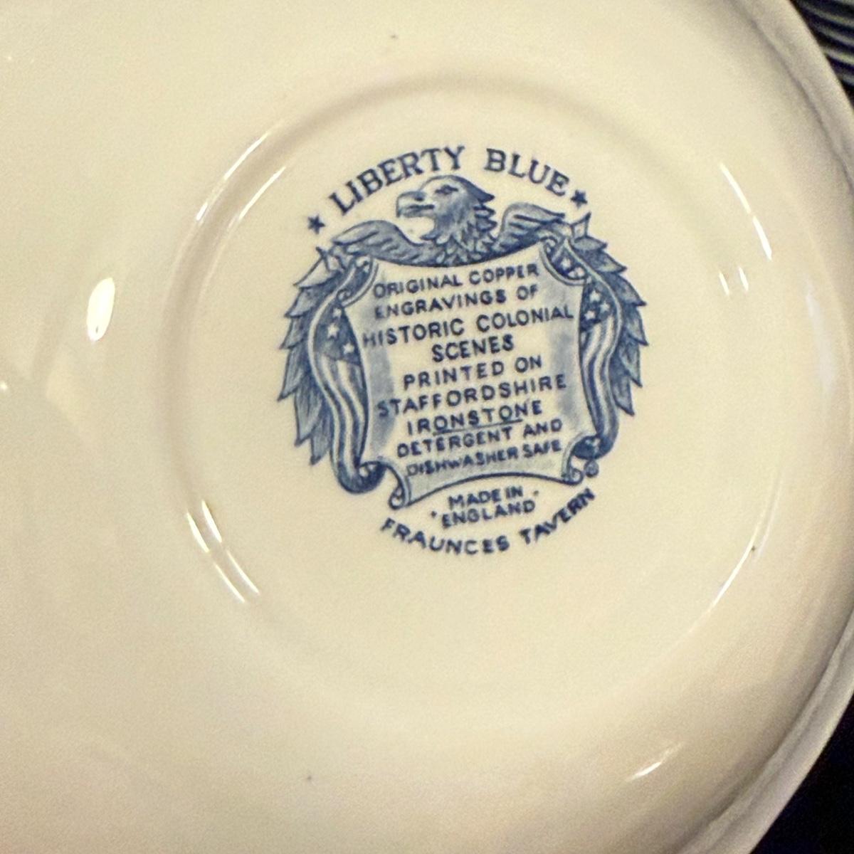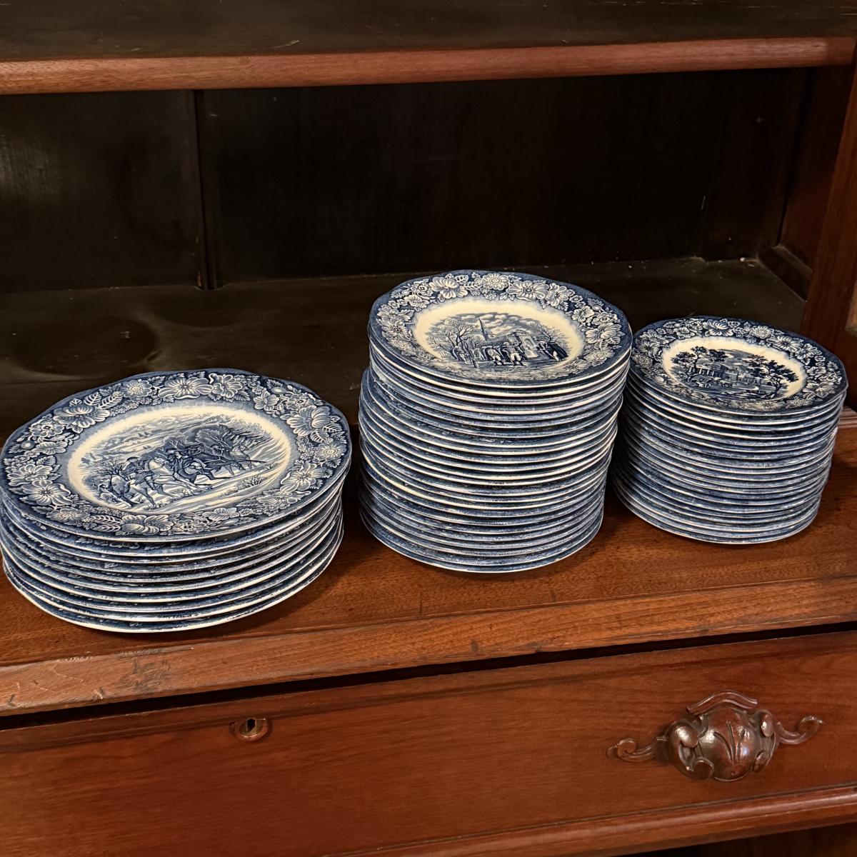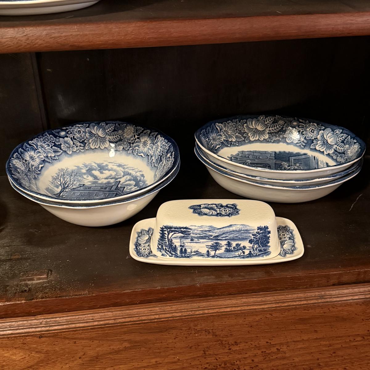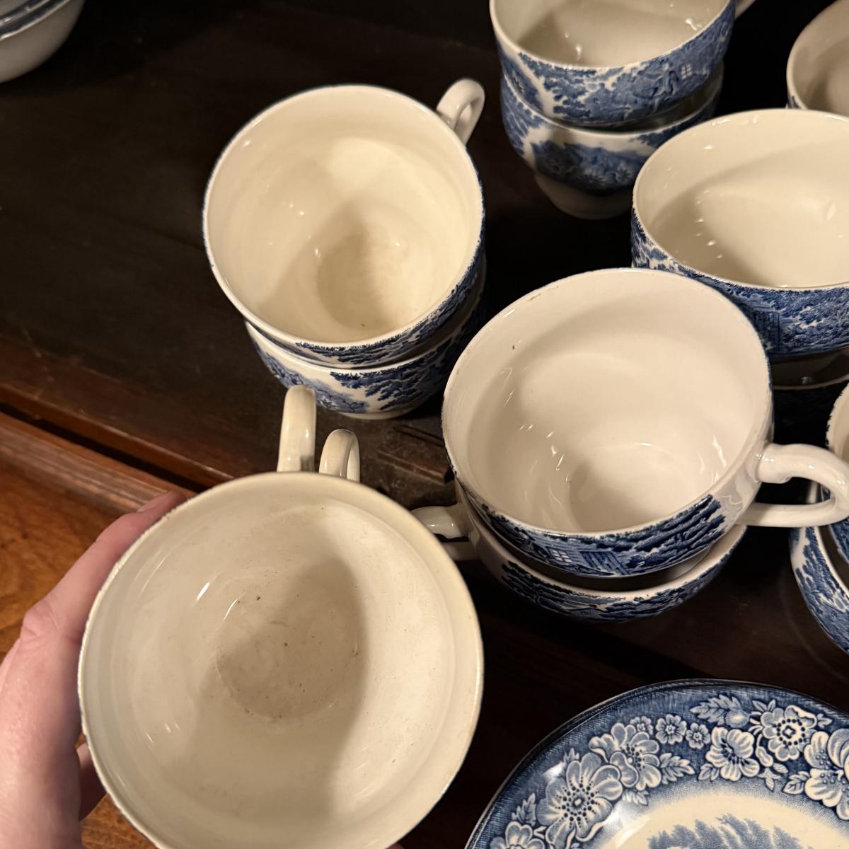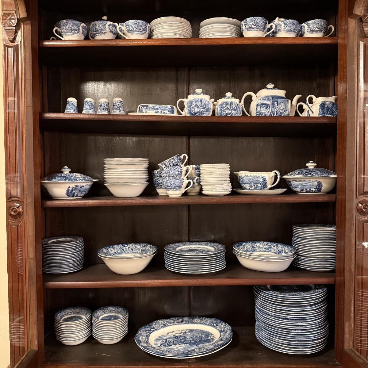 200+ pieces of Staffordshire ironstone dishes in their Liberty Blue pattern. this large collection includes five sizes of plates (4”, 6”, 7”, 9”, 10”), plus multiple bowls, cups, saucers, serving plates, salt and pepper shakers, and more. Please see photos for inventory. All dishes were not thoroughly inspected, but only two chips were noticed.