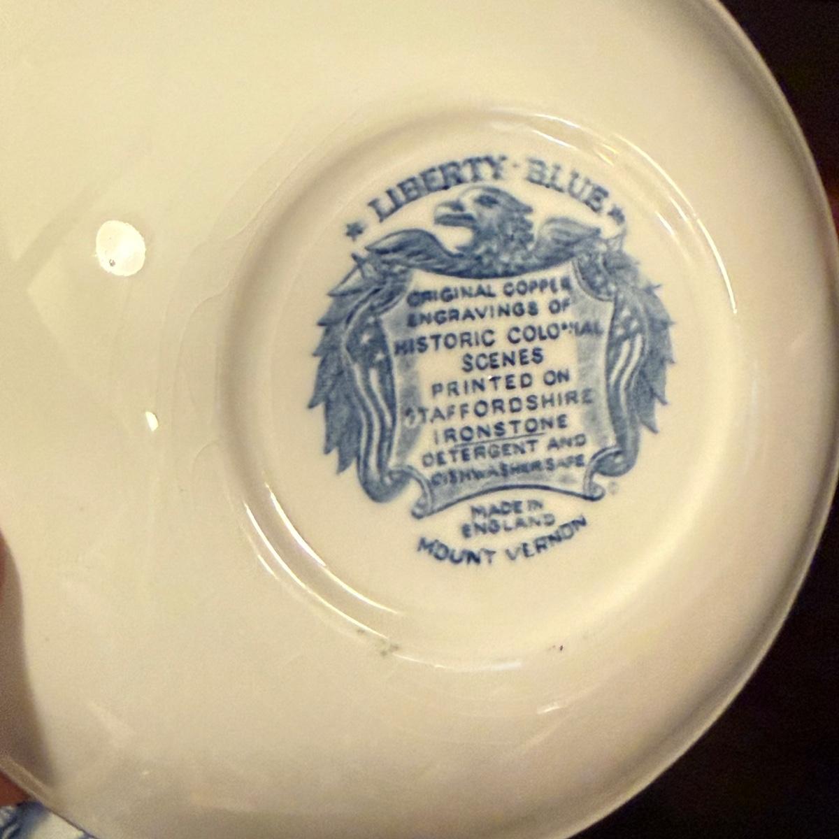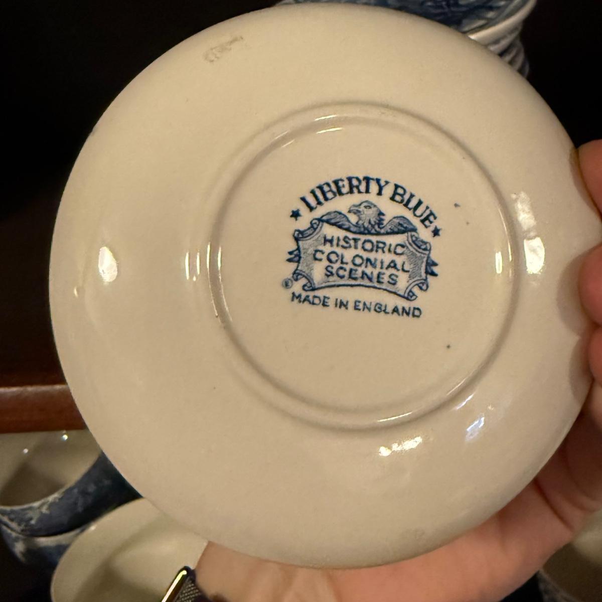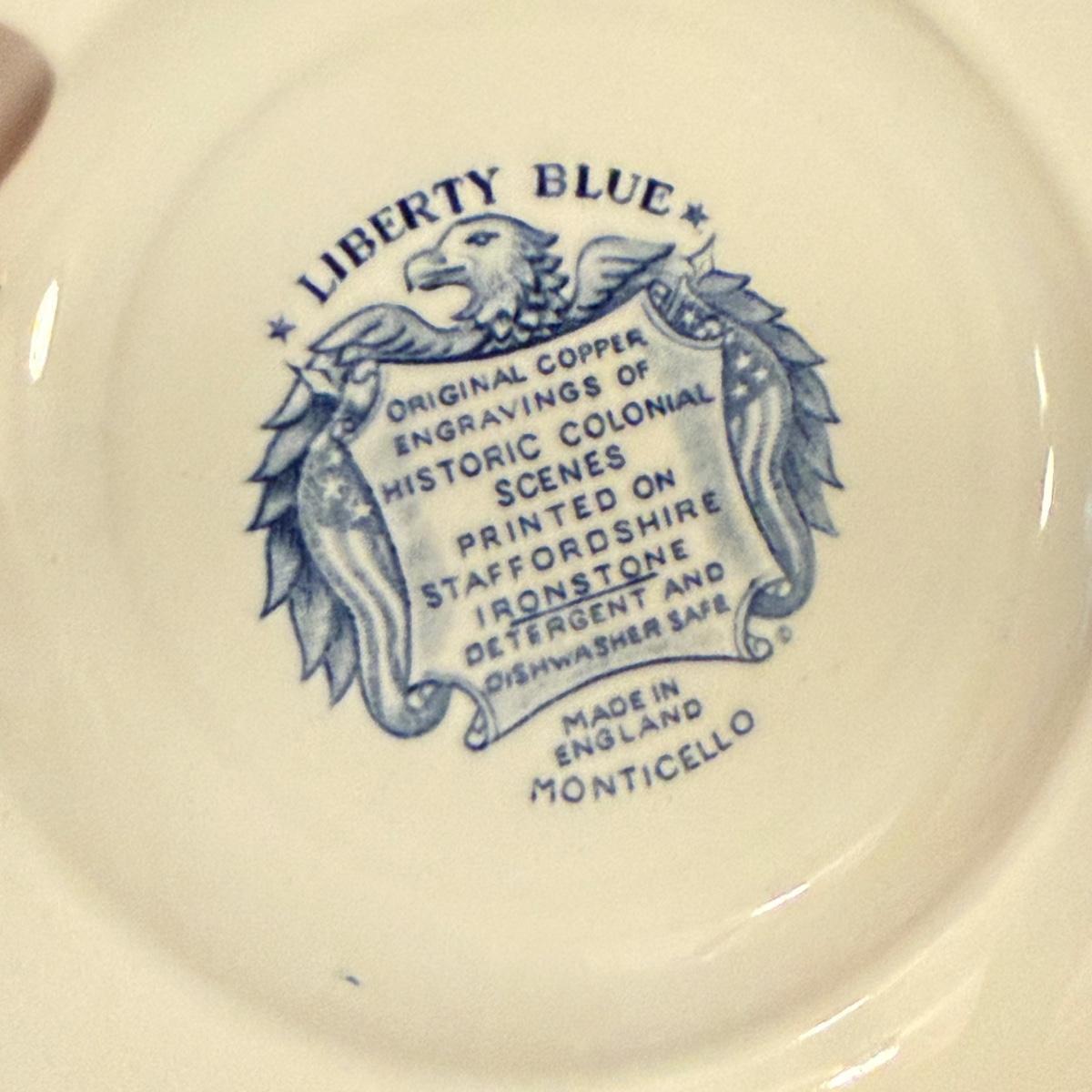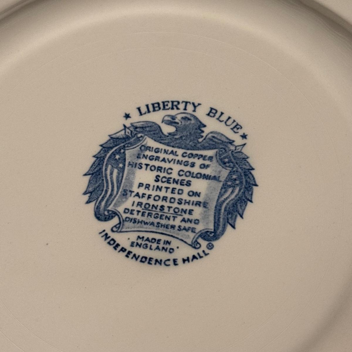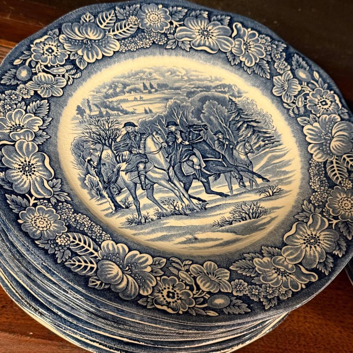 200+ pieces of Staffordshire ironstone dishes in their Liberty Blue pattern. this large collection includes five sizes of plates (4”, 6”, 7”, 9”, 10”), plus multiple bowls, cups, saucers, serving plates, salt and pepper shakers, and more. Please see photos for inventory. All dishes were not thoroughly inspected, but only two chips were noticed.