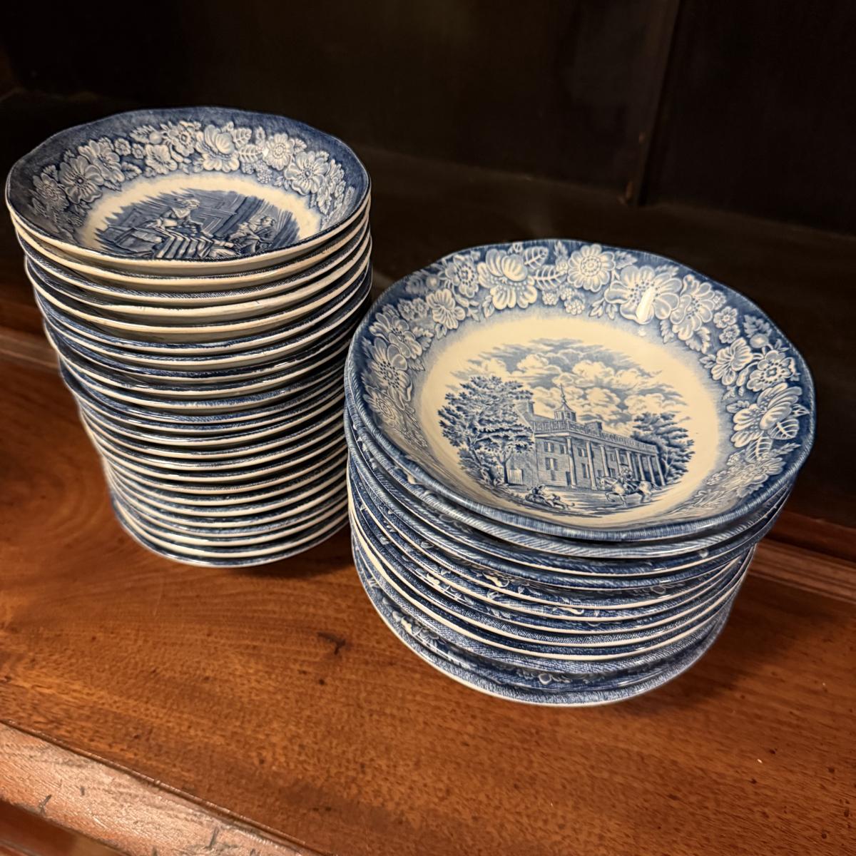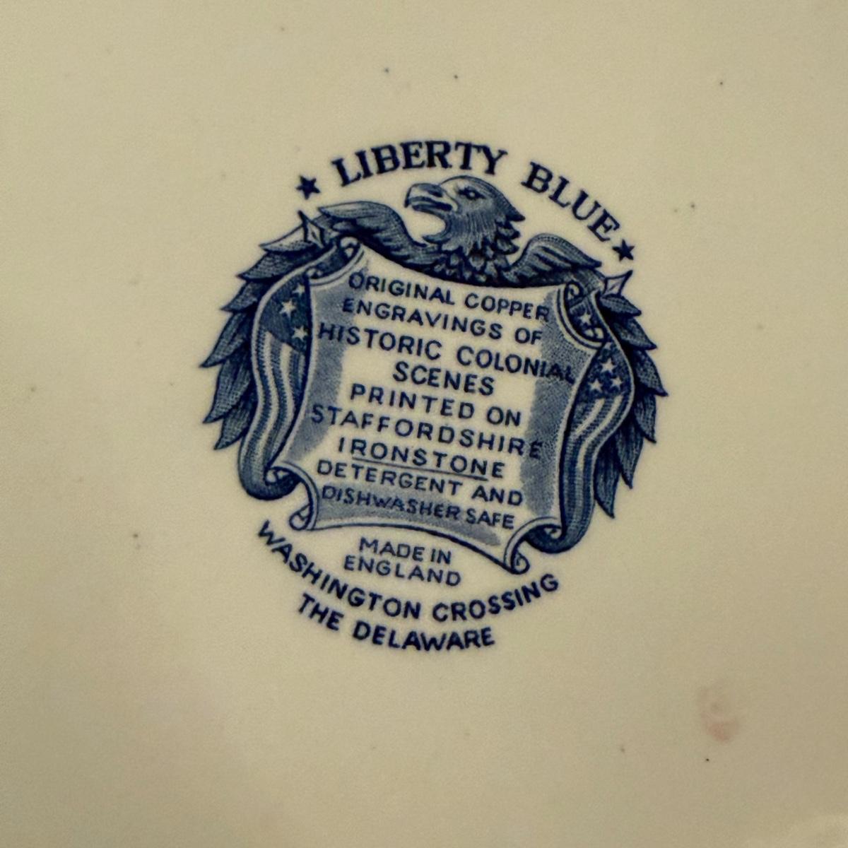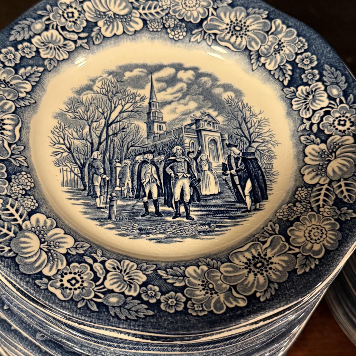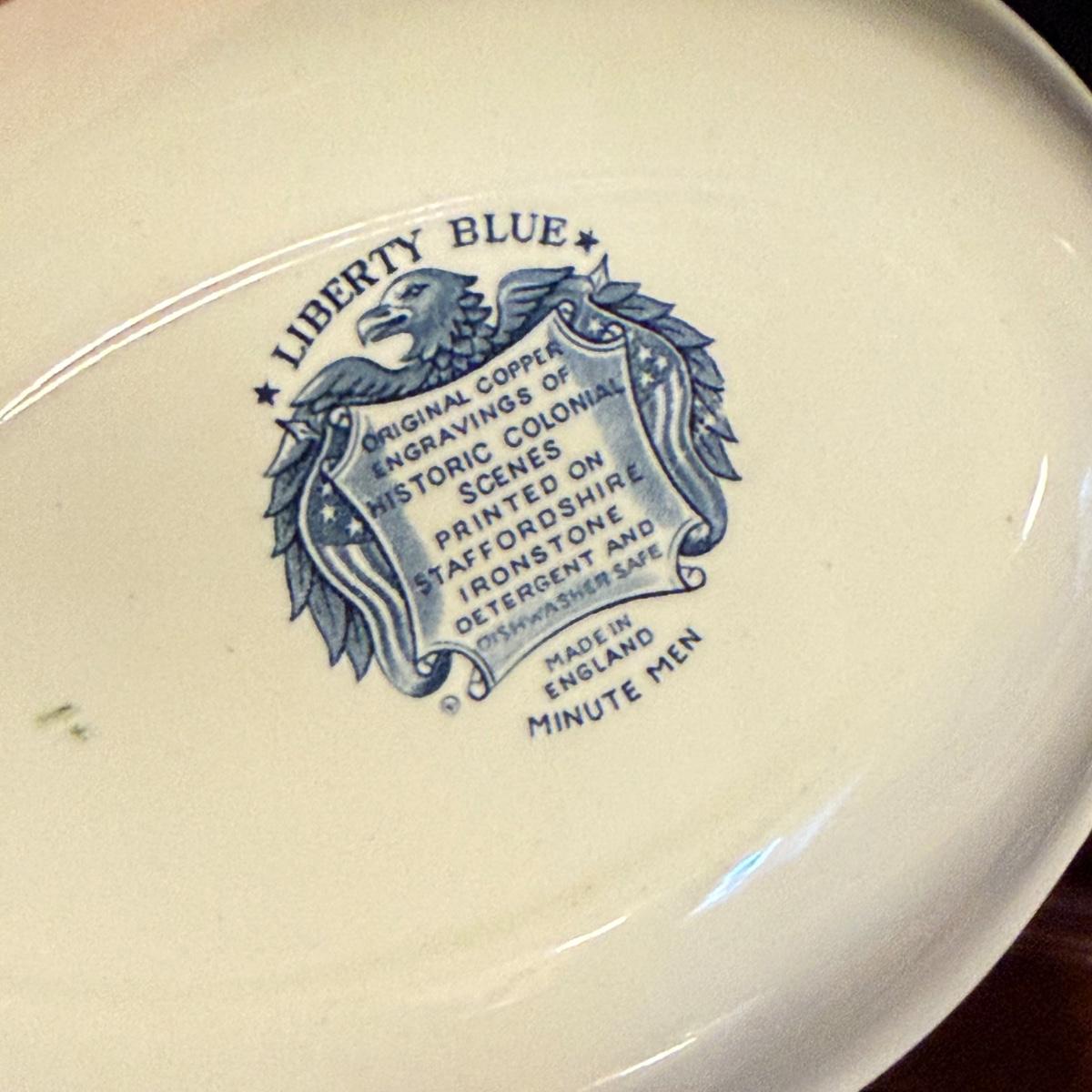 200+ pieces of Staffordshire ironstone dishes in their Liberty Blue pattern. this large collection includes five sizes of plates (4”, 6”, 7”, 9”, 10”), plus multiple bowls, cups, saucers, serving plates, salt and pepper shakers, and more. Please see photos for inventory. All dishes were not thoroughly inspected, but only two chips were noticed.