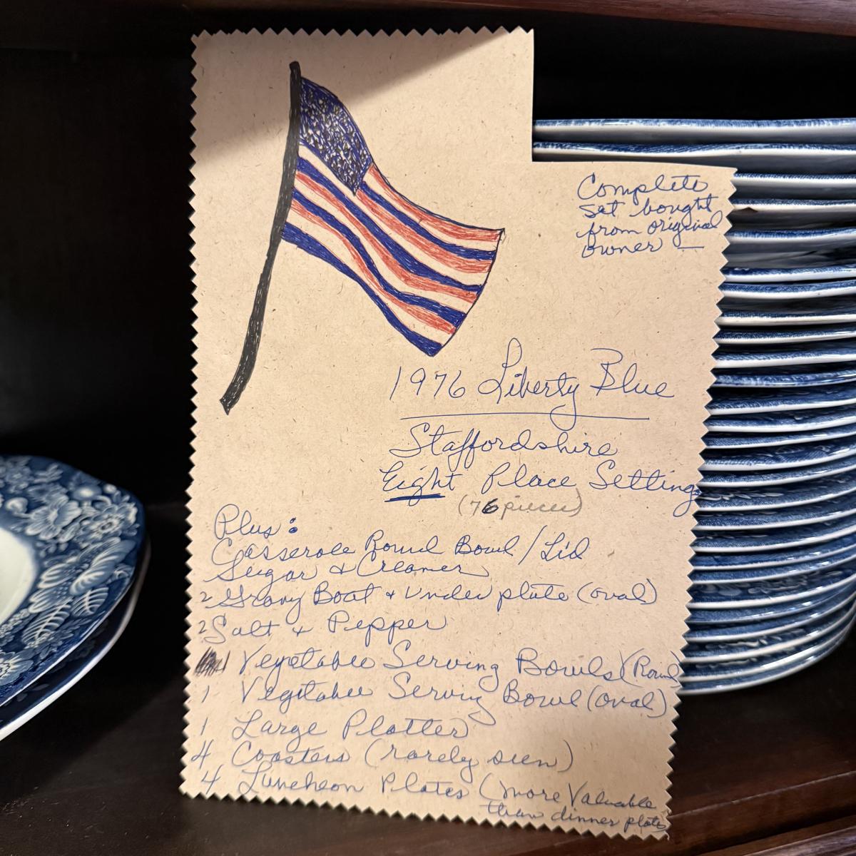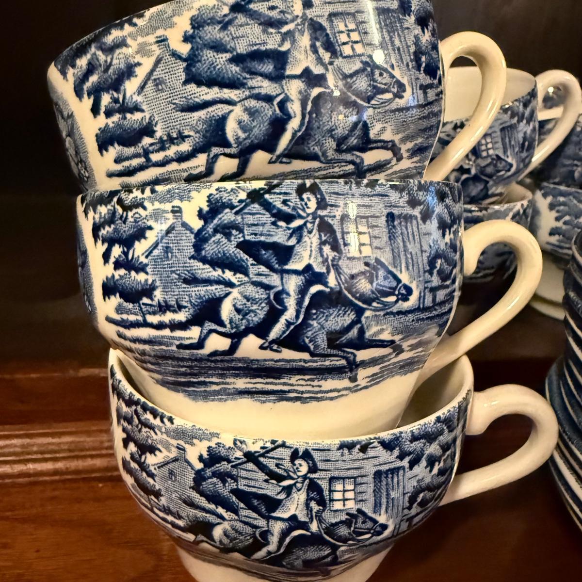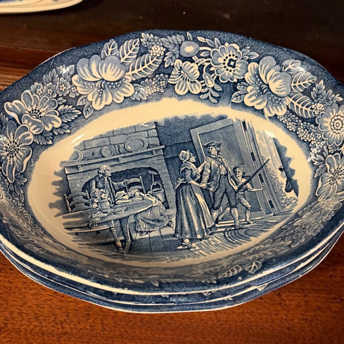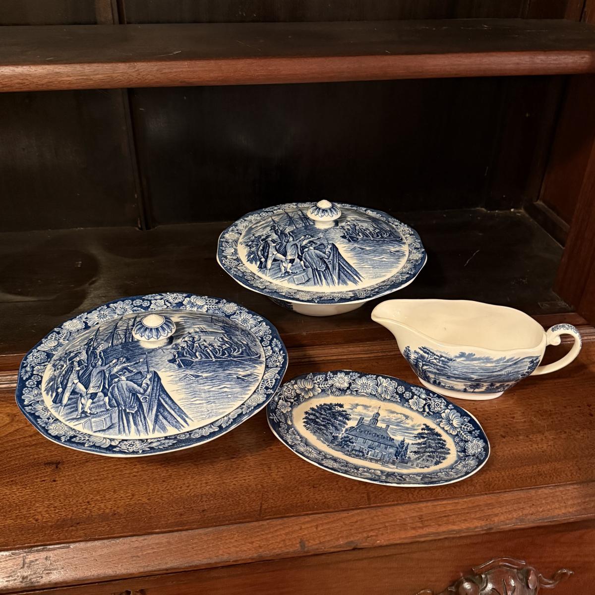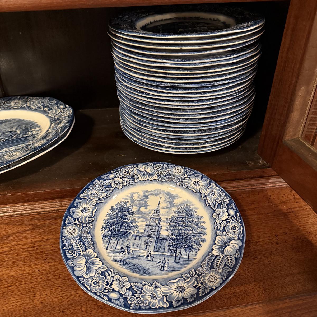 200+ pieces of Staffordshire ironstone dishes in their Liberty Blue pattern. this large collection includes five sizes of plates (4”, 6”, 7”, 9”, 10”), plus multiple bowls, cups, saucers, serving plates, salt and pepper shakers, and more. Please see photos for inventory. All dishes were not thoroughly inspected, but only two chips were noticed.