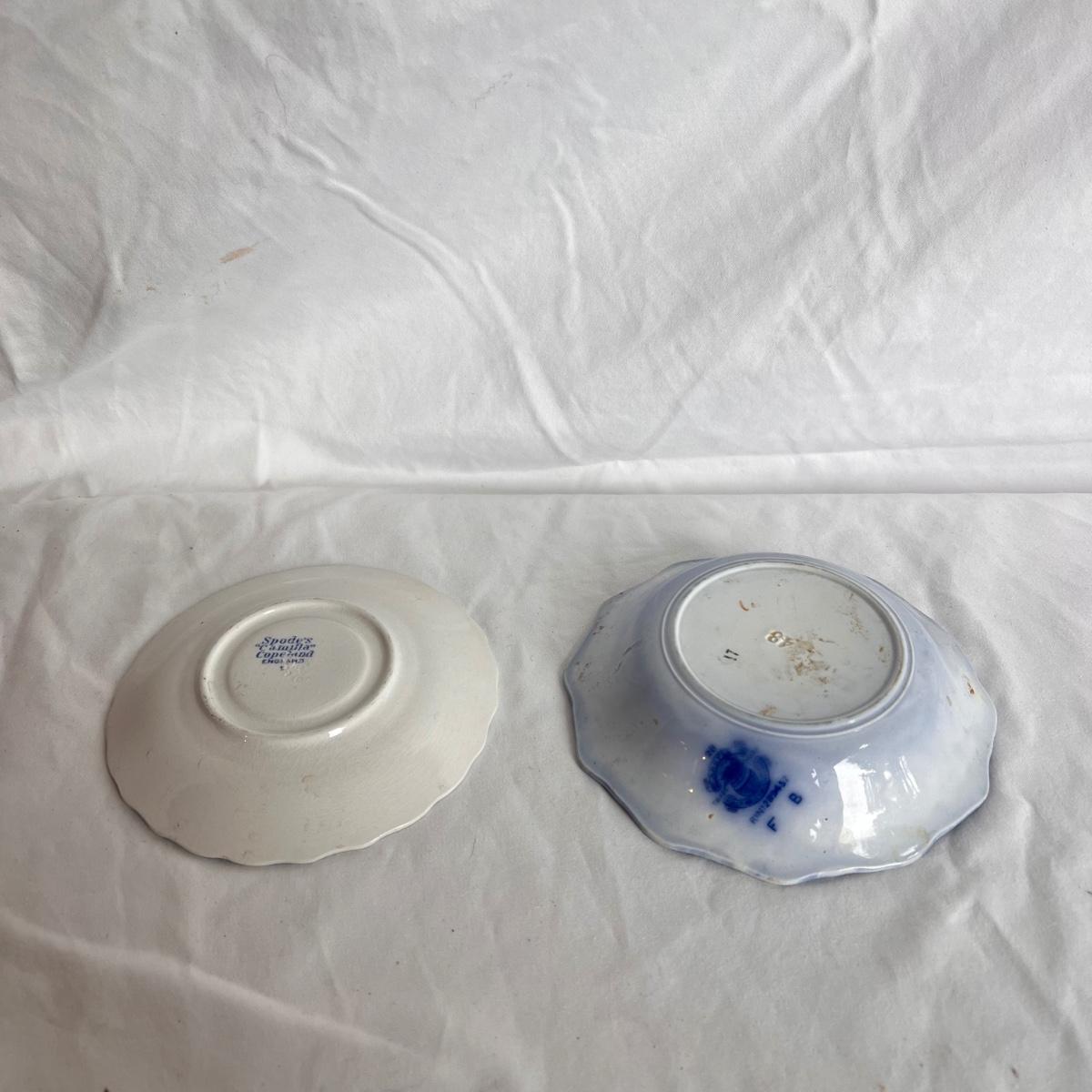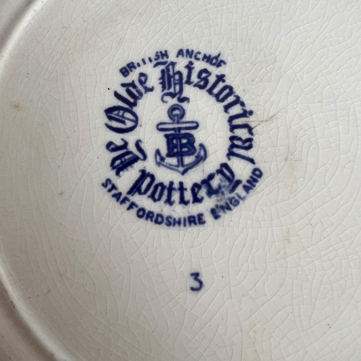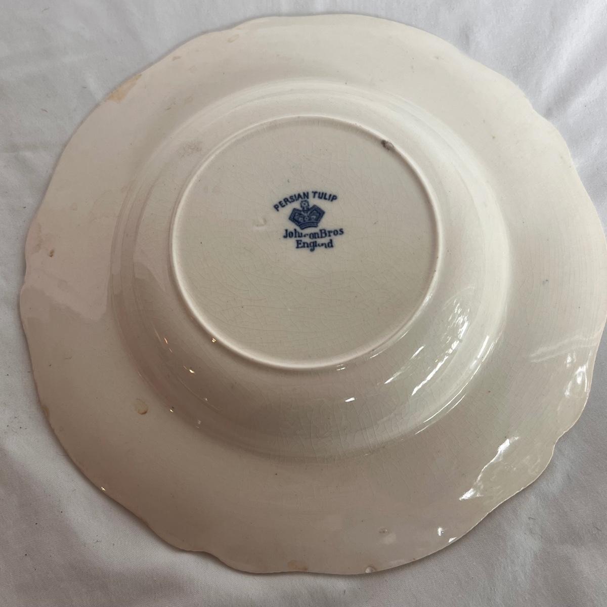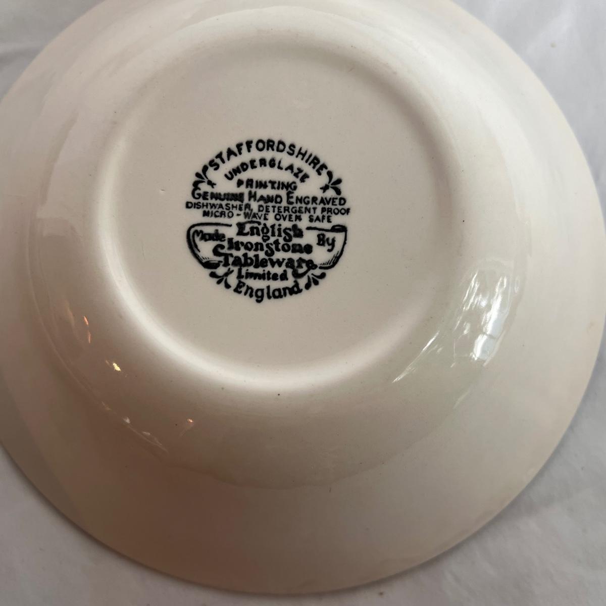 This lot includes two Takahashi small dishes, four Staffordshire bowls, one Asahi plate, two Copeland England dishes, one hanging plate by Royal Crownford, one Grindley plate, one Johnson Bros Persian Tulip plate, one Olde Historical Pottery plate, and a few other dishes that are not stamped or have illegible stamps. The largest plate measures 10.5” x 1”H and the smallest (Takahashi plates) measure 4.75” x .95”H. There is a small crack in the last bowl pictured and some crazing on a few other pieces - see pictures included. Shipping available.