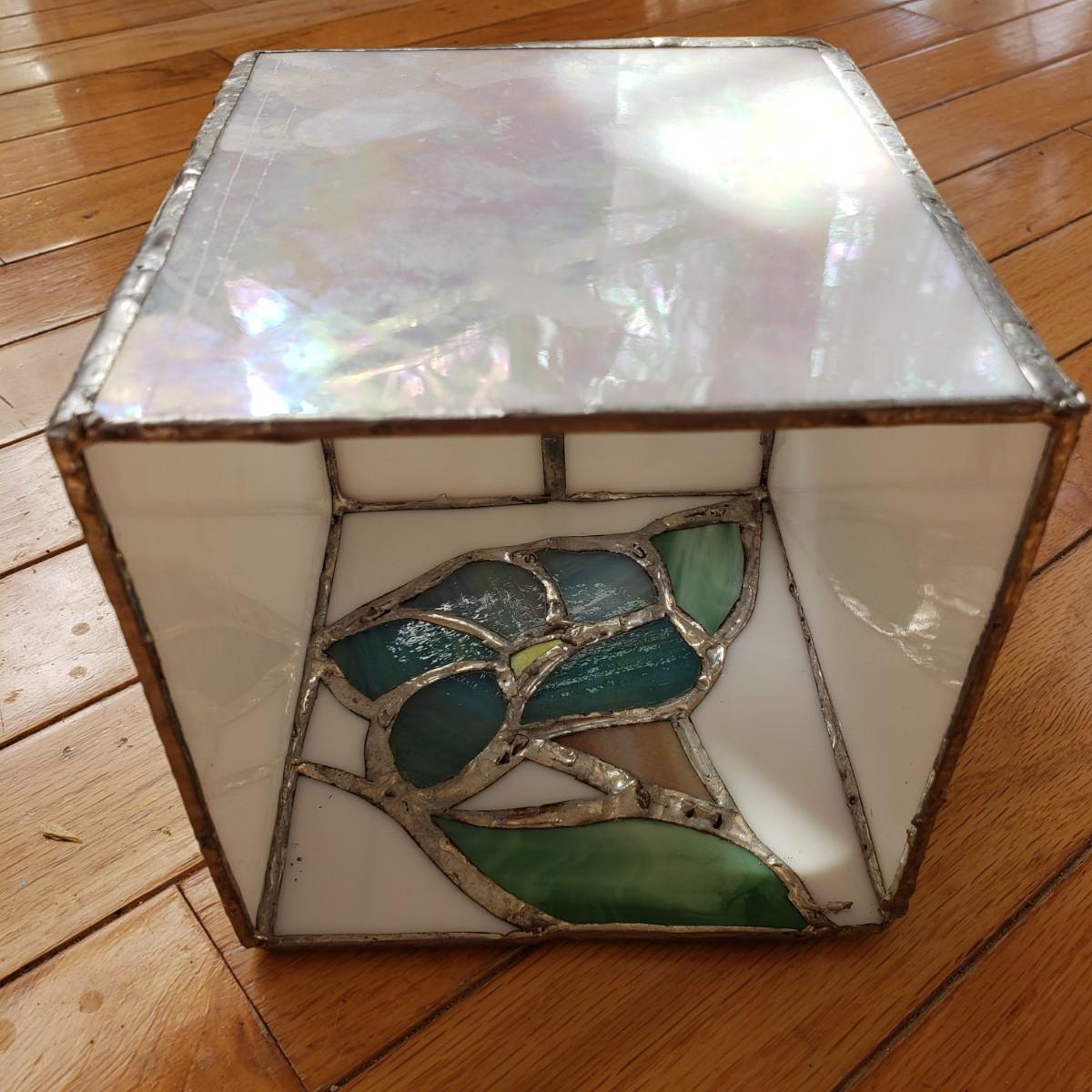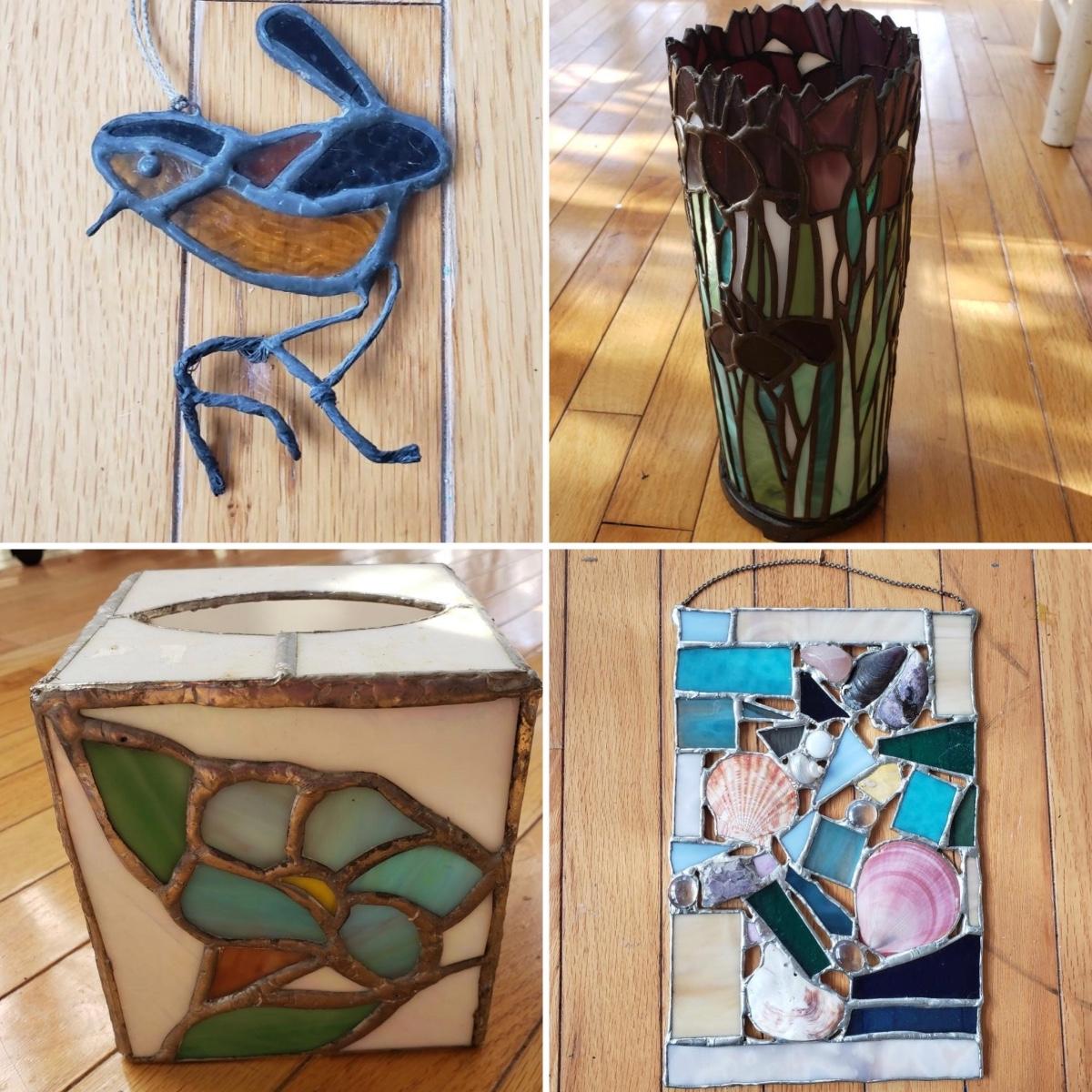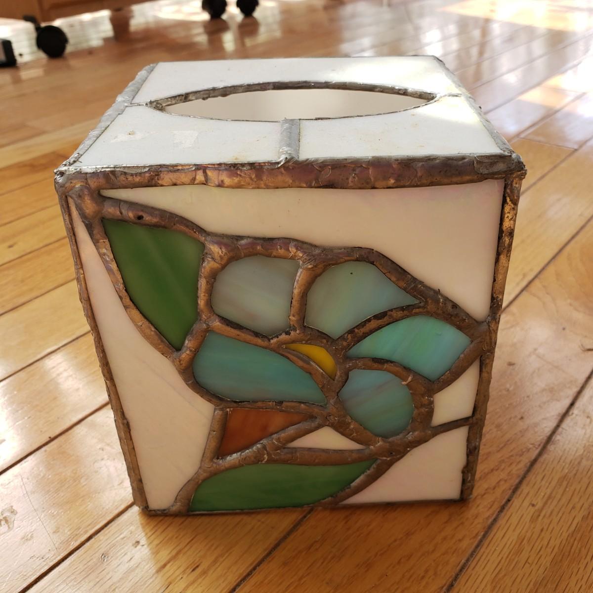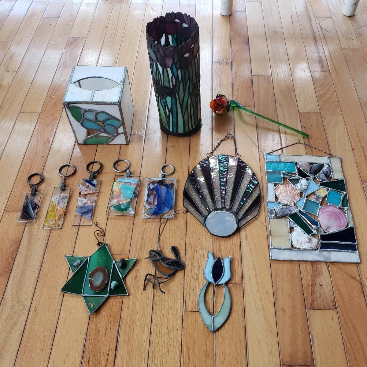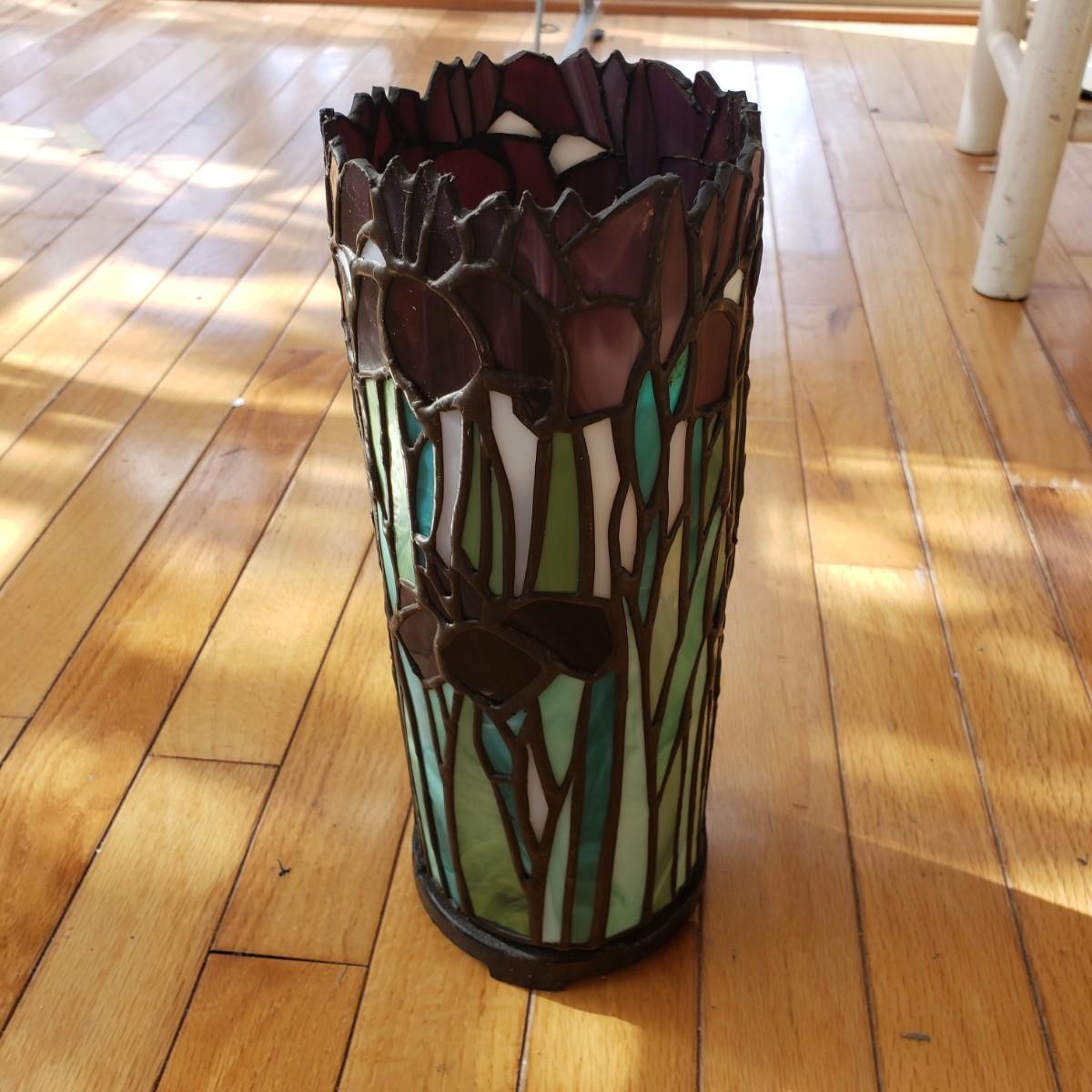 This lot of stained glass and one blown glass flower will brighten any room! The iris candle holder measures 4" x 11"H. The base is cast iron with a hole for a taper candle. The purple and clear piece that's the shape of a shell measures 9" x 7". There is a crack in this piece, but it's hard to tell. The white Kleenex box holder holds a small box. The hand blown flower has reds and yellows on its petals. The very end is chipped.