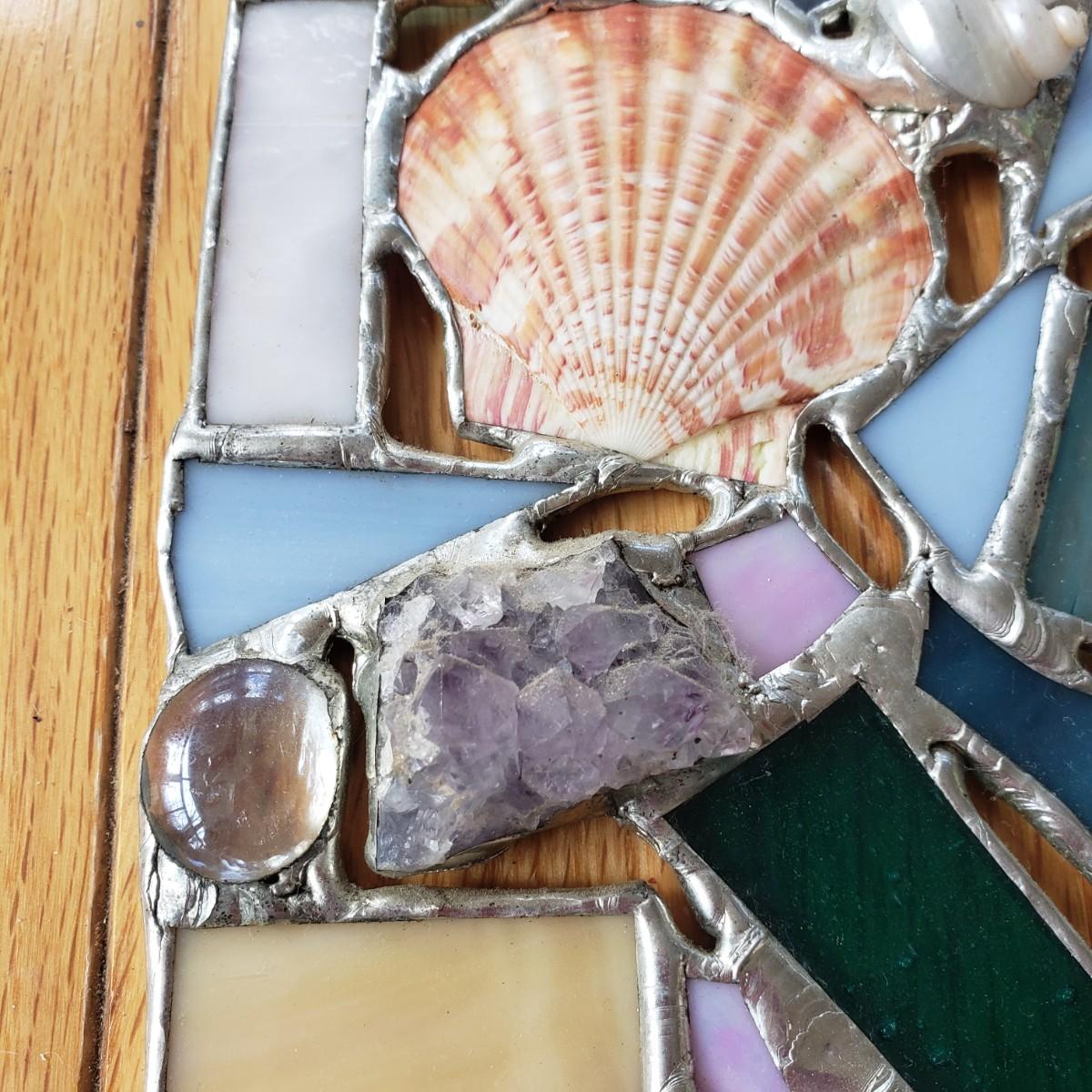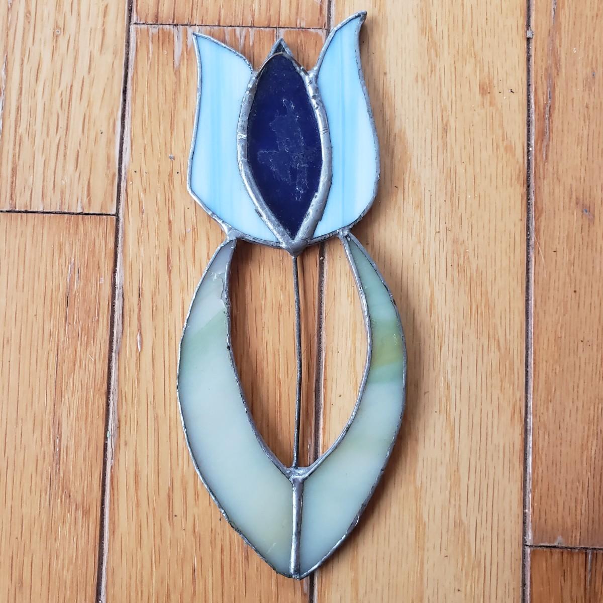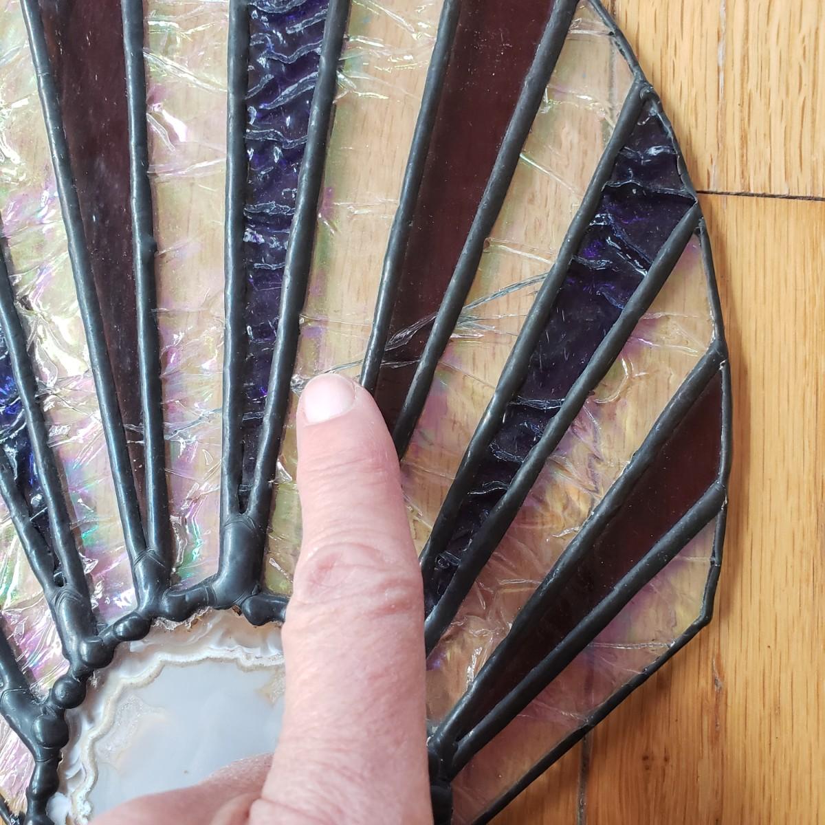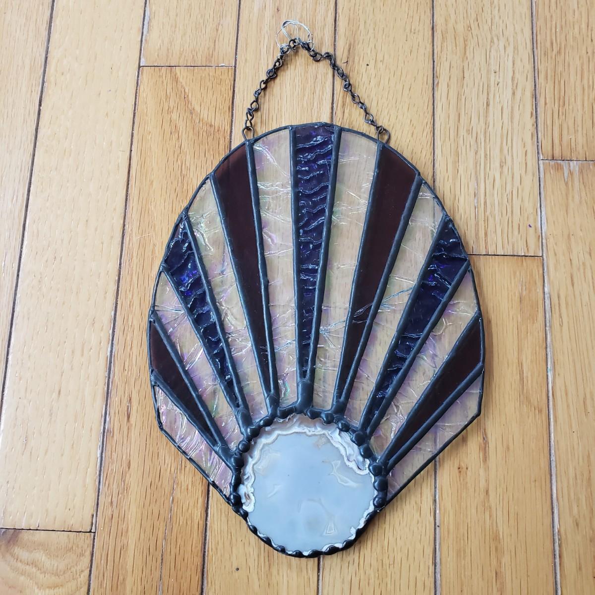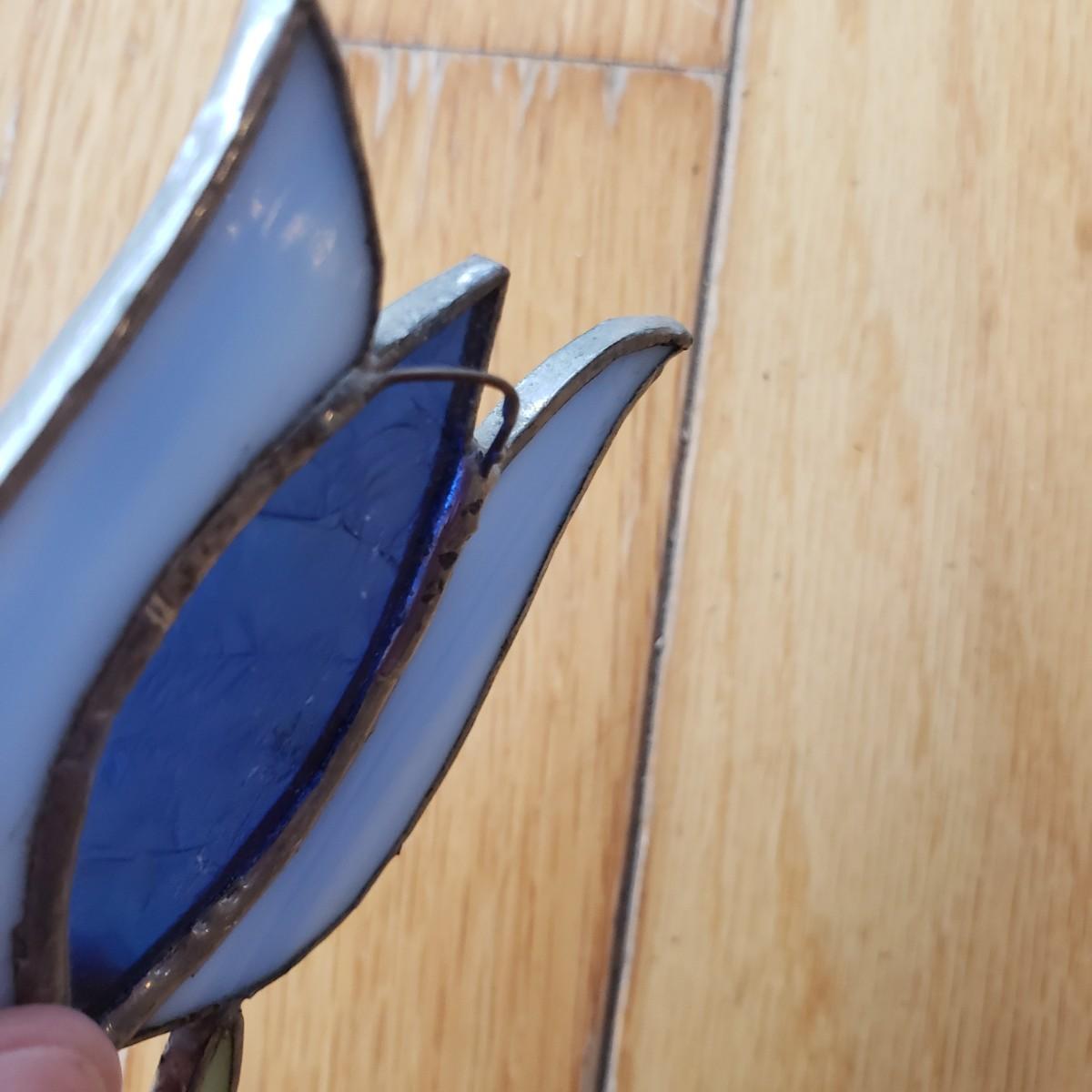 This lot of stained glass and one blown glass flower will brighten any room! The iris candle holder measures 4" x 11"H. The base is cast iron with a hole for a taper candle. The purple and clear piece that's the shape of a shell measures 9" x 7". There is a crack in this piece, but it's hard to tell. The white Kleenex box holder holds a small box. The hand blown flower has reds and yellows on its petals. The very end is chipped.