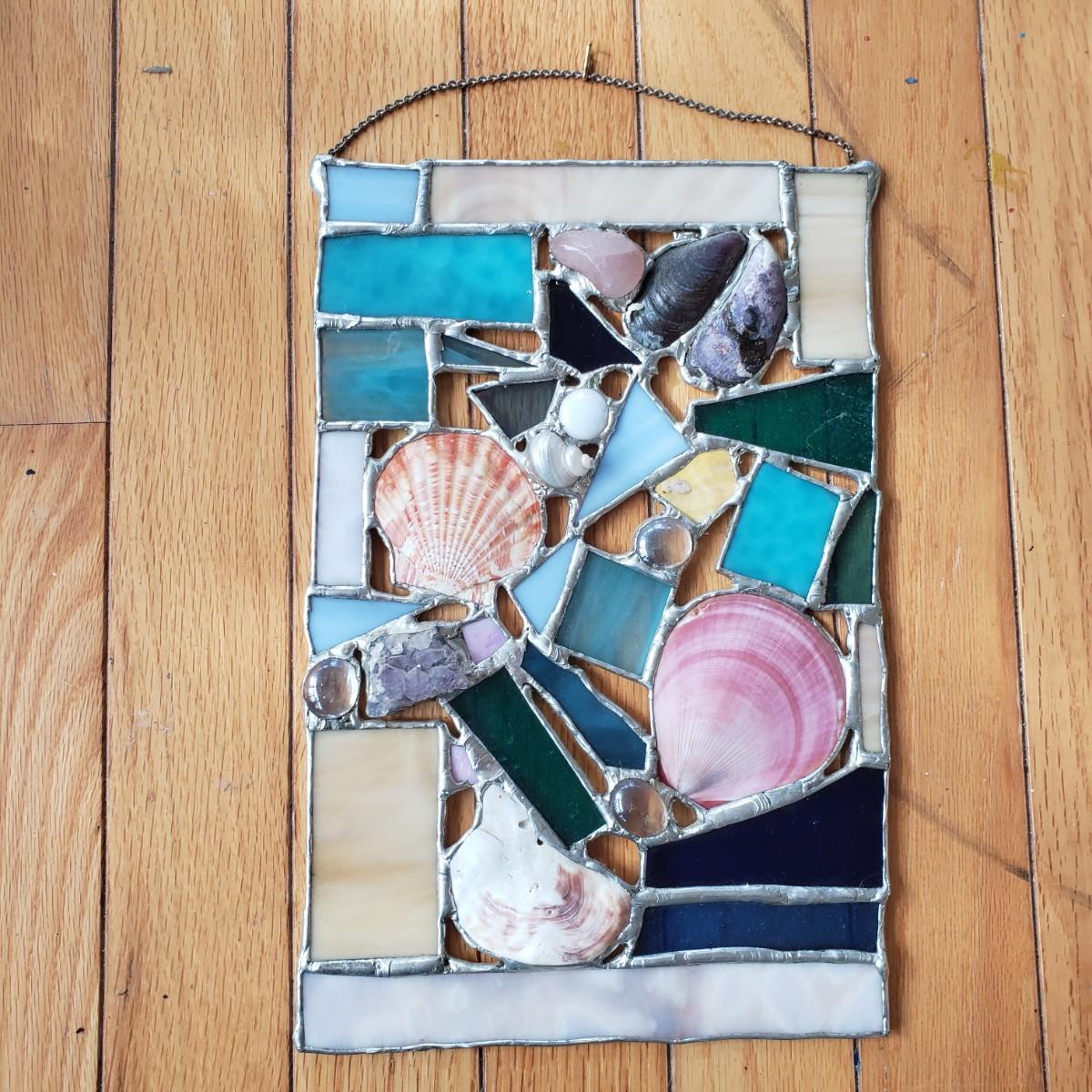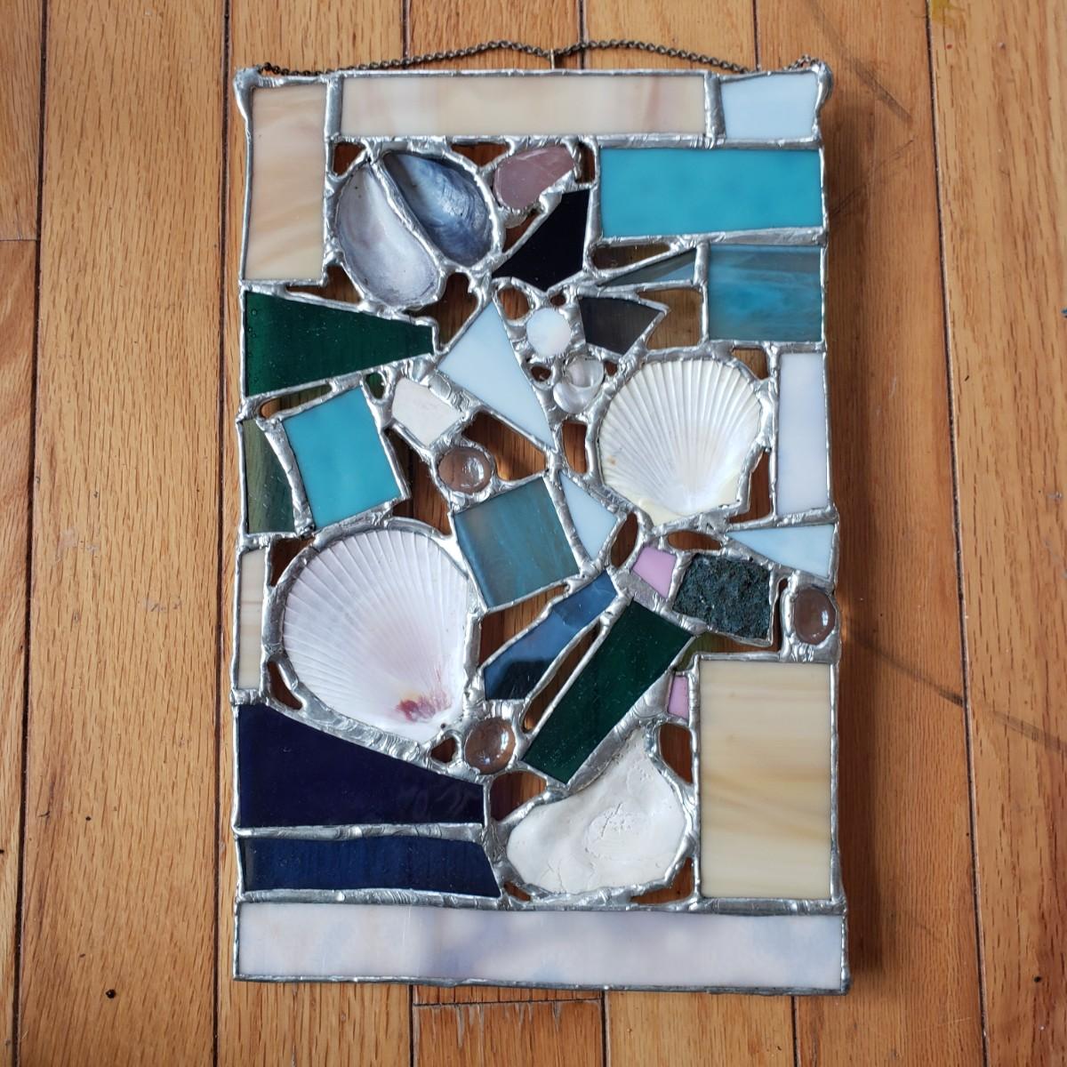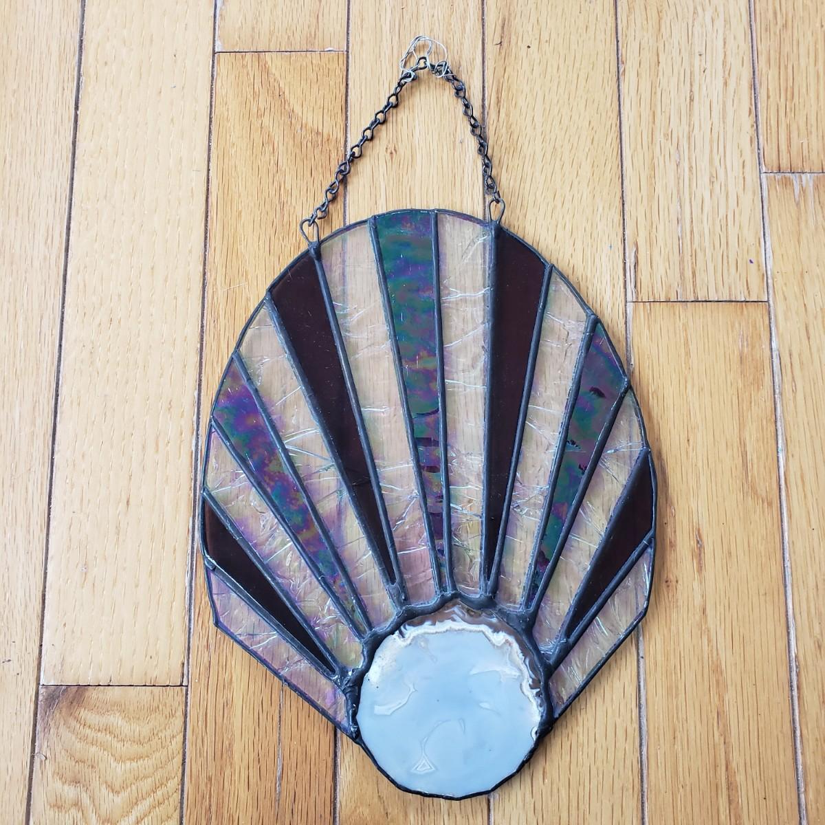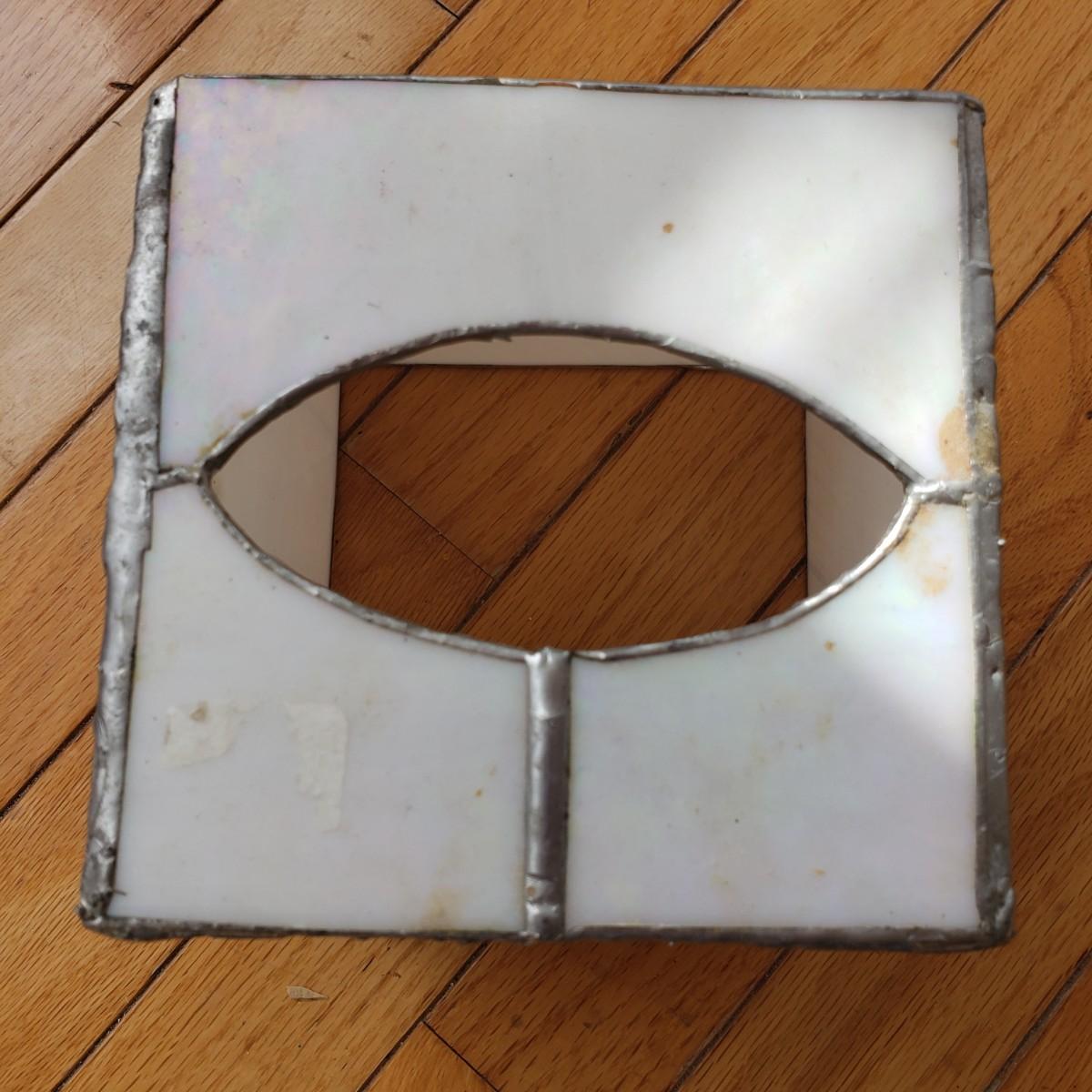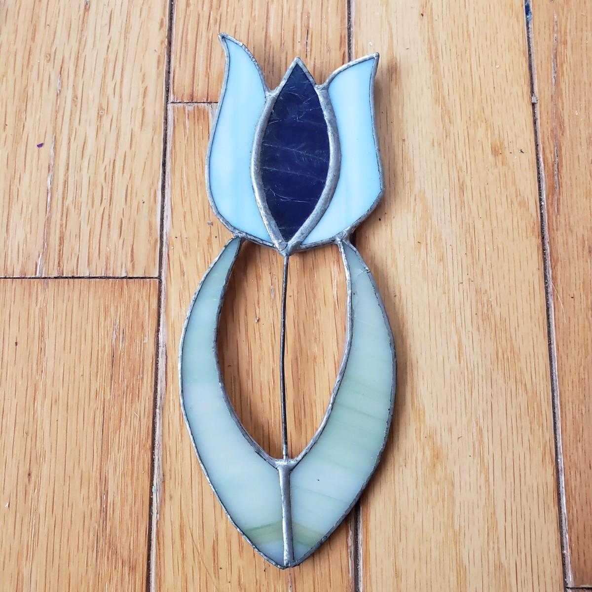 This lot of stained glass and one blown glass flower will brighten any room! The iris candle holder measures 4" x 11"H. The base is cast iron with a hole for a taper candle. The purple and clear piece that's the shape of a shell measures 9" x 7". There is a crack in this piece, but it's hard to tell. The white Kleenex box holder holds a small box. The hand blown flower has reds and yellows on its petals. The very end is chipped.