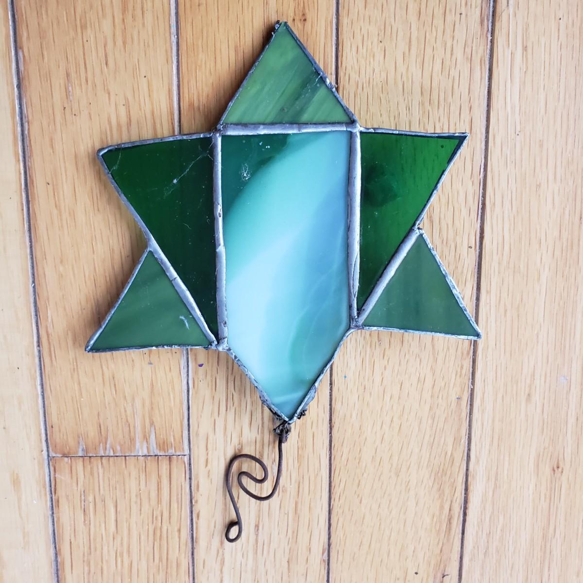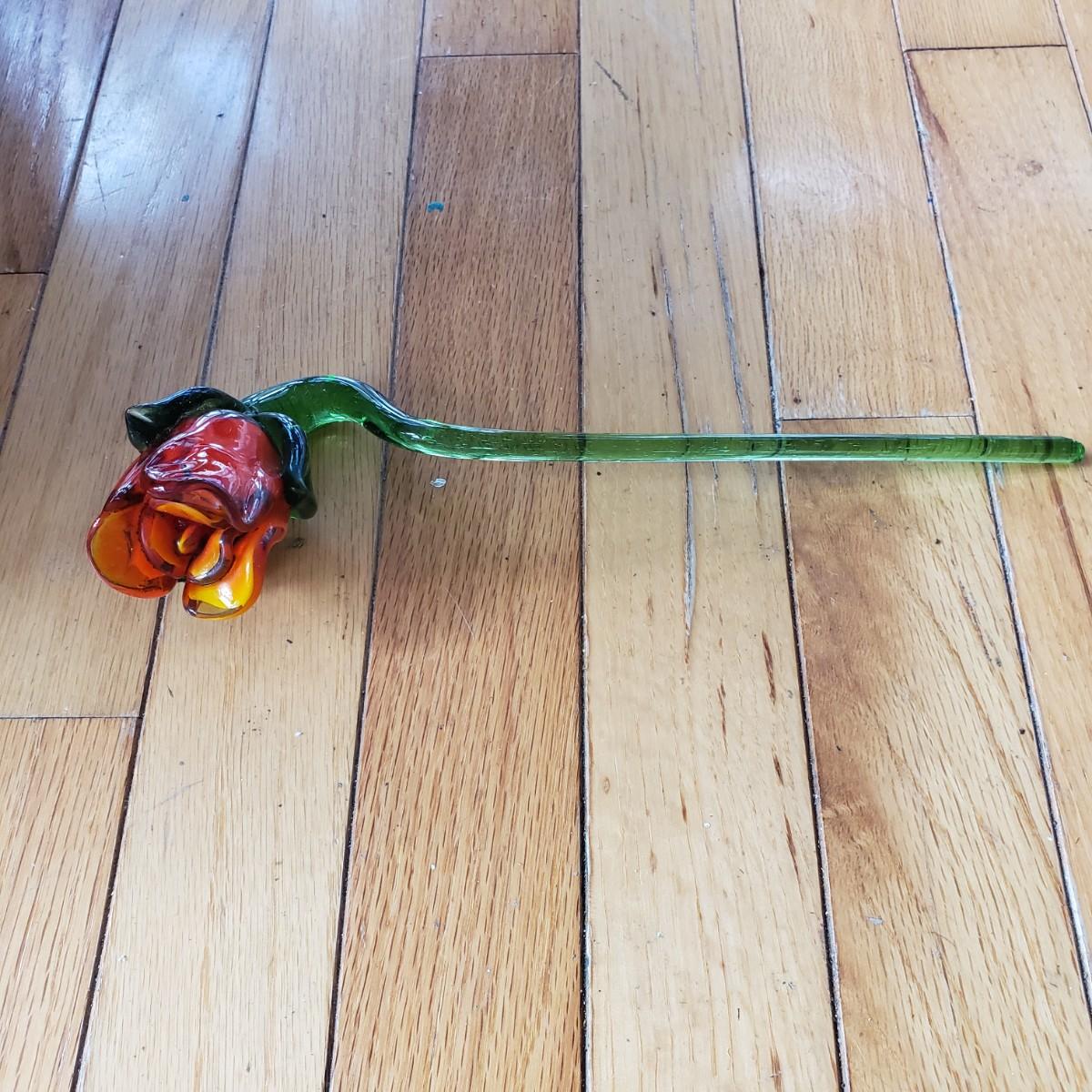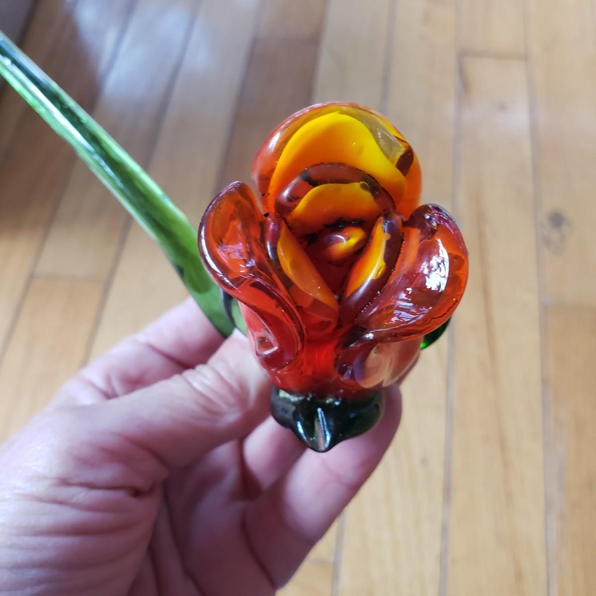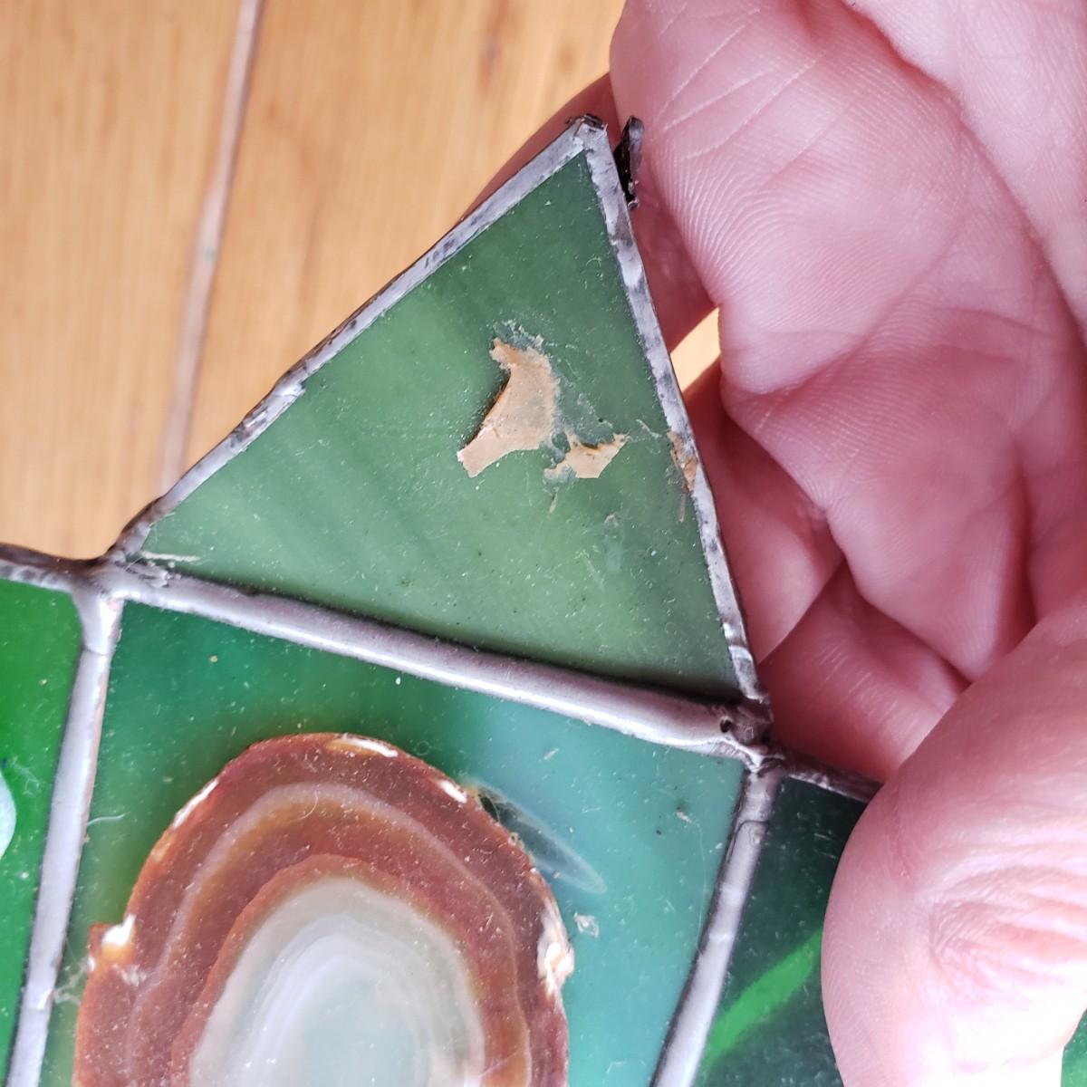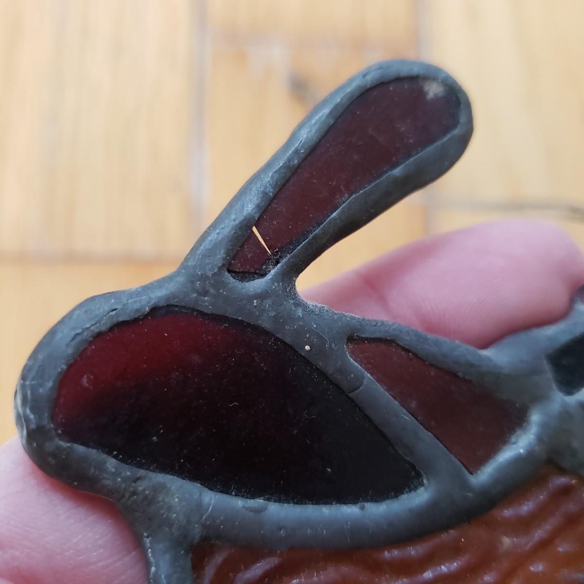 This lot of stained glass and one blown glass flower will brighten any room! The iris candle holder measures 4" x 11"H. The base is cast iron with a hole for a taper candle. The purple and clear piece that's the shape of a shell measures 9" x 7". There is a crack in this piece, but it's hard to tell. The white Kleenex box holder holds a small box. The hand blown flower has reds and yellows on its petals. The very end is chipped.