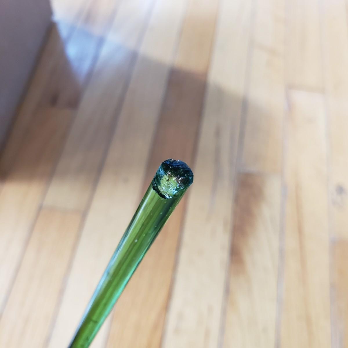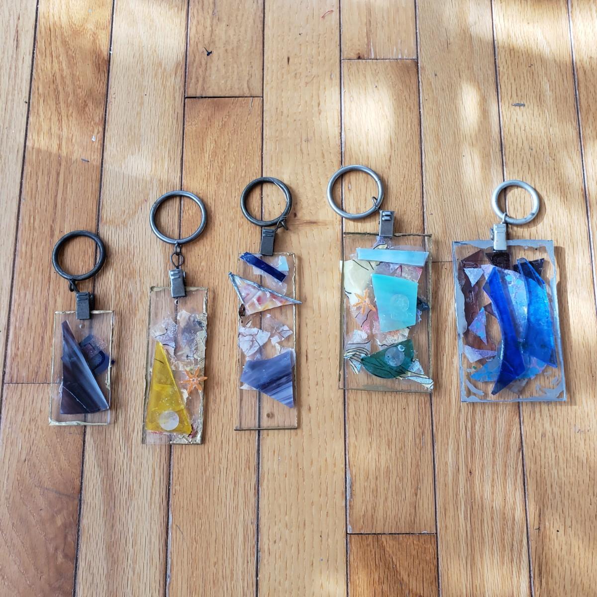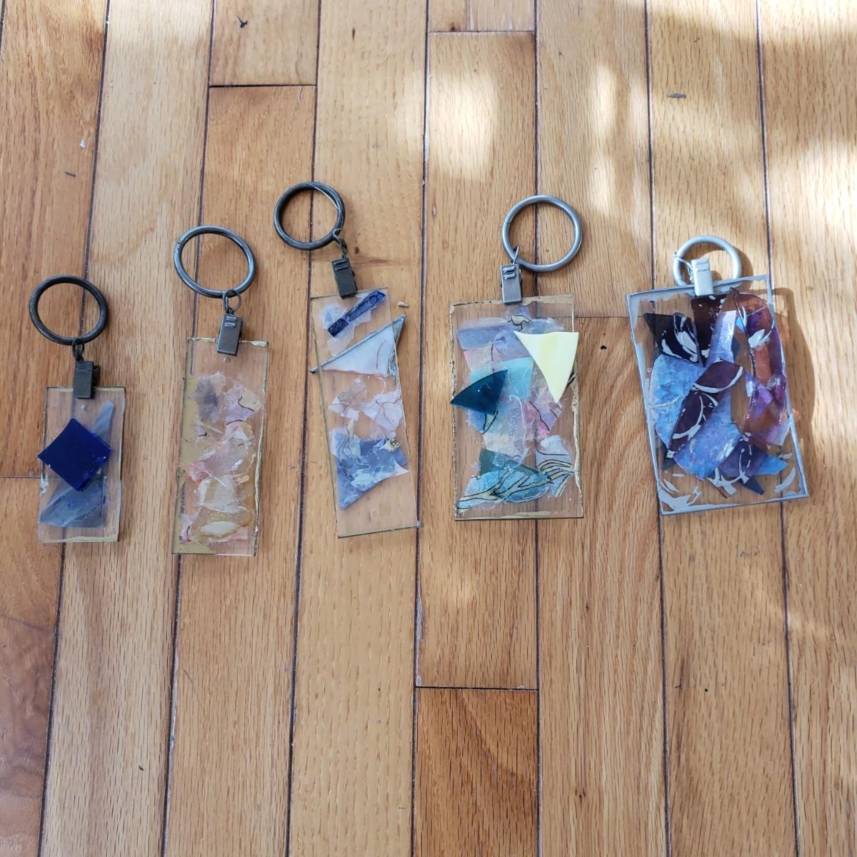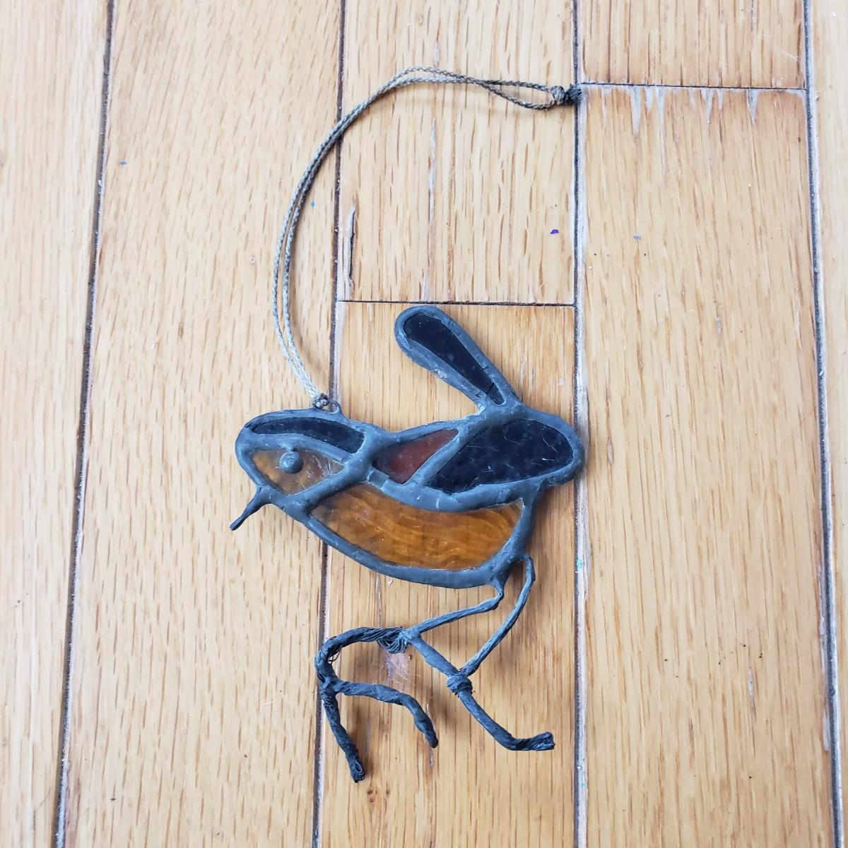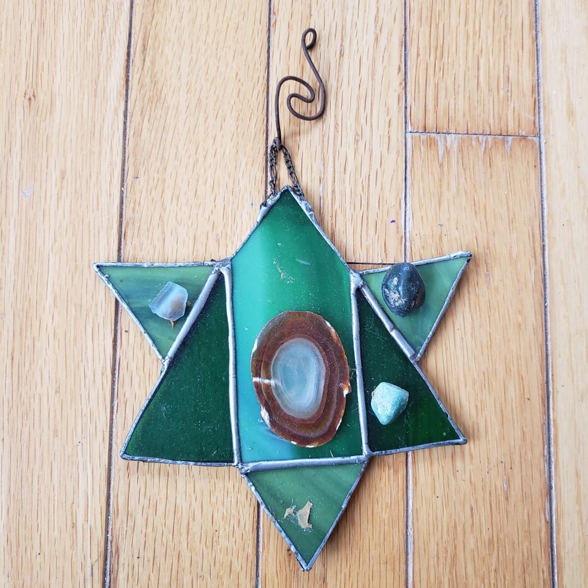 This lot of stained glass and one blown glass flower will brighten any room! The iris candle holder measures 4" x 11"H. The base is cast iron with a hole for a taper candle. The purple and clear piece that's the shape of a shell measures 9" x 7". There is a crack in this piece, but it's hard to tell. The white Kleenex box holder holds a small box. The hand blown flower has reds and yellows on its petals. The very end is chipped.