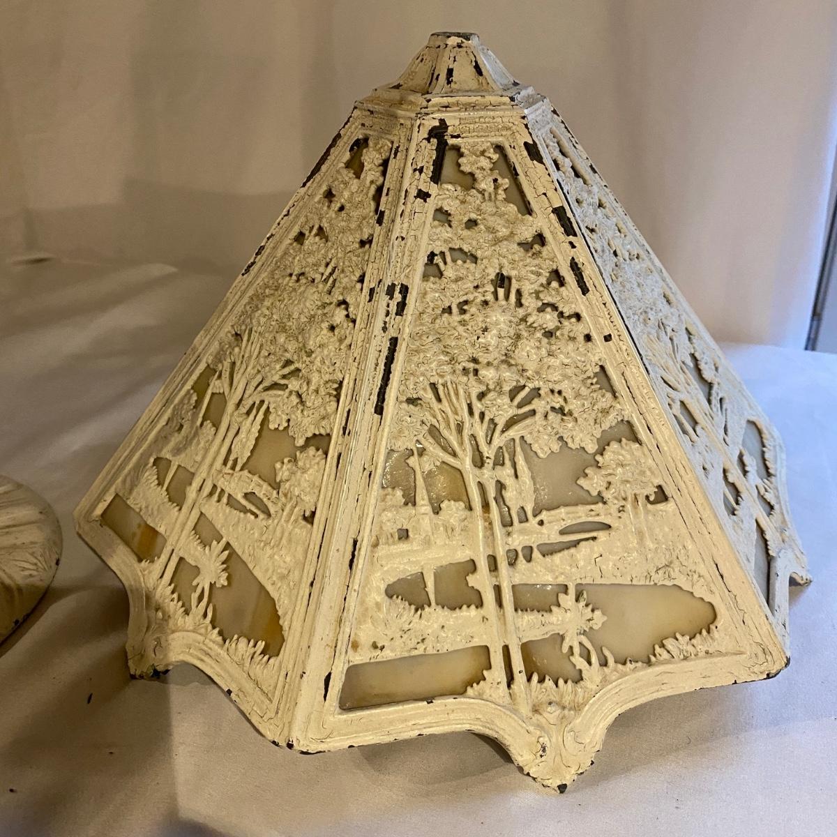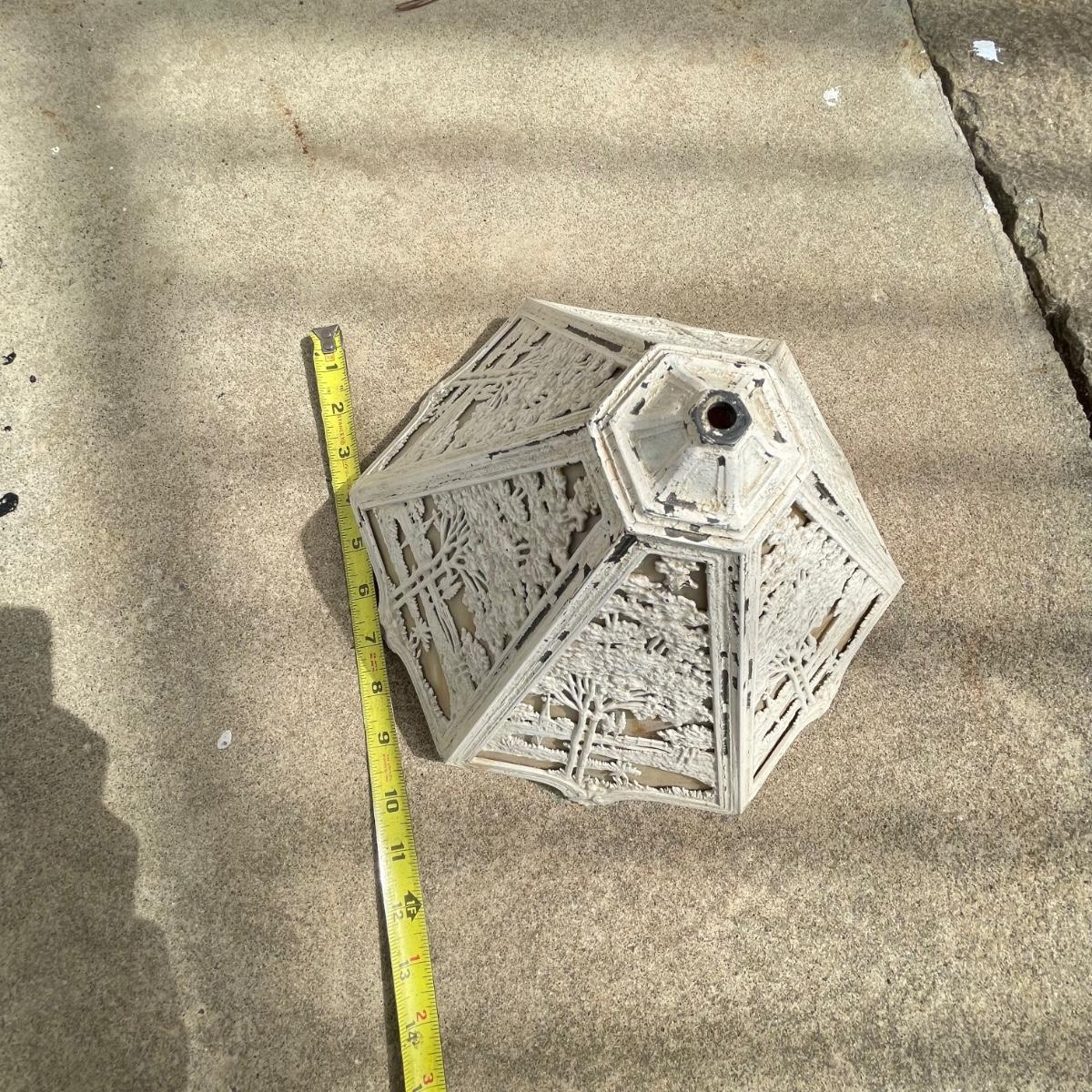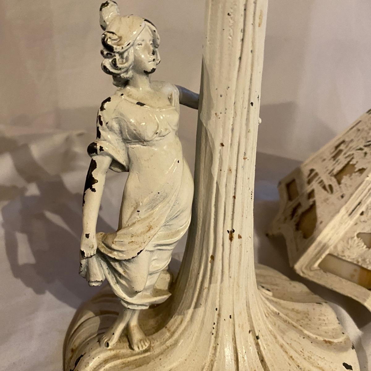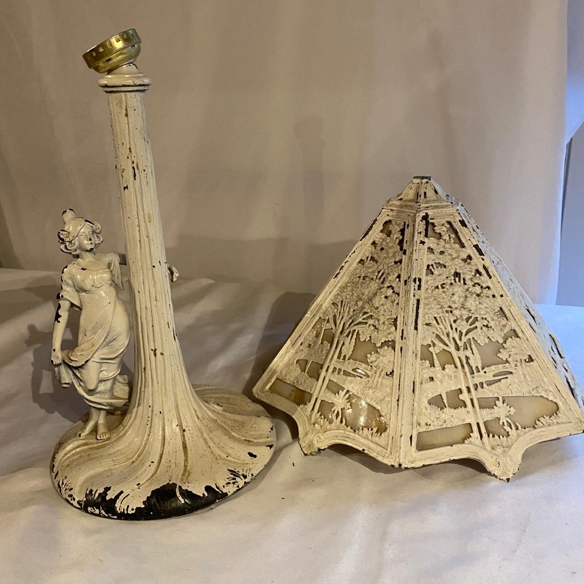Stain glass floral art with a crack in the light green panel and a bit of separation in the same area, it needs to be handled with care until it is fixed. Lot includes a metal lamp body and shade with stain glass in an Art Deco style with girl holding base. This gorgeous piece is ready for a new socket and cord. The metal shade with what appears to be alibaster inserts would look gorgeous when lit up. Not sure if it goes with the metal base but they are same white paint. There is hardware to attach. Lot also offers what appears to be a pewter vessel stand with three feet measuring 9”d at the top and 8.75” tall. This piece appears to be able to display a 10”d or larger plant pot. See images. Shipping available.