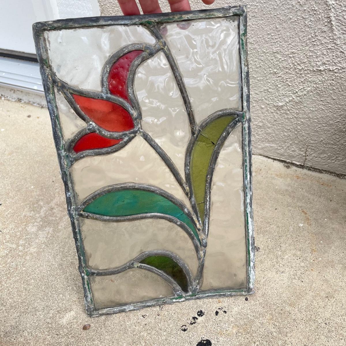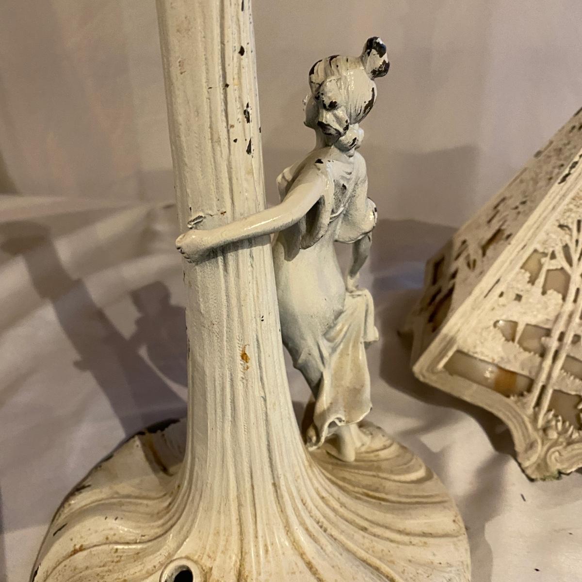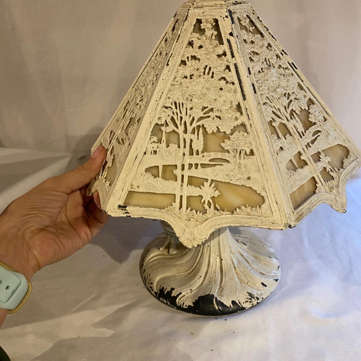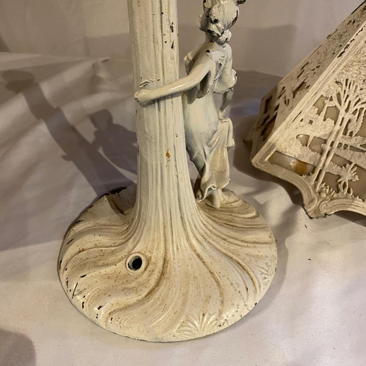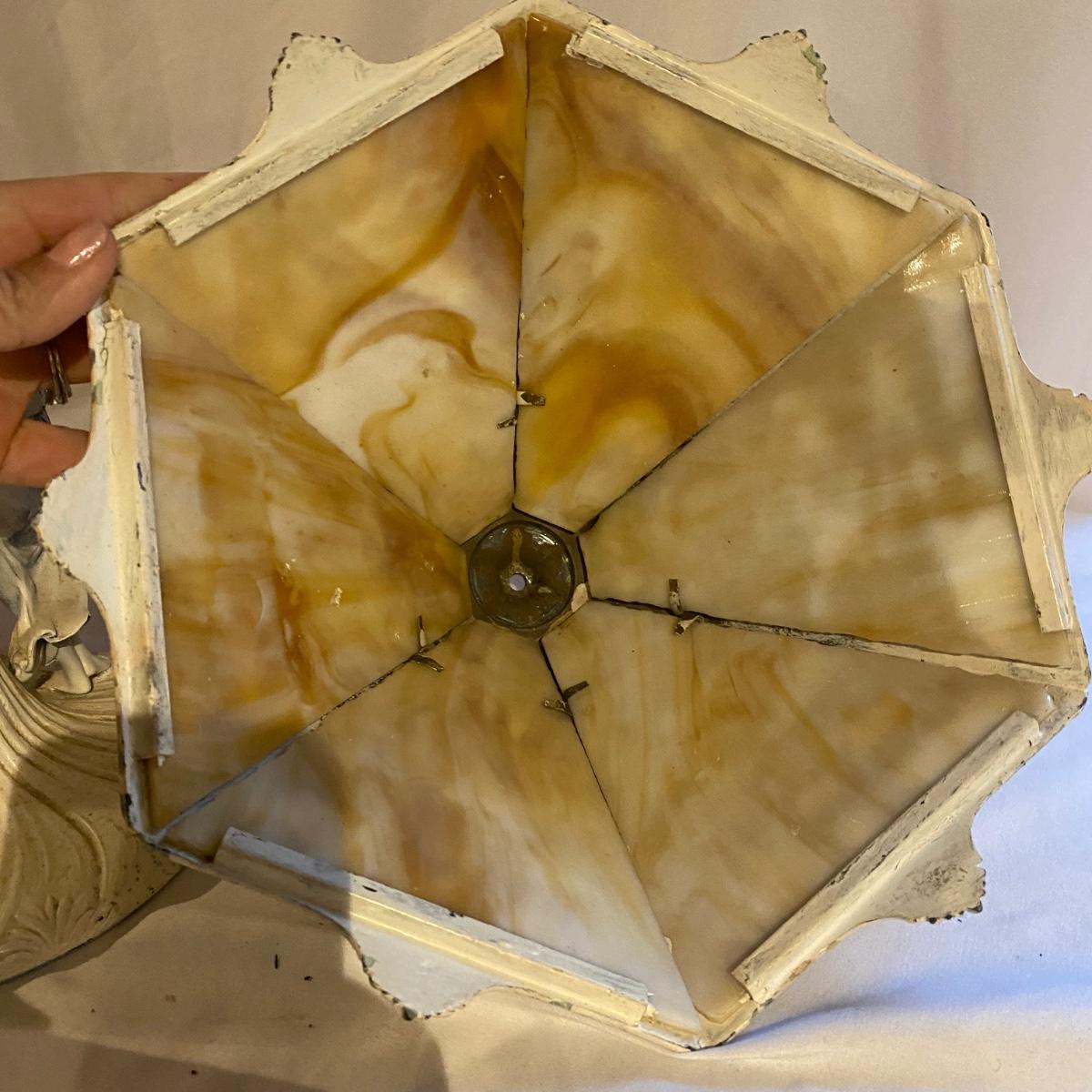 Stain glass floral art with a crack in the light green panel and a bit of separation in the same area, it needs to be handled with care until it is fixed. Lot includes a metal lamp body and shade with stain glass in an Art Deco style with girl holding base. This gorgeous piece is ready for a new socket and cord. The metal shade with what appears to be alibaster inserts would look gorgeous when lit up. Not sure if it goes with the metal base but they are same white paint. There is hardware to attach. Lot also offers what appears to be a pewter vessel stand with three feet measuring 9”d at the top and 8.75” tall. This piece appears to be able to display a 10”d or larger plant pot. See images. Shipping available.