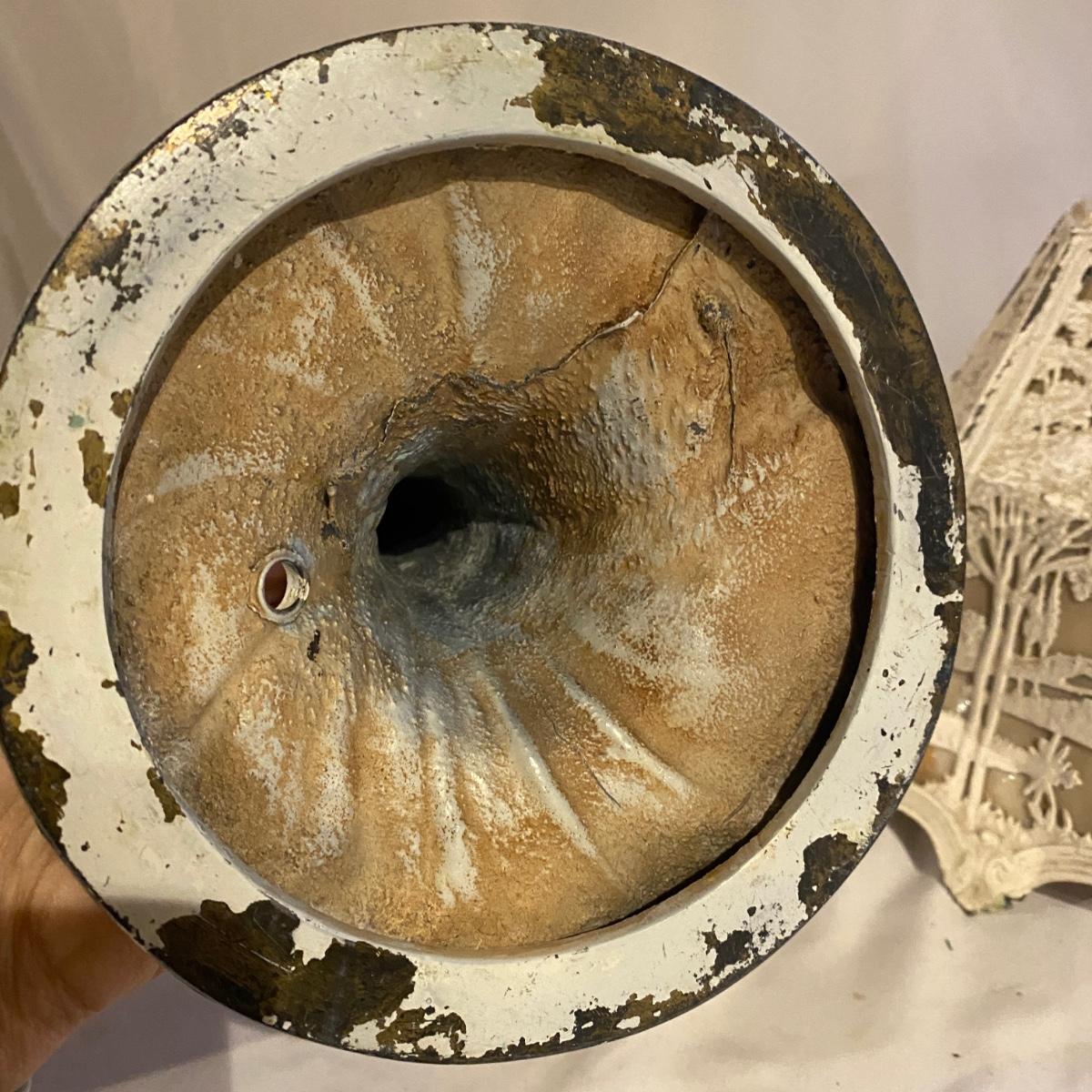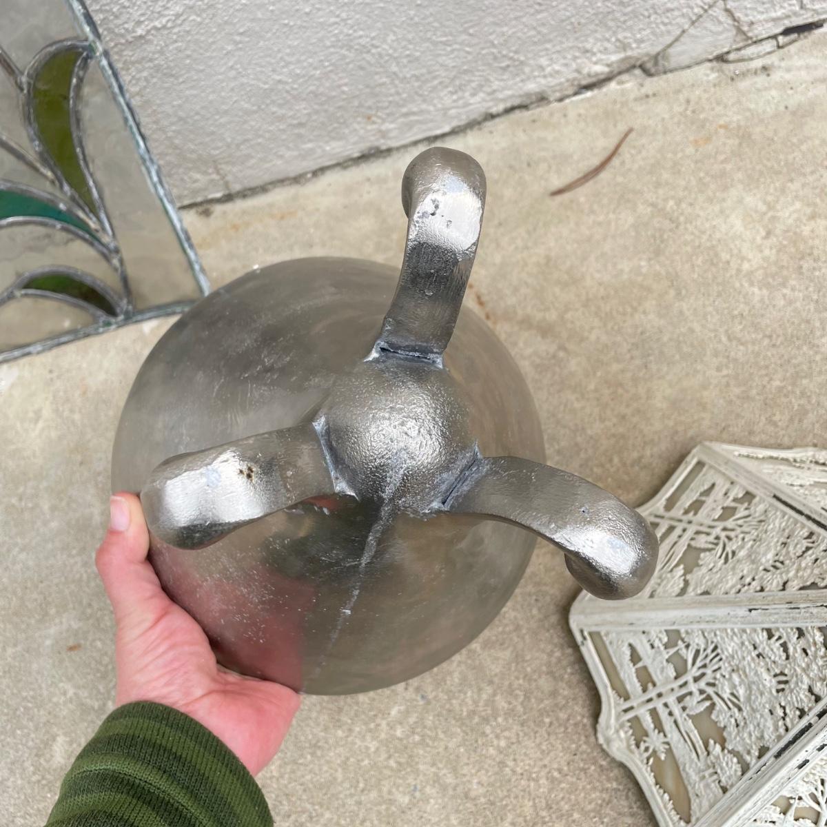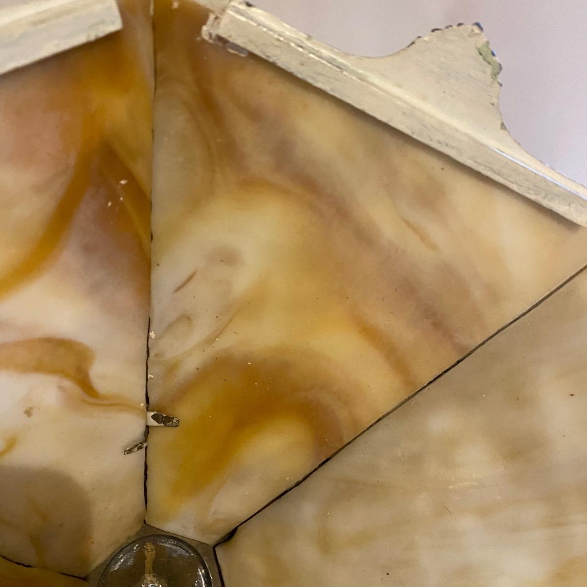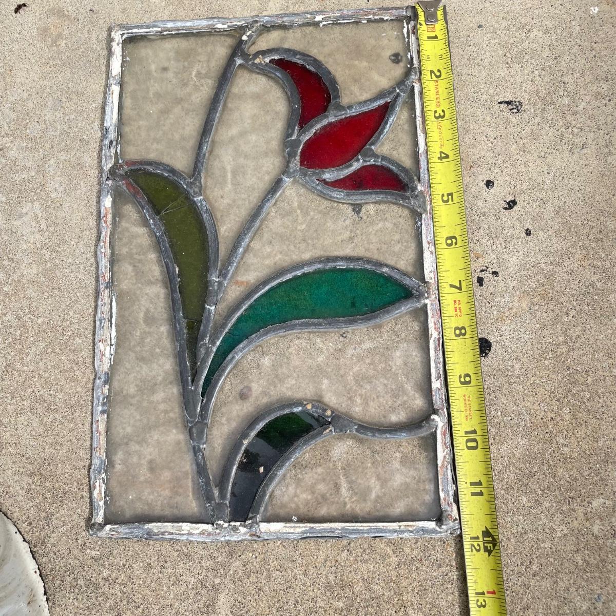 Stain glass floral art with a crack in the light green panel and a bit of separation in the same area, it needs to be handled with care until it is fixed. Lot includes a metal lamp body and shade with stain glass in an Art Deco style with girl holding base. This gorgeous piece is ready for a new socket and cord. The metal shade with what appears to be alibaster inserts would look gorgeous when lit up. Not sure if it goes with the metal base but they are same white paint. There is hardware to attach. Lot also offers what appears to be a pewter vessel stand with three feet measuring 9”d at the top and 8.75” tall. This piece appears to be able to display a 10”d or larger plant pot. See images. Shipping available.