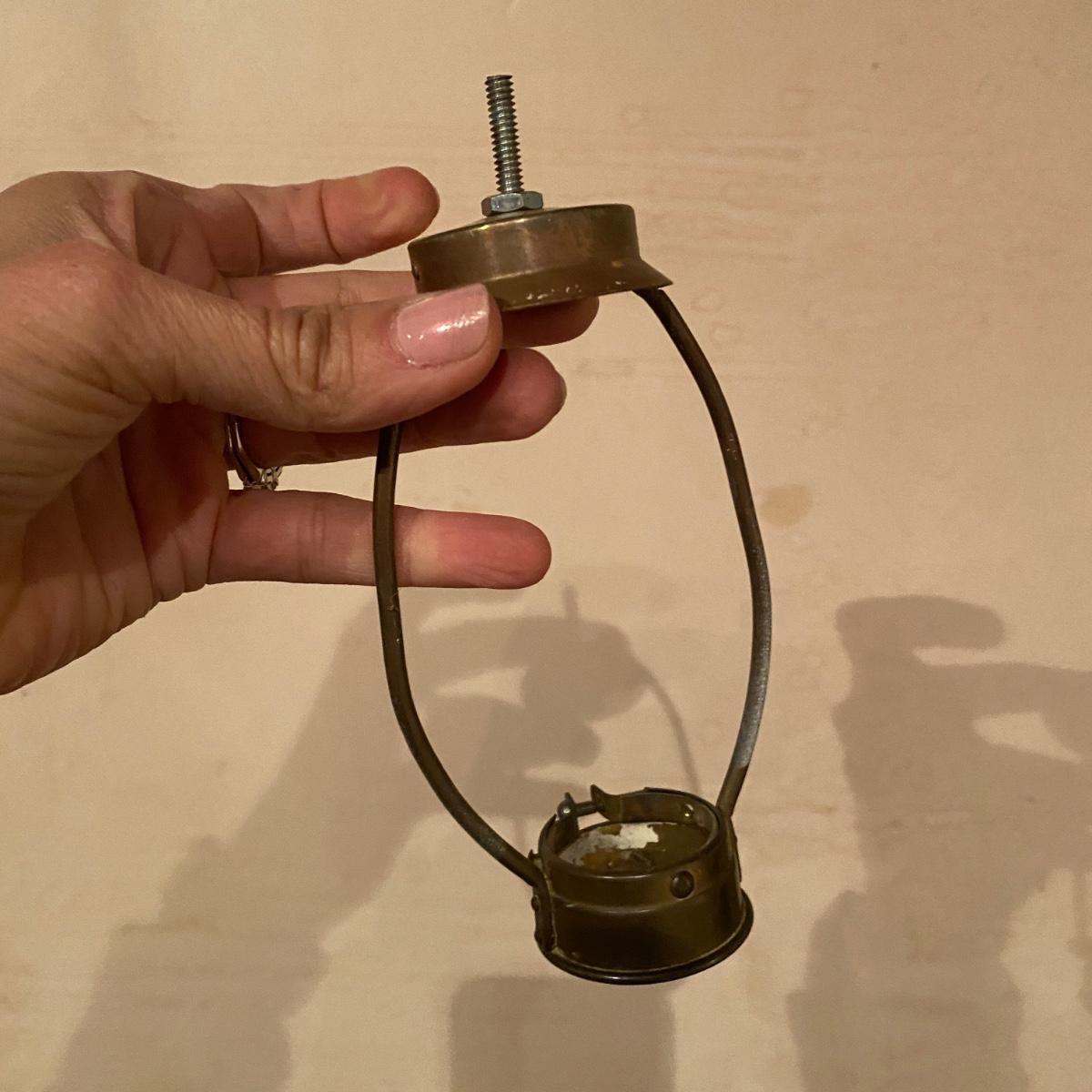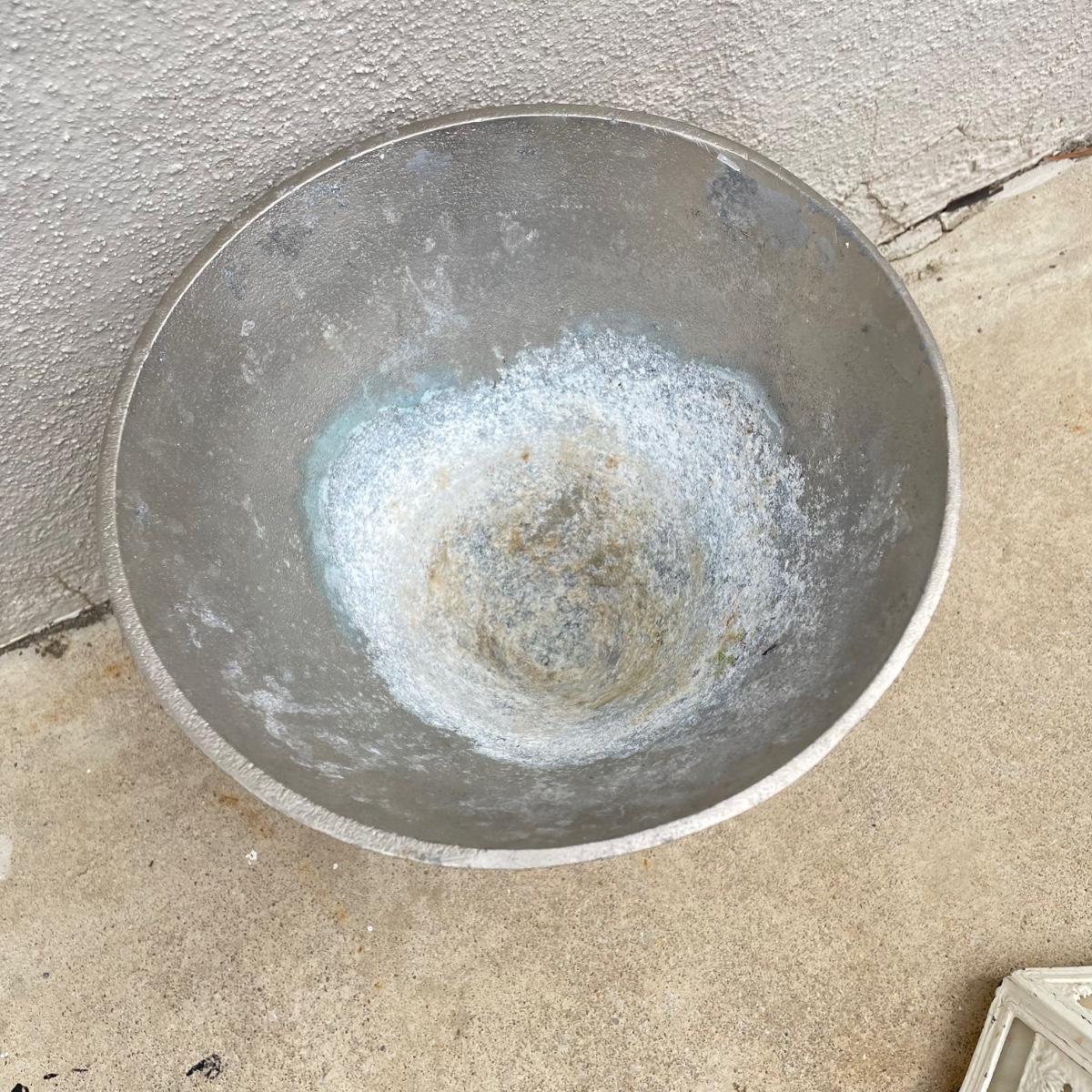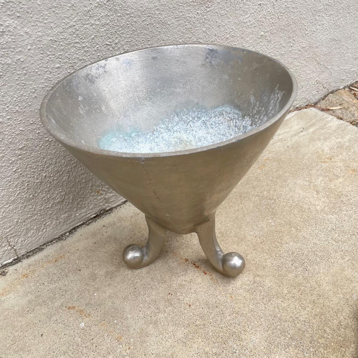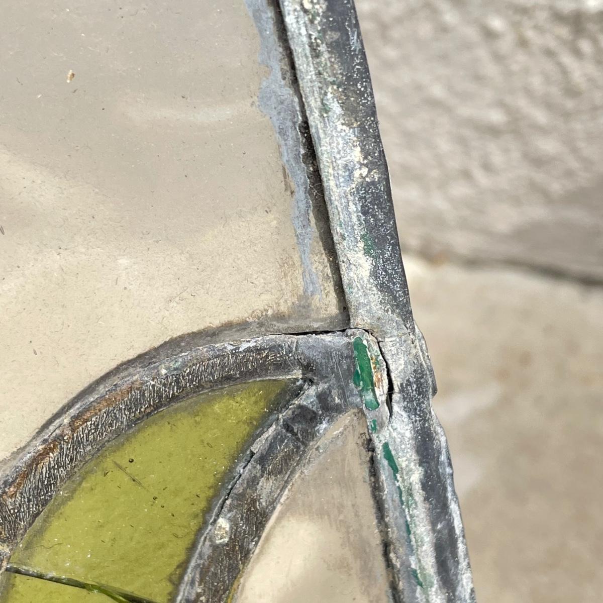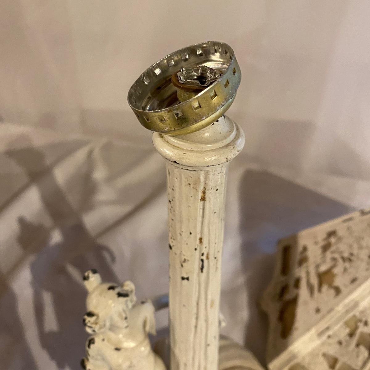 Stain glass floral art with a crack in the light green panel and a bit of separation in the same area, it needs to be handled with care until it is fixed. Lot includes a metal lamp body and shade with stain glass in an Art Deco style with girl holding base. This gorgeous piece is ready for a new socket and cord. The metal shade with what appears to be alibaster inserts would look gorgeous when lit up. Not sure if it goes with the metal base but they are same white paint. There is hardware to attach. Lot also offers what appears to be a pewter vessel stand with three feet measuring 9”d at the top and 8.75” tall. This piece appears to be able to display a 10”d or larger plant pot. See images. Shipping available.