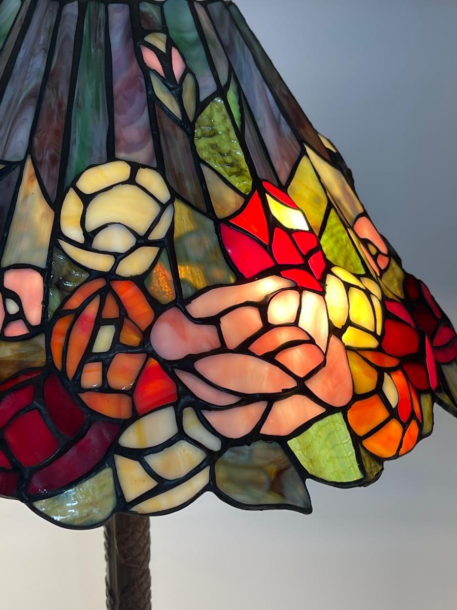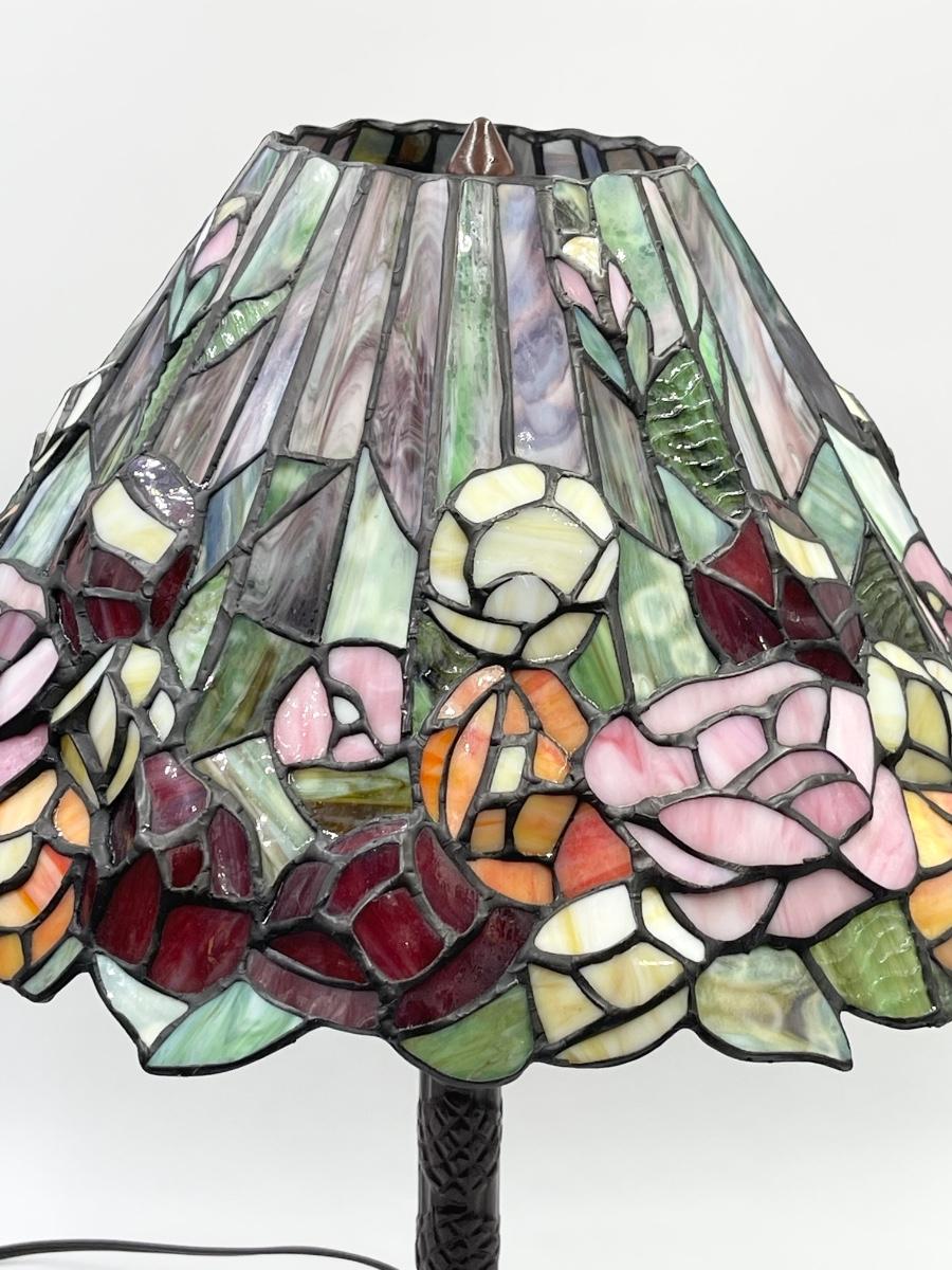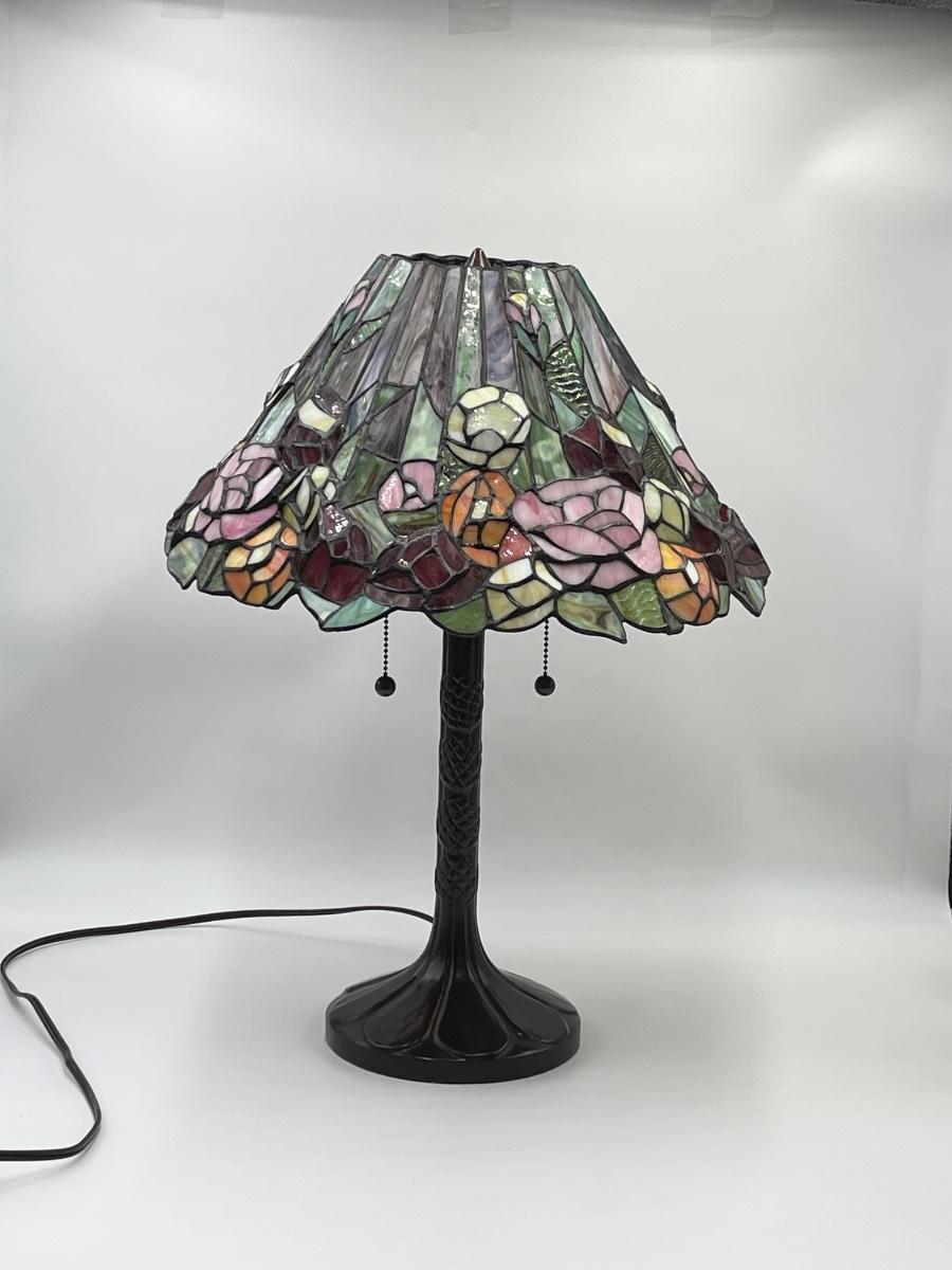 Shade made with an acrylic type material to look like stain glass. Has 2 Bulbs that can be used together or separately. 22” H x 16” Round