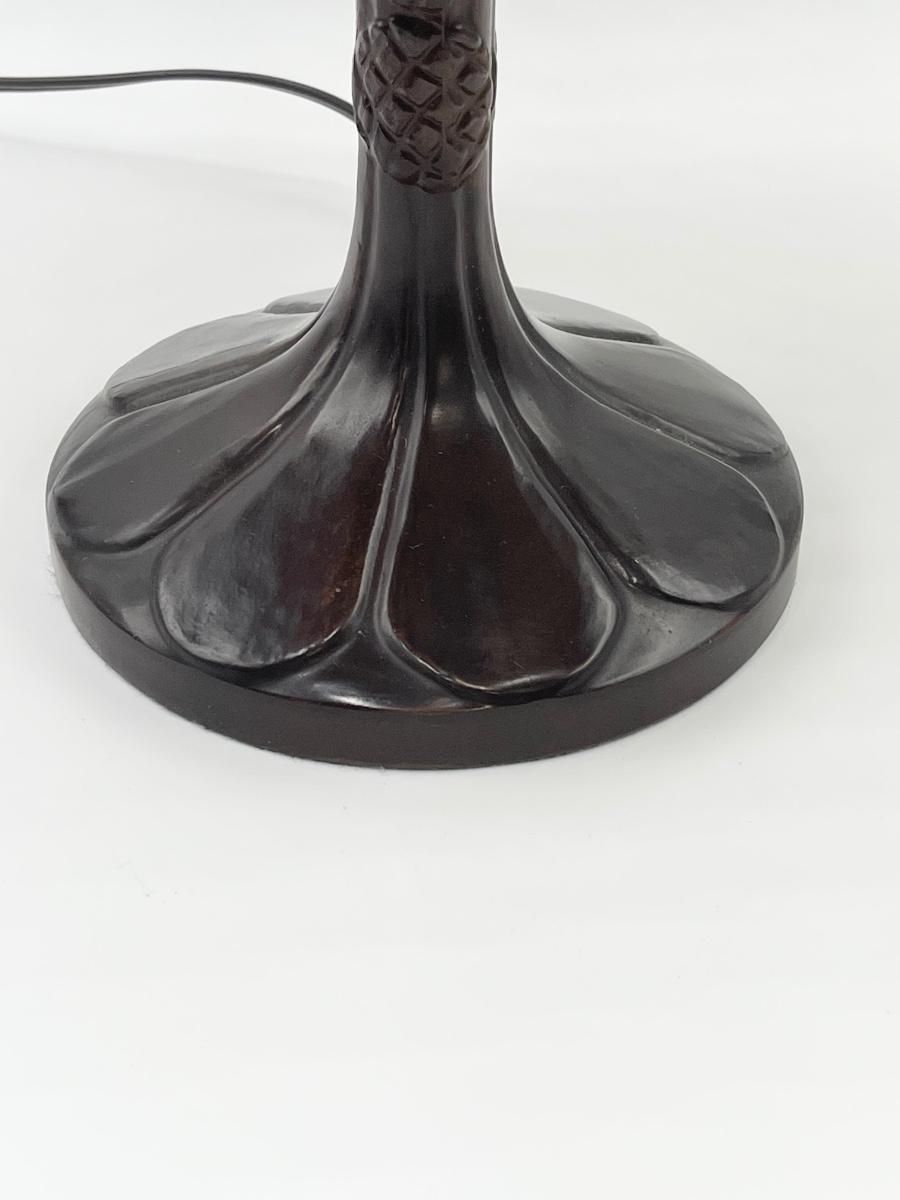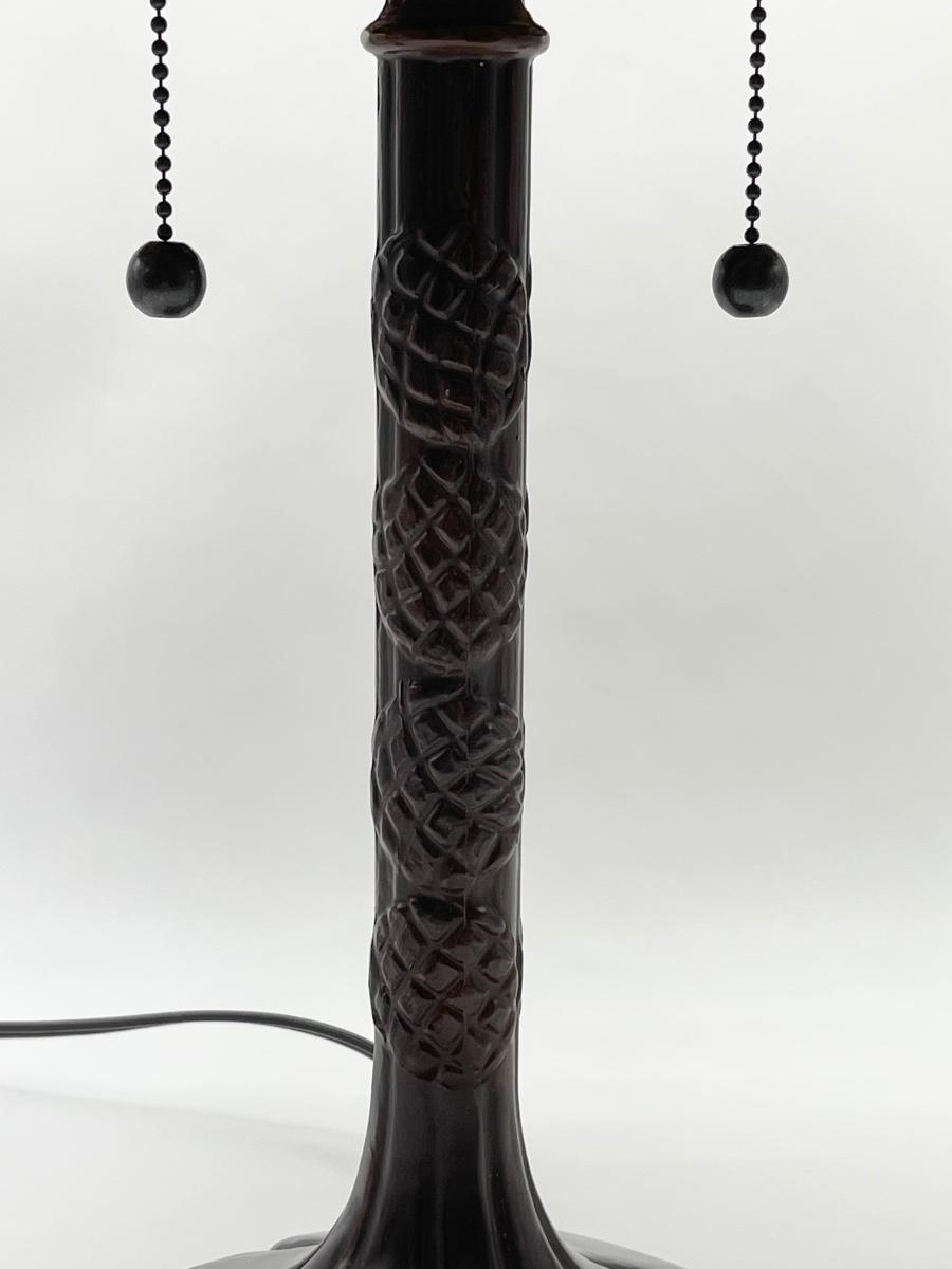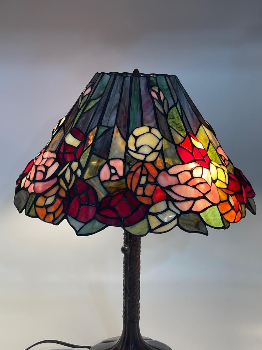 Shade made with an acrylic type material to look like stain glass. Has 2 Bulbs that can be used together or separately. 22” H x 16” Round