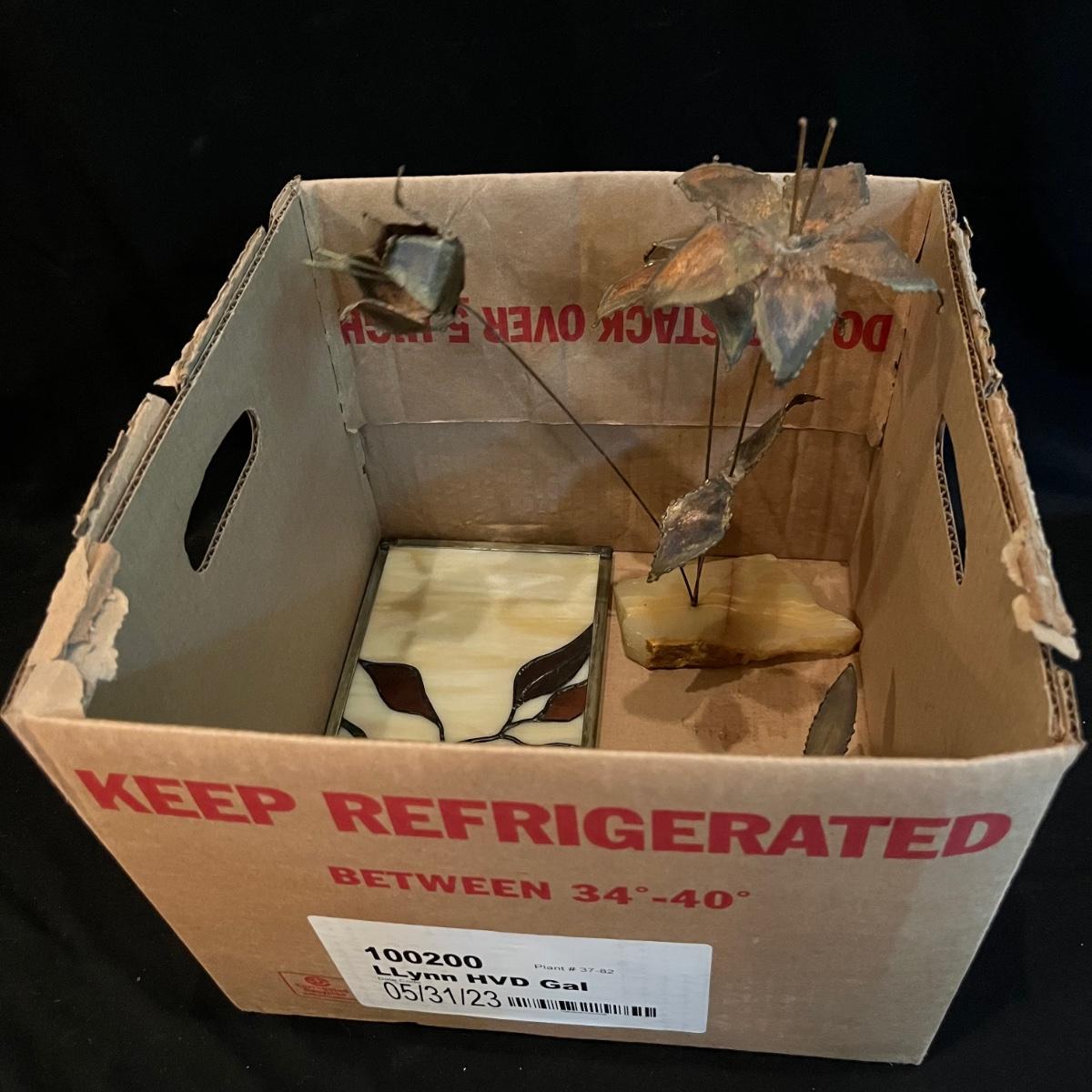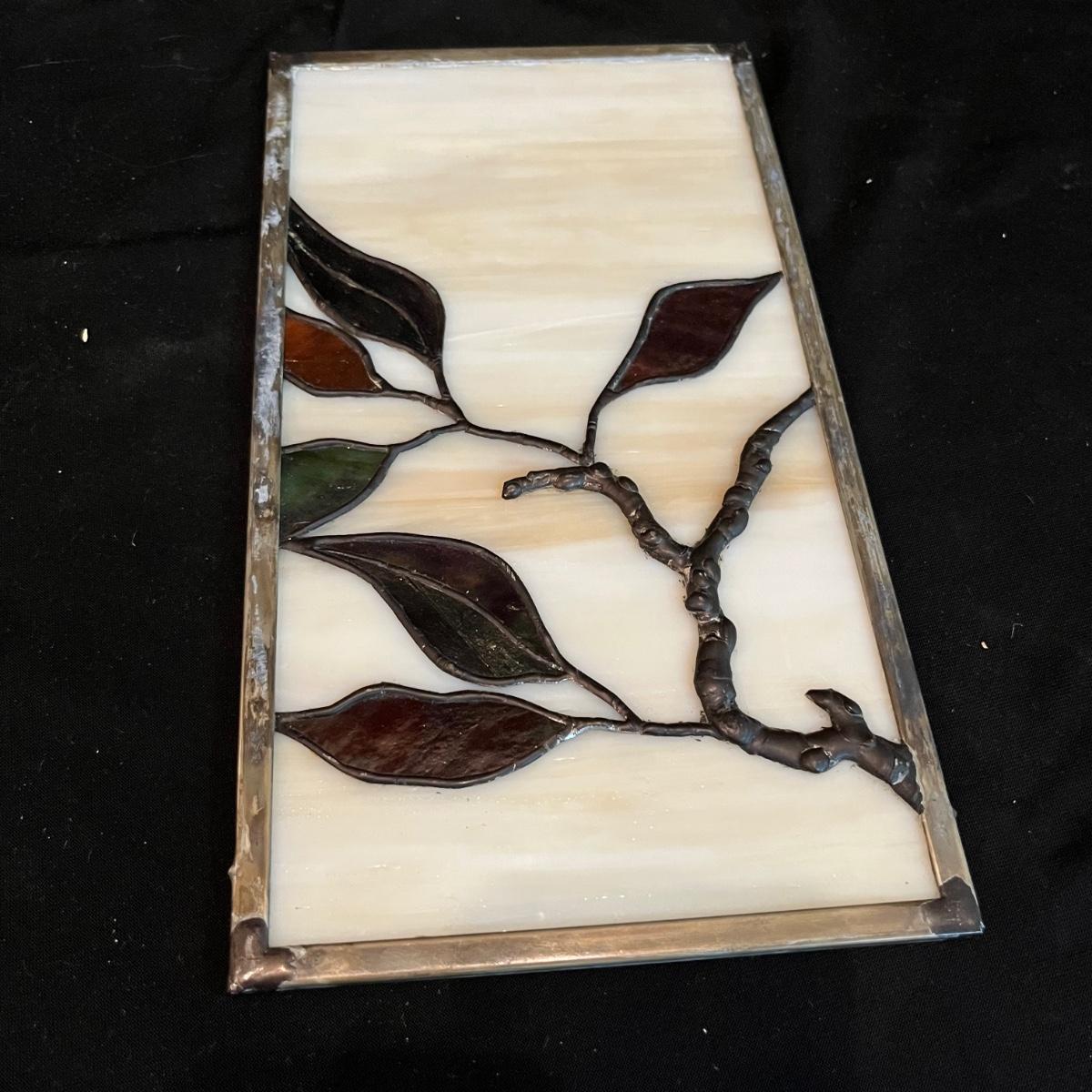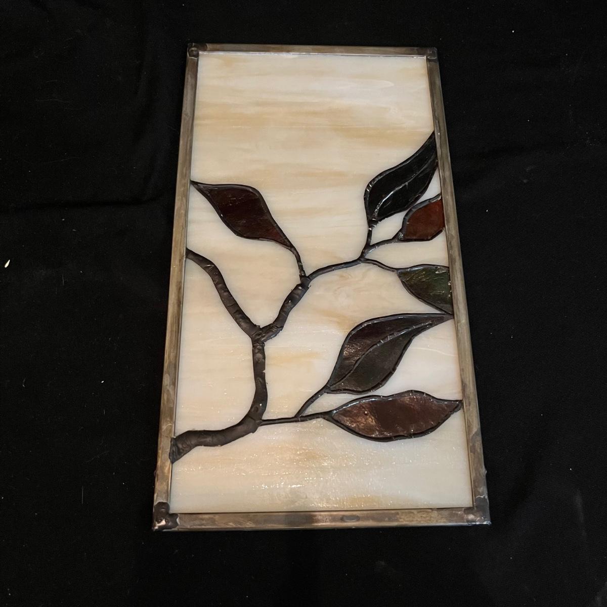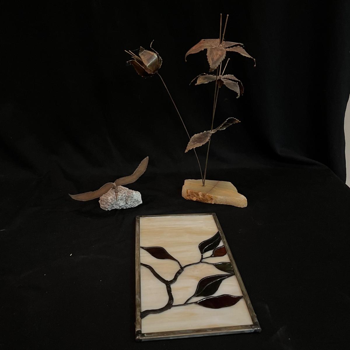 This lot includes two stone and metal figures and one small stained glass art piece. One of the figures has a stone base and the other figure has what appears to be a coral base. Both the figures are made of a very lightweight metal. None of the pieces appear to be signed by an artist. The stain glass measures about 6” x 11”H. Shipping available.