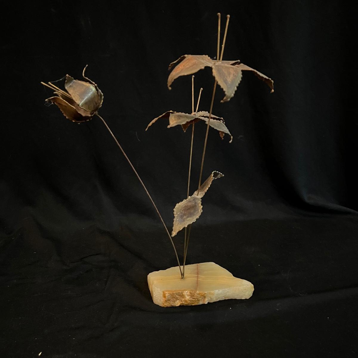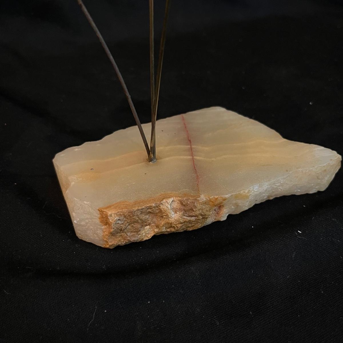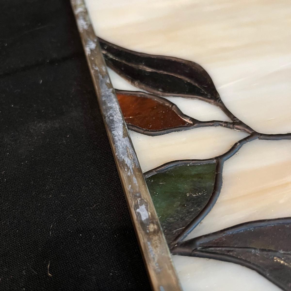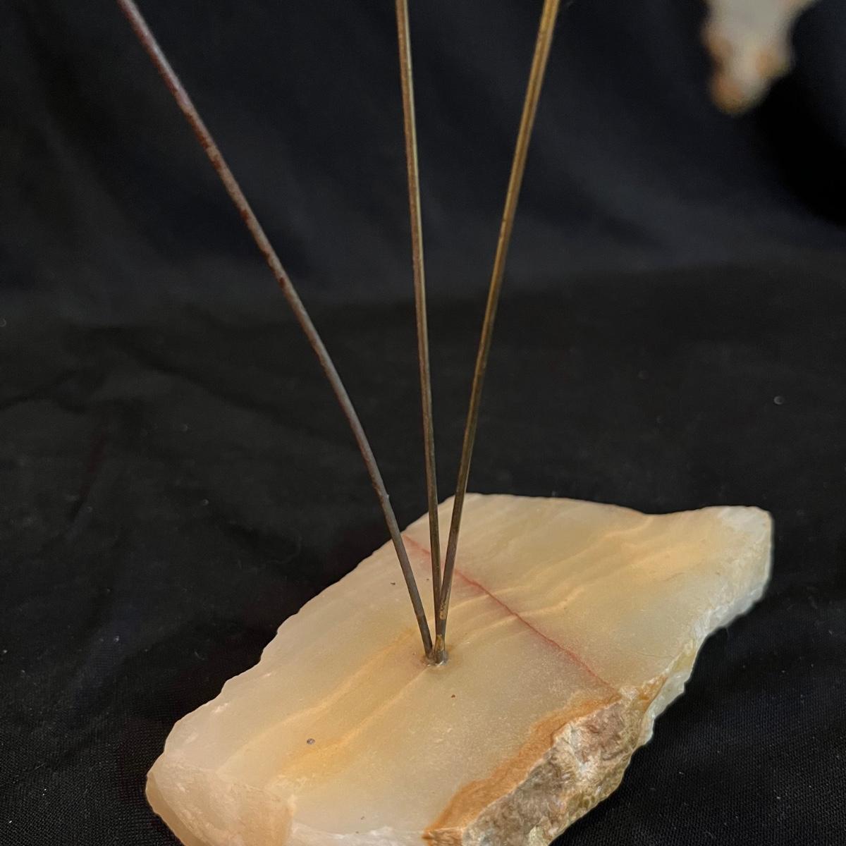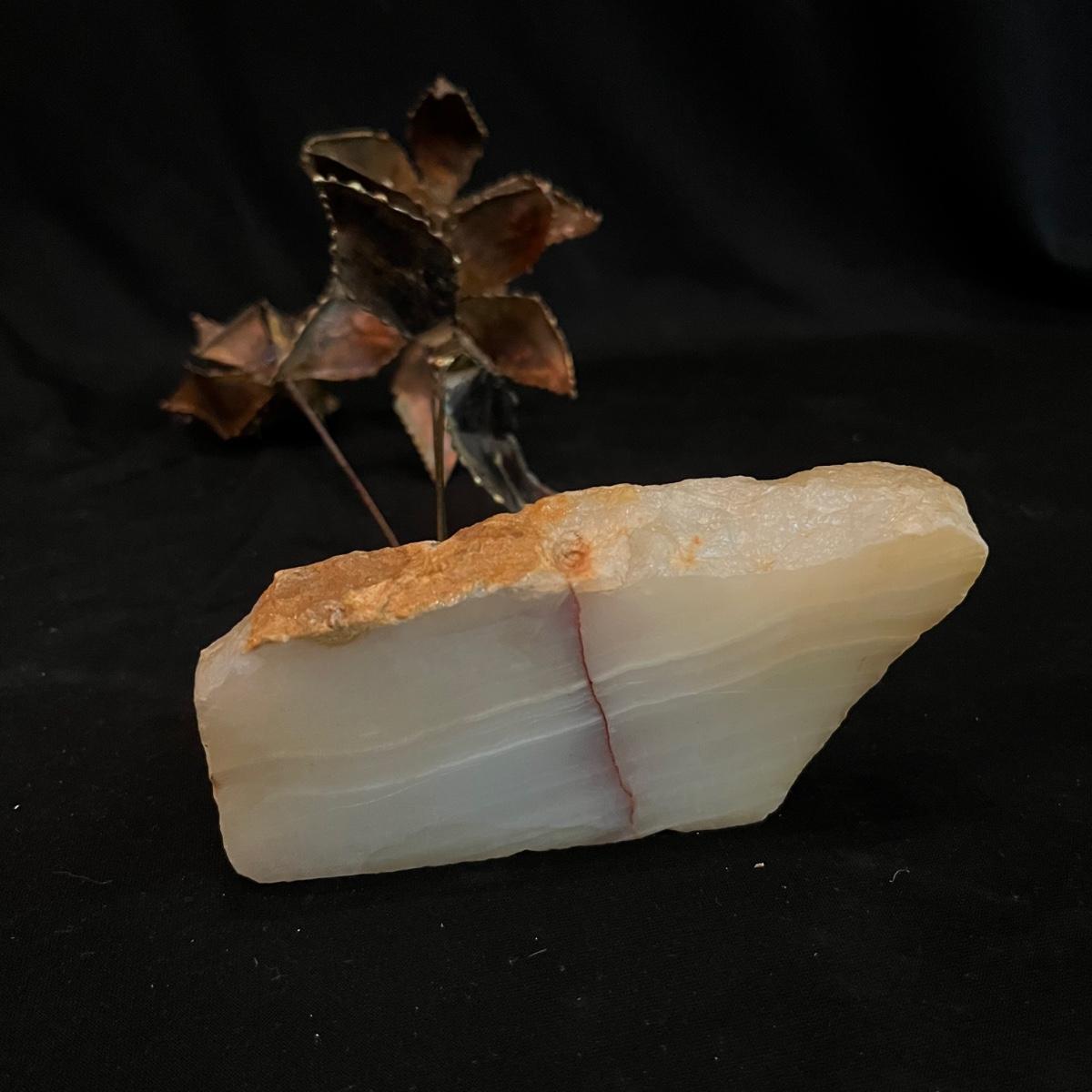 This lot includes two stone and metal figures and one small stained glass art piece. One of the figures has a stone base and the other figure has what appears to be a coral base. Both the figures are made of a very lightweight metal. None of the pieces appear to be signed by an artist. The stain glass measures about 6” x 11”H. Shipping available.