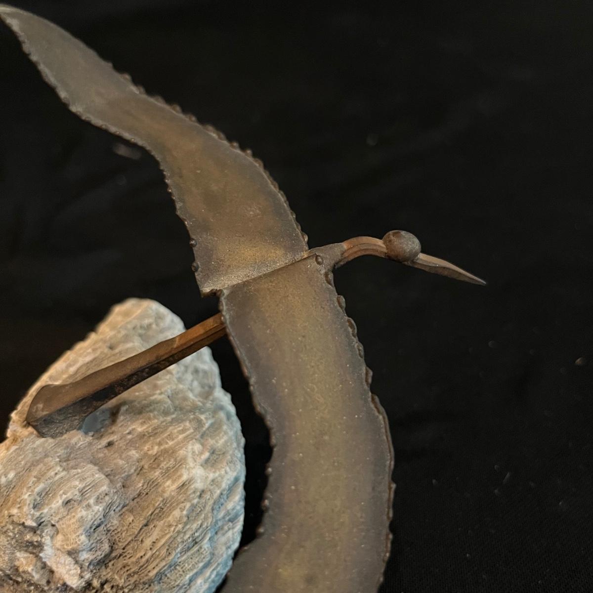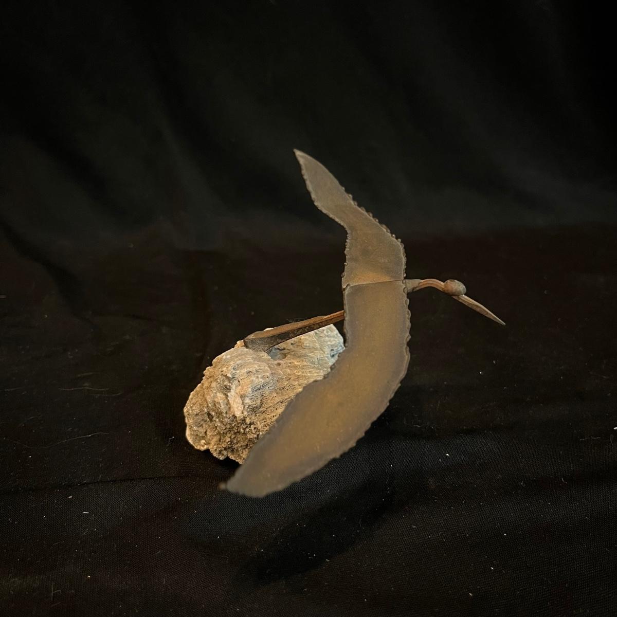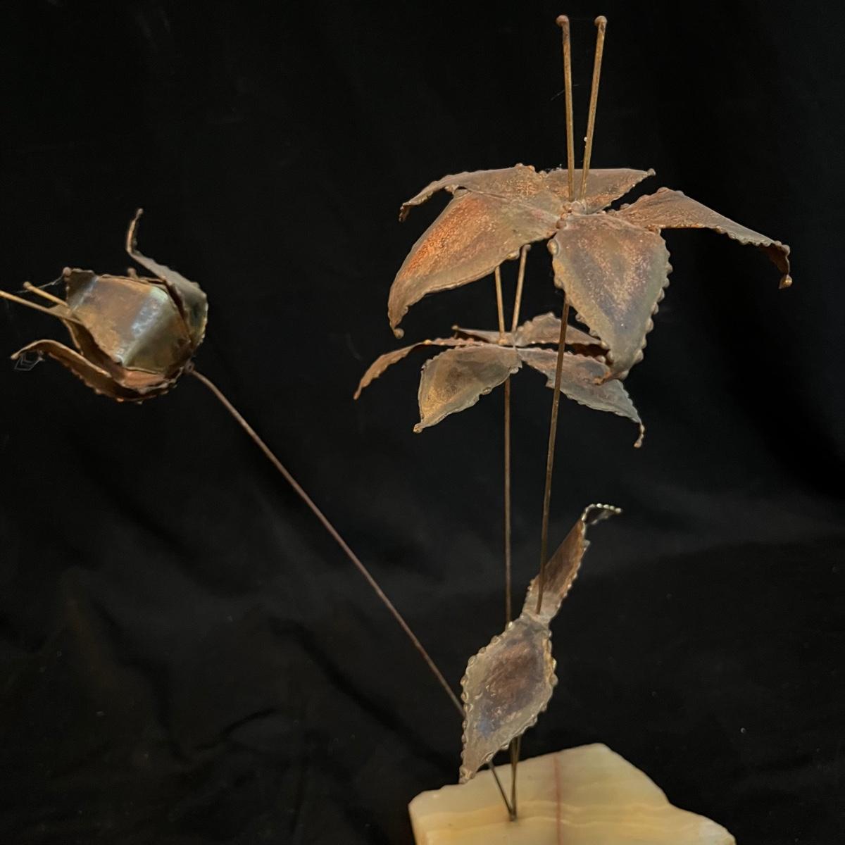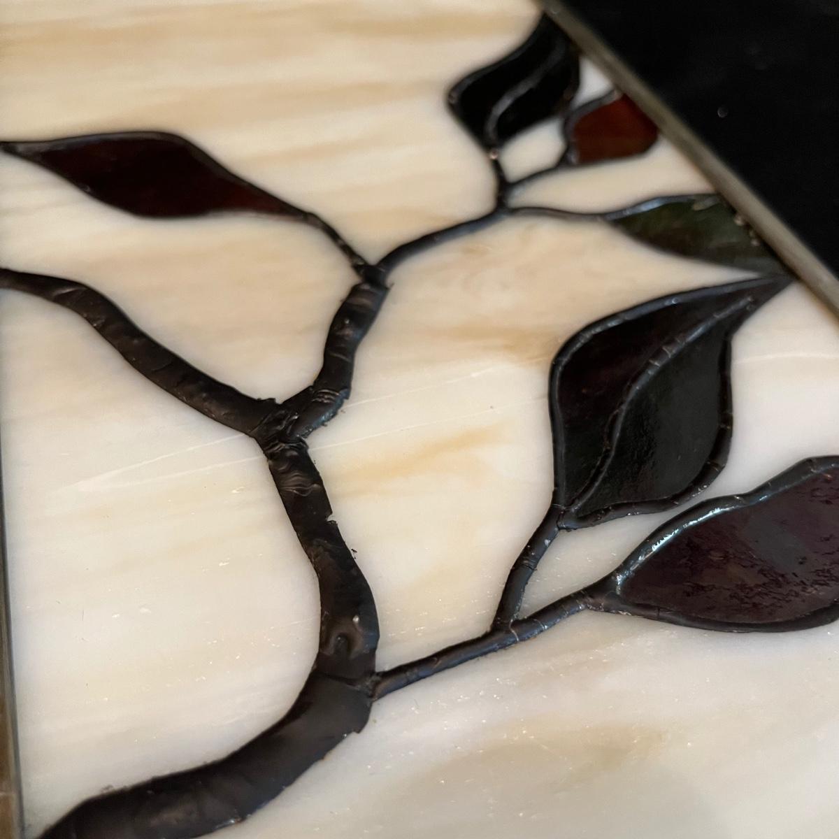 This lot includes two stone and metal figures and one small stained glass art piece. One of the figures has a stone base and the other figure has what appears to be a coral base. Both the figures are made of a very lightweight metal. None of the pieces appear to be signed by an artist. The stain glass measures about 6” x 11”H. Shipping available.