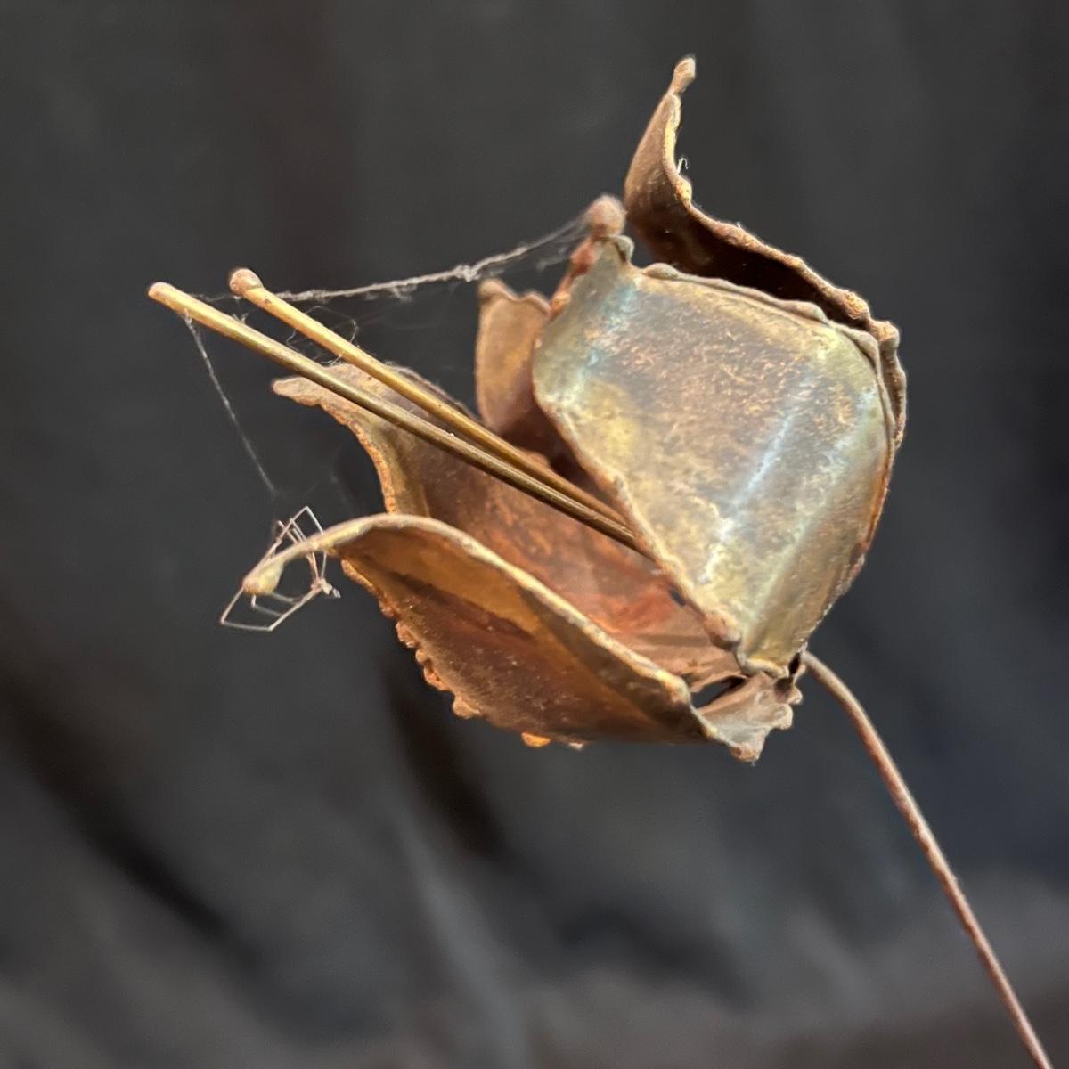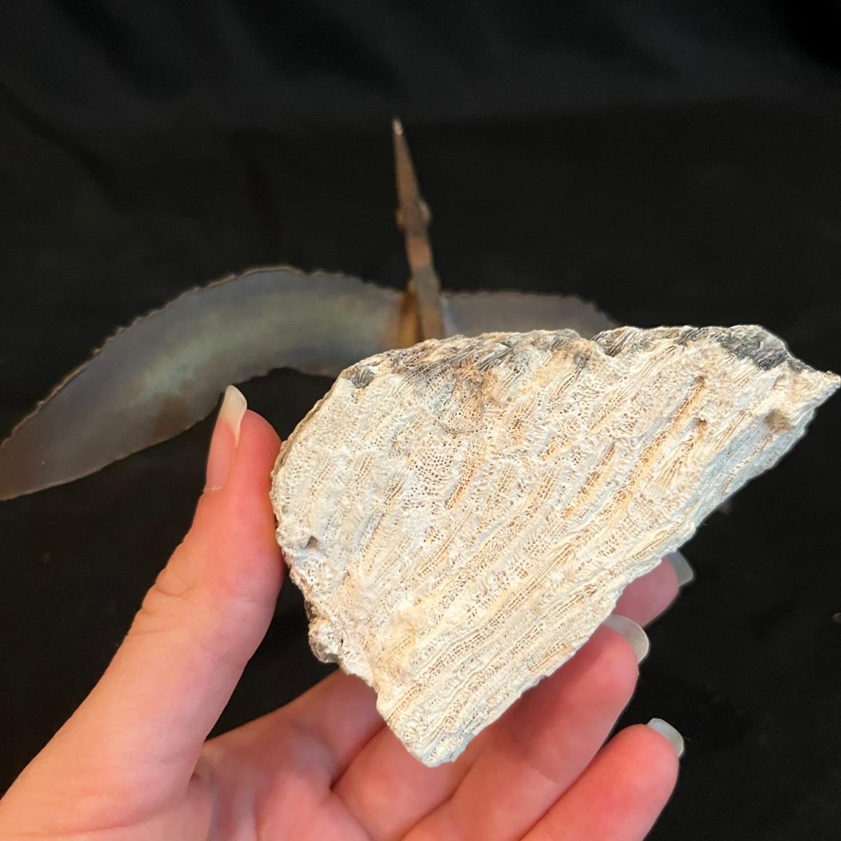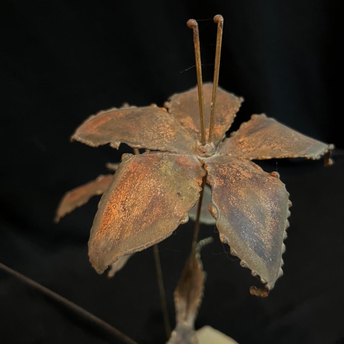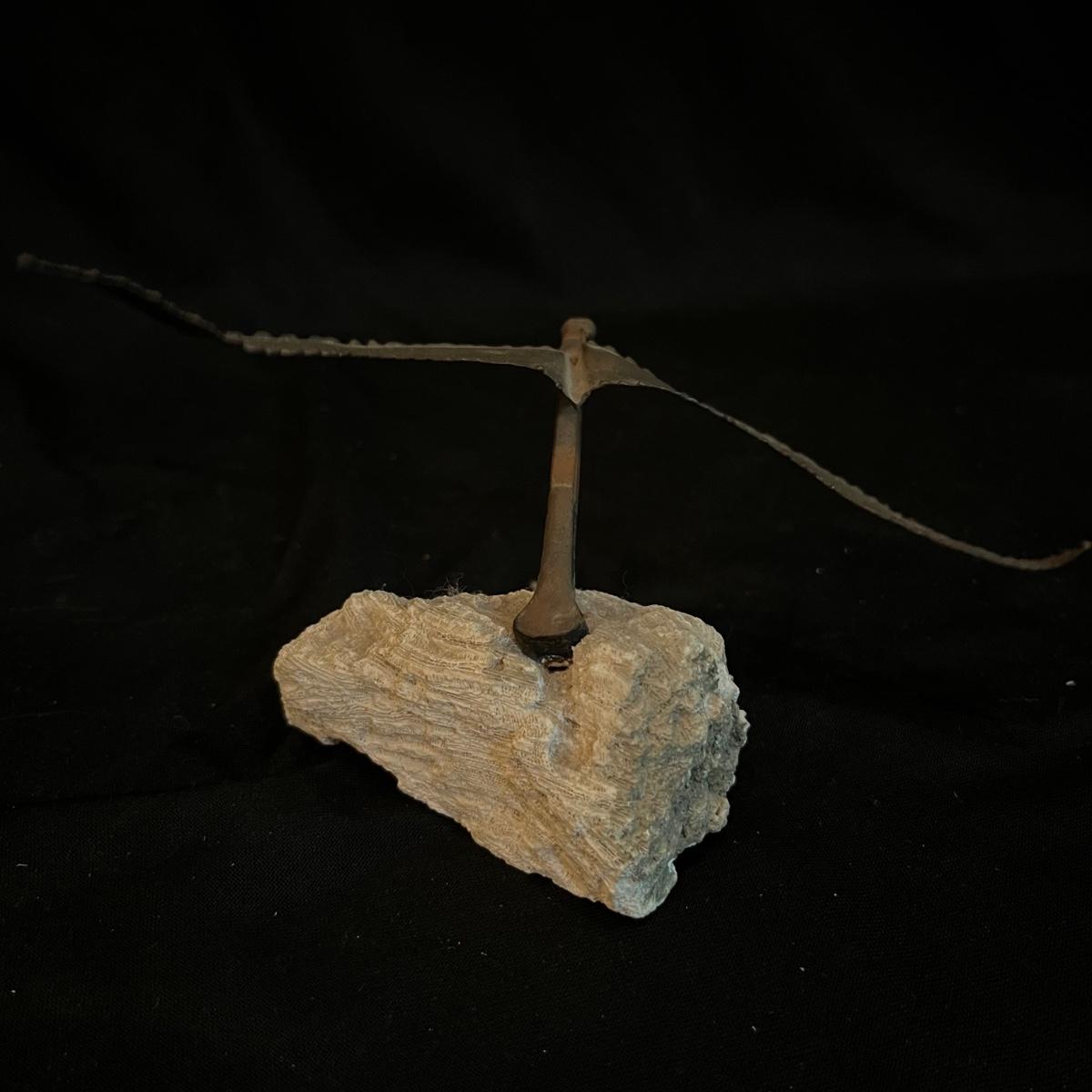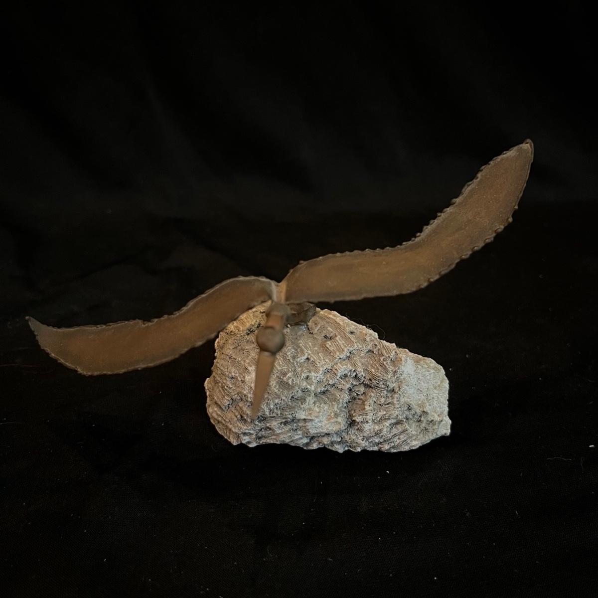 This lot includes two stone and metal figures and one small stained glass art piece. One of the figures has a stone base and the other figure has what appears to be a coral base. Both the figures are made of a very lightweight metal. None of the pieces appear to be signed by an artist. The stain glass measures about 6” x 11”H. Shipping available.
