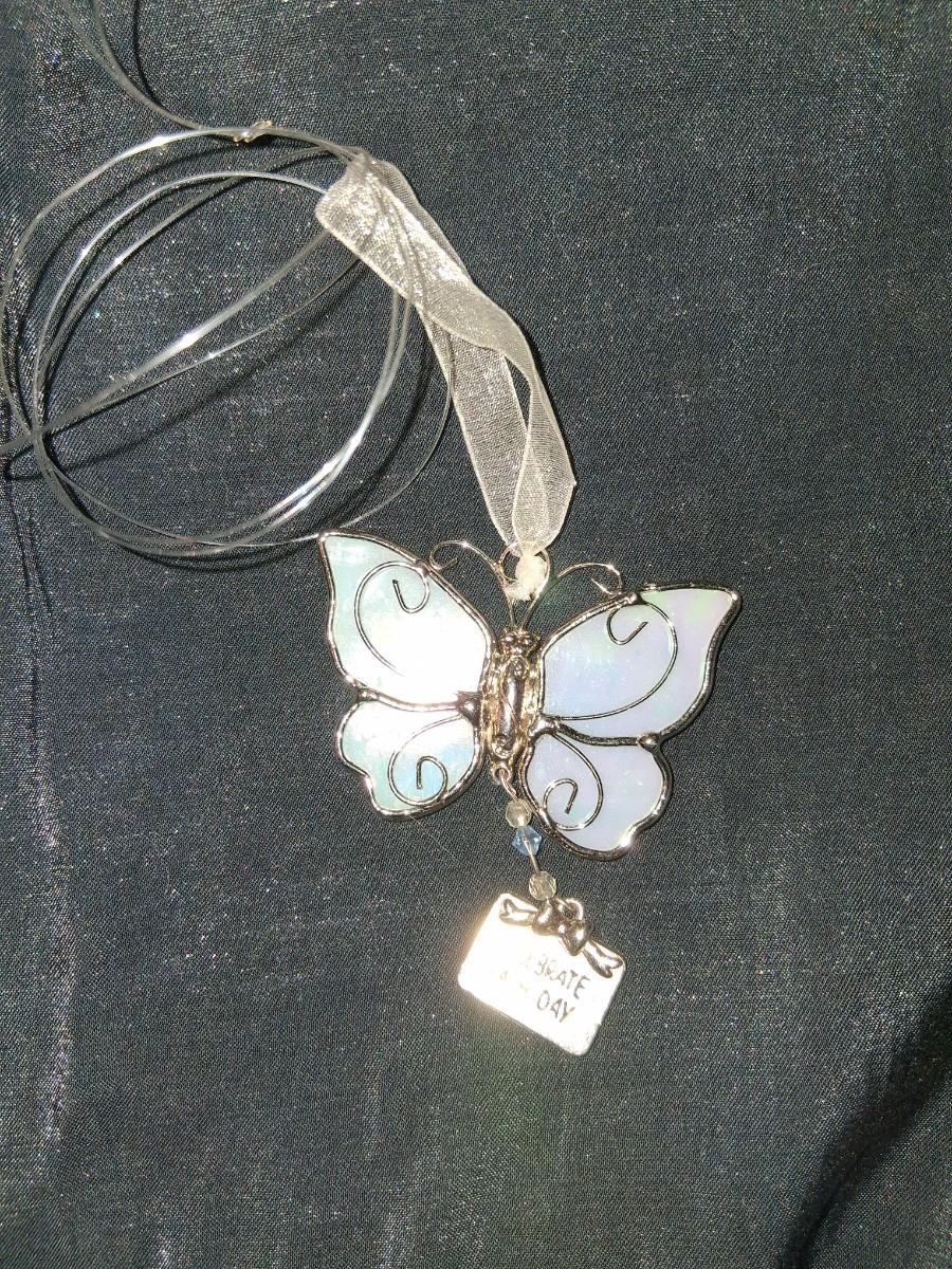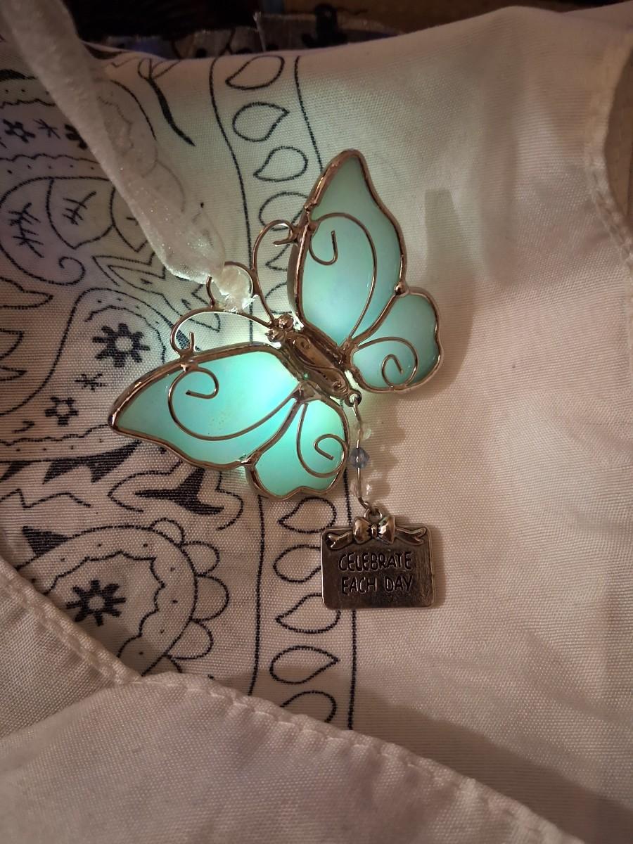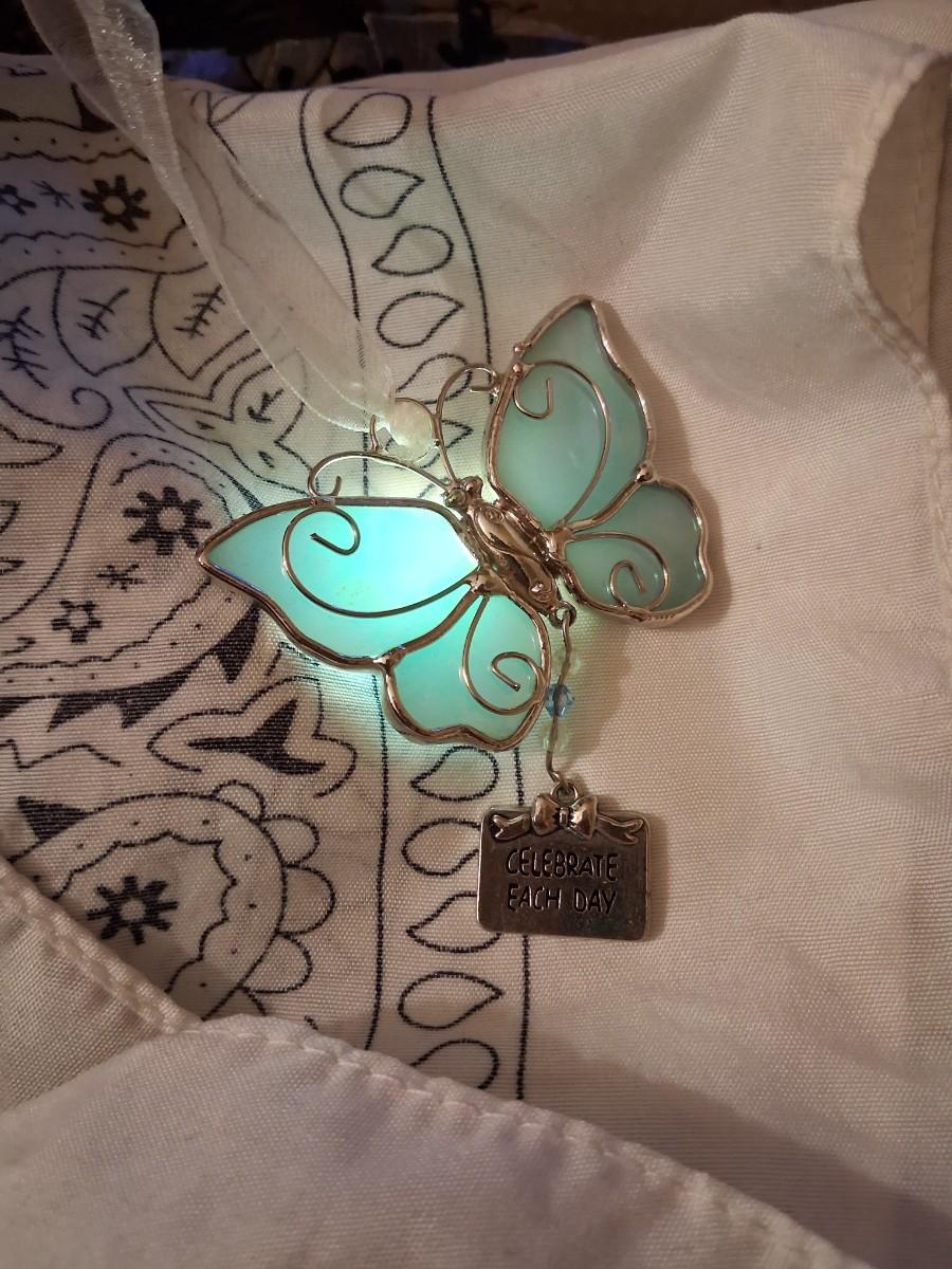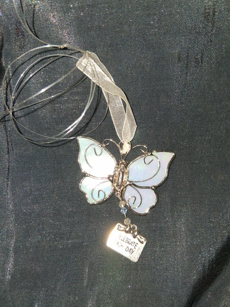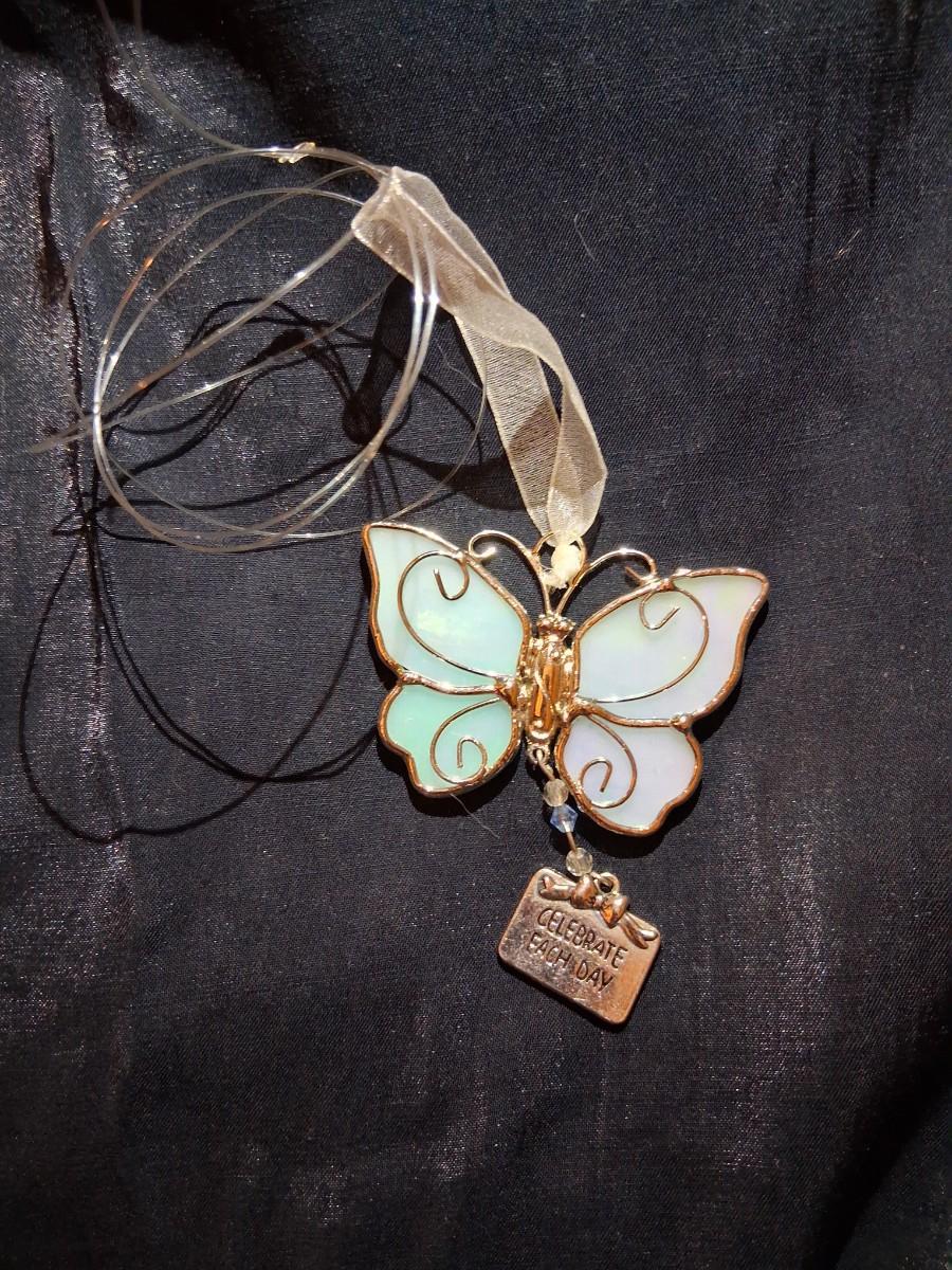 Beautiful Slag Glass with Blues, Purples & Pinks as it spins. Silver tone wire work accents this beautiful piece with a dangle plaque that reads "Celebrate Each Day" Excellent like New Condition