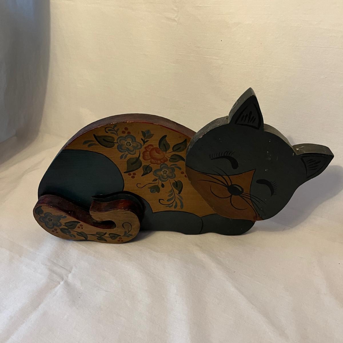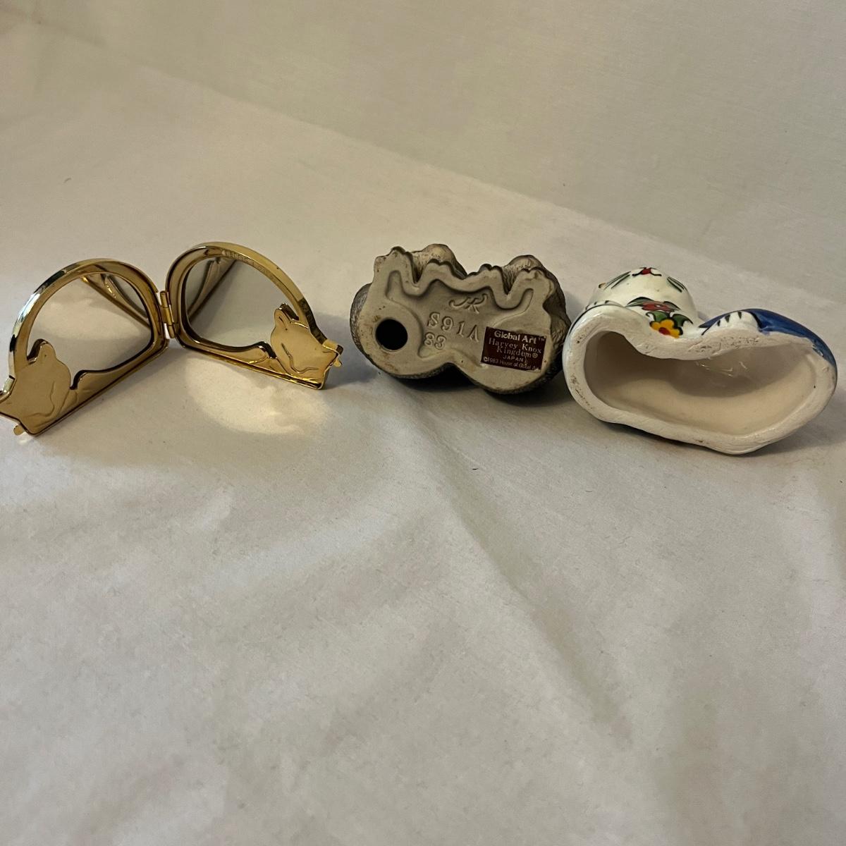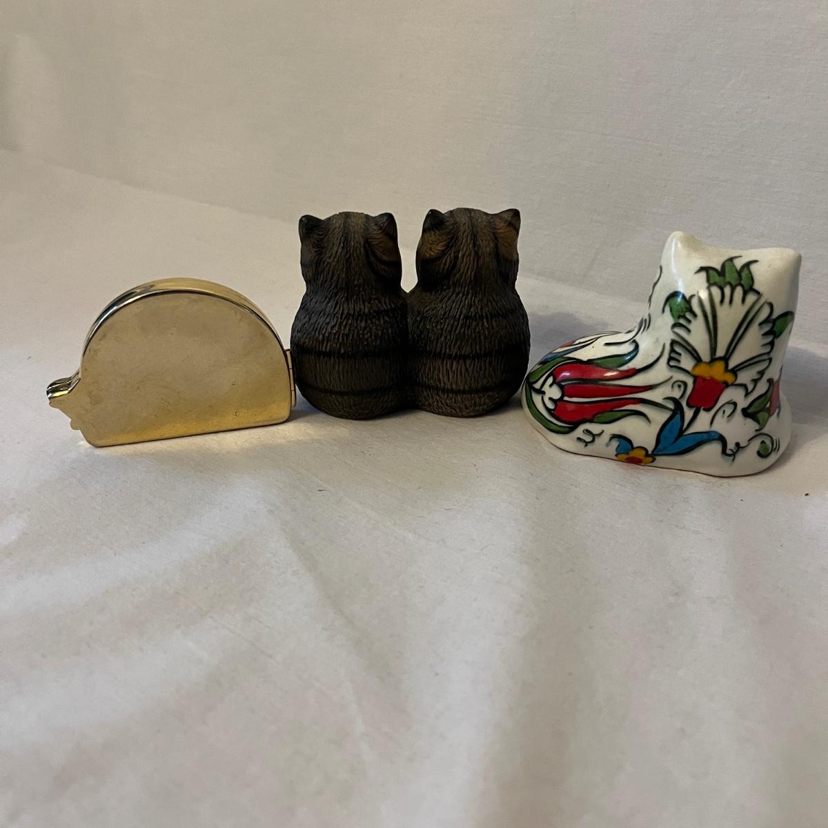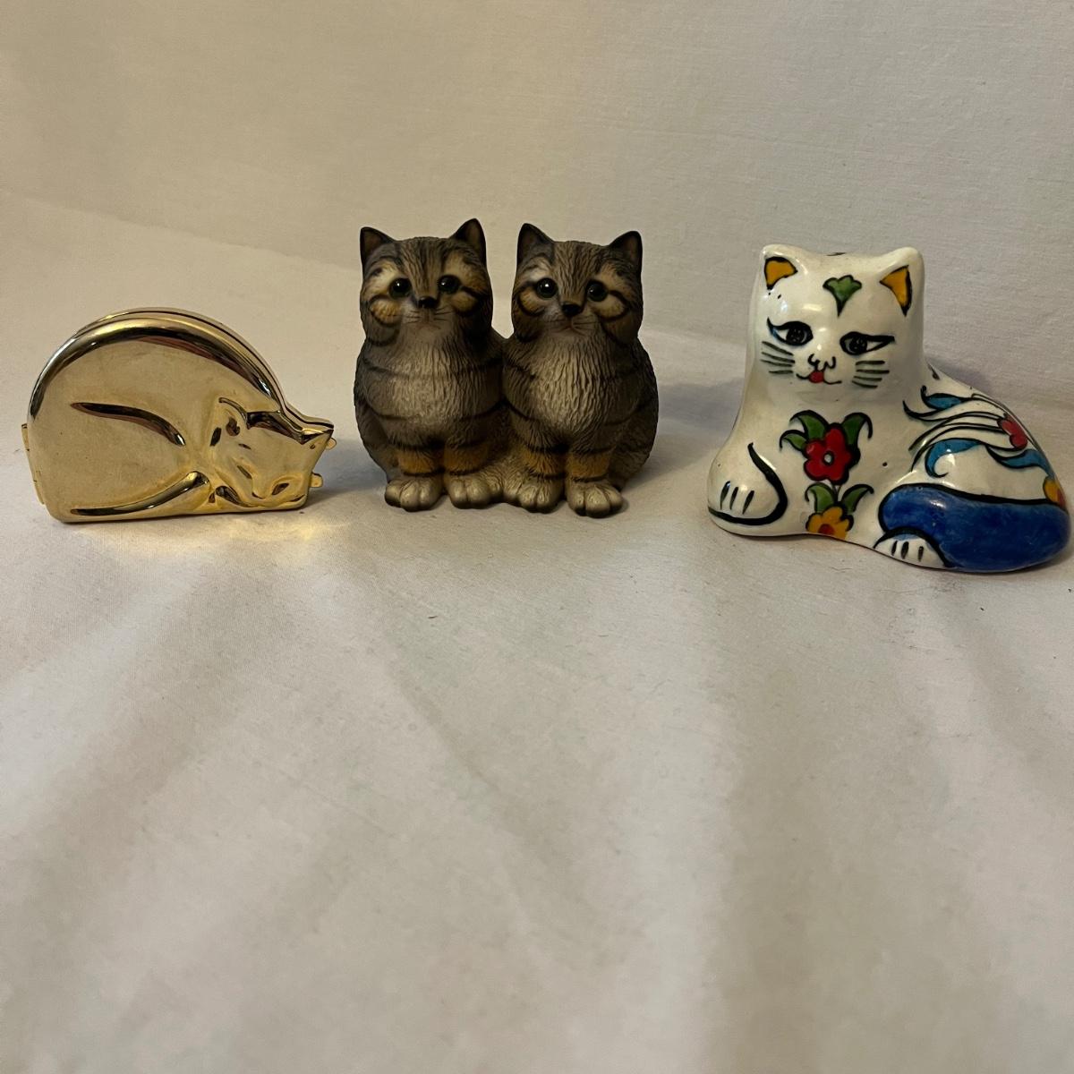 Lot includes a stained glass window hanging, two ceramic cats, Lizzie High figurine, two cast iron cats (note marks on what cat which might come off with cleaning), wooden cat, gold colored cat shaped folding mirror.