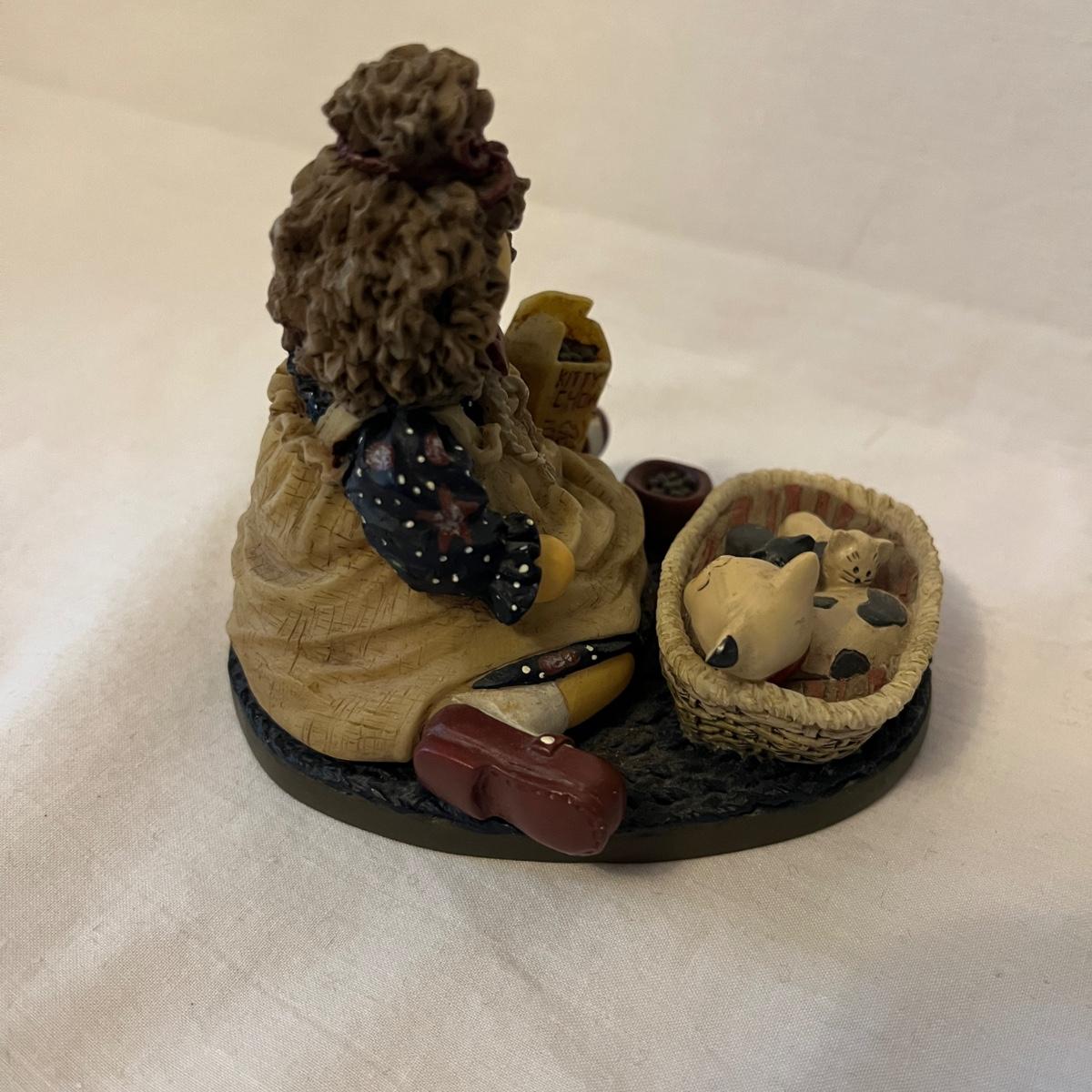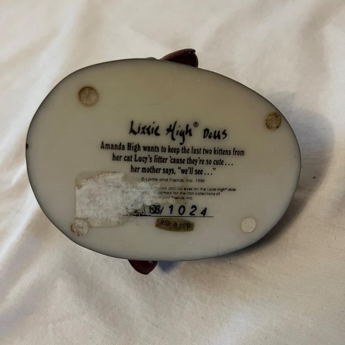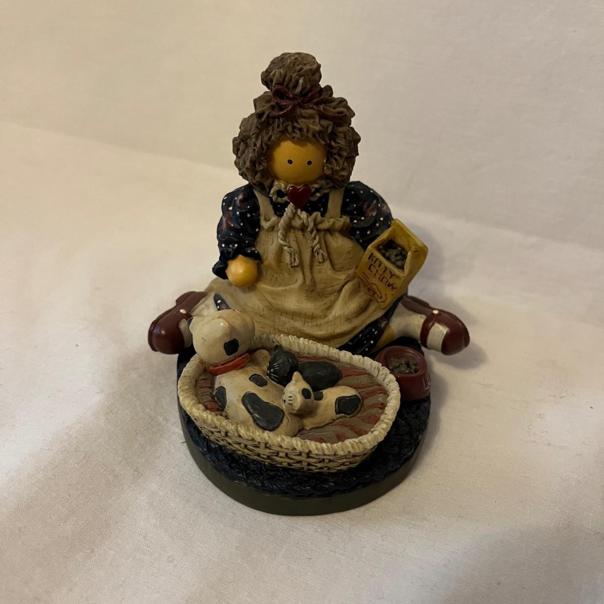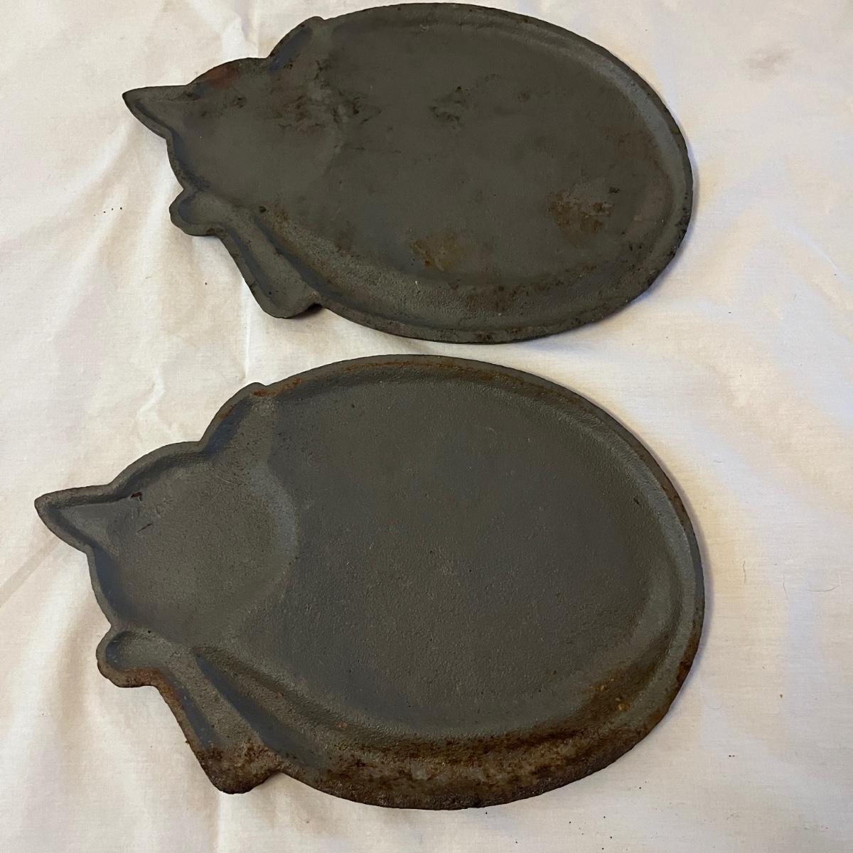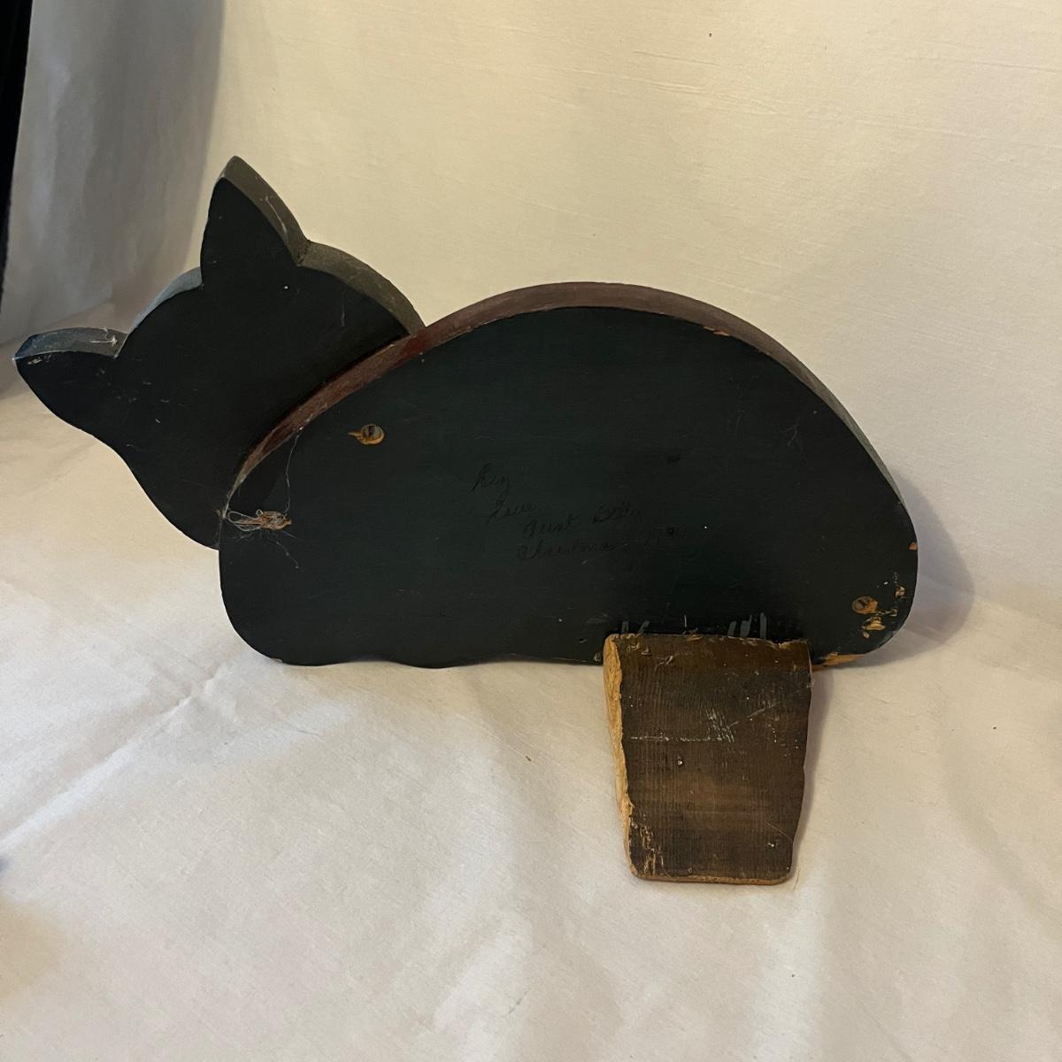 Lot includes a stained glass window hanging, two ceramic cats, Lizzie High figurine, two cast iron cats (note marks on what cat which might come off with cleaning), wooden cat, gold colored cat shaped folding mirror.