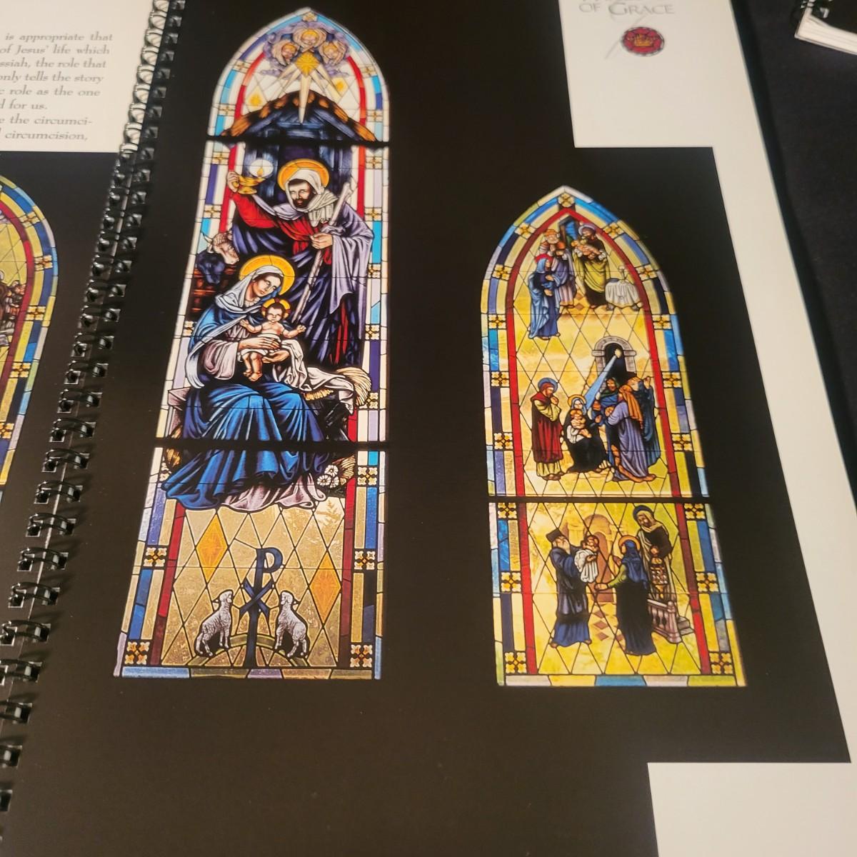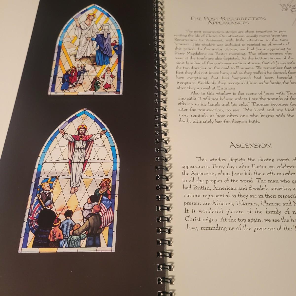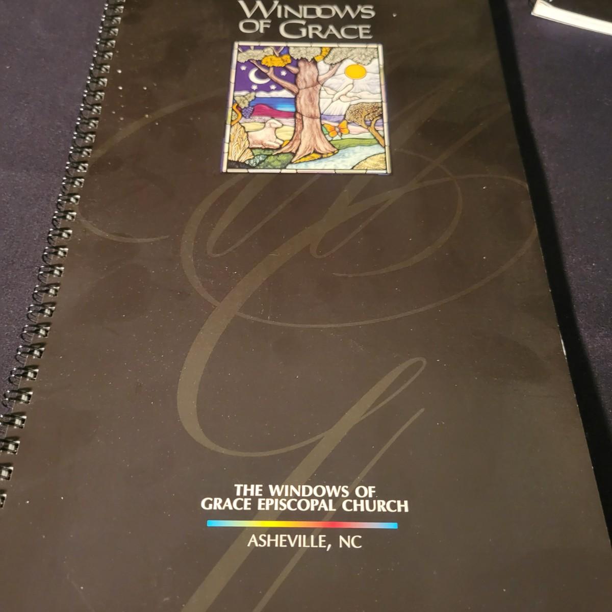 An assortment of crosses, books, and a figurine in good condition with no notable damage. Included are two wooden crosses, the largest measuring 8.5" x 14" x .5". Also includes three small crosses made of stained glass, a small pewter monk candleholder, and two books about the stained glass of The Windows of Grace Episcopal Church. Shipping available