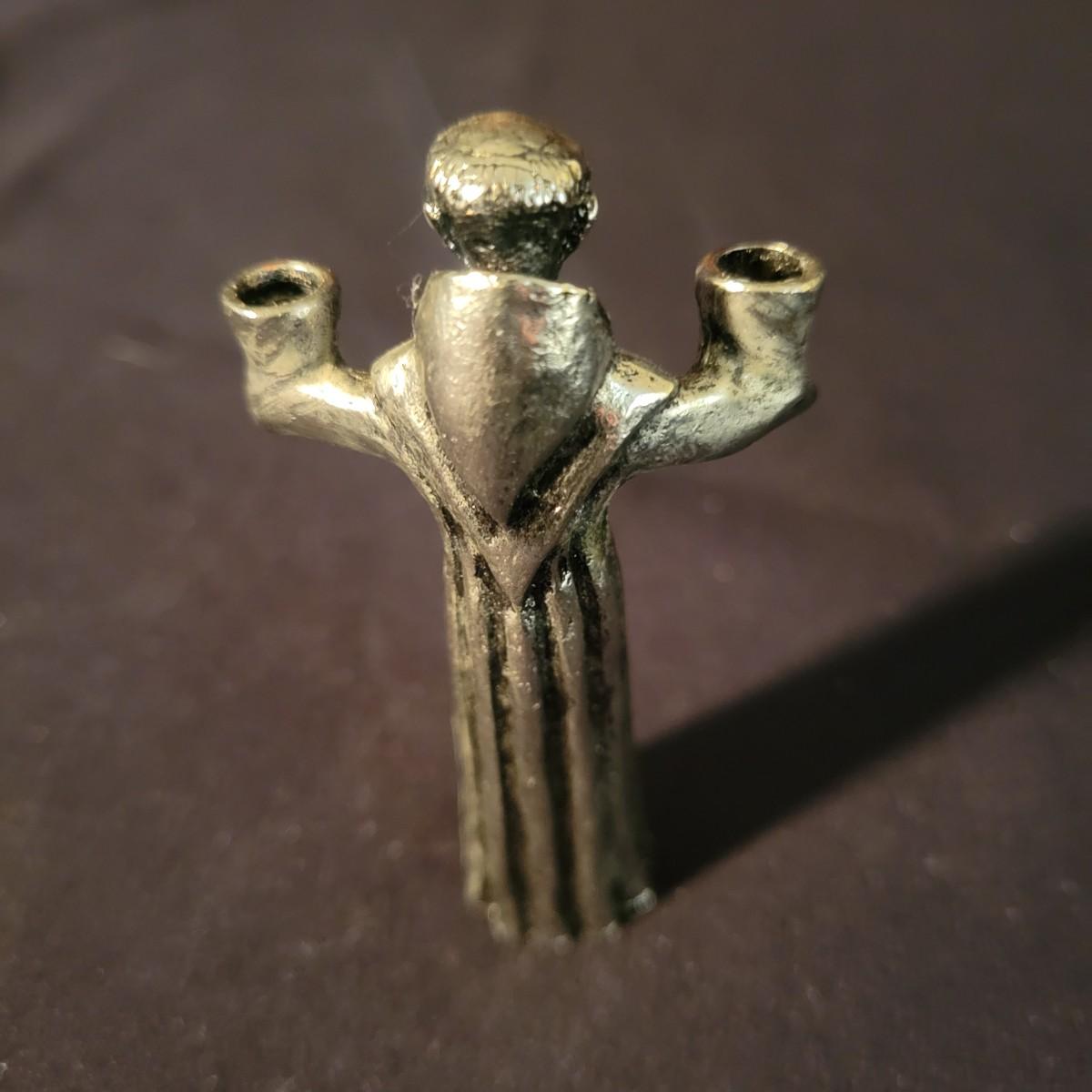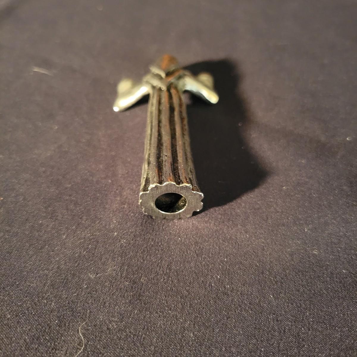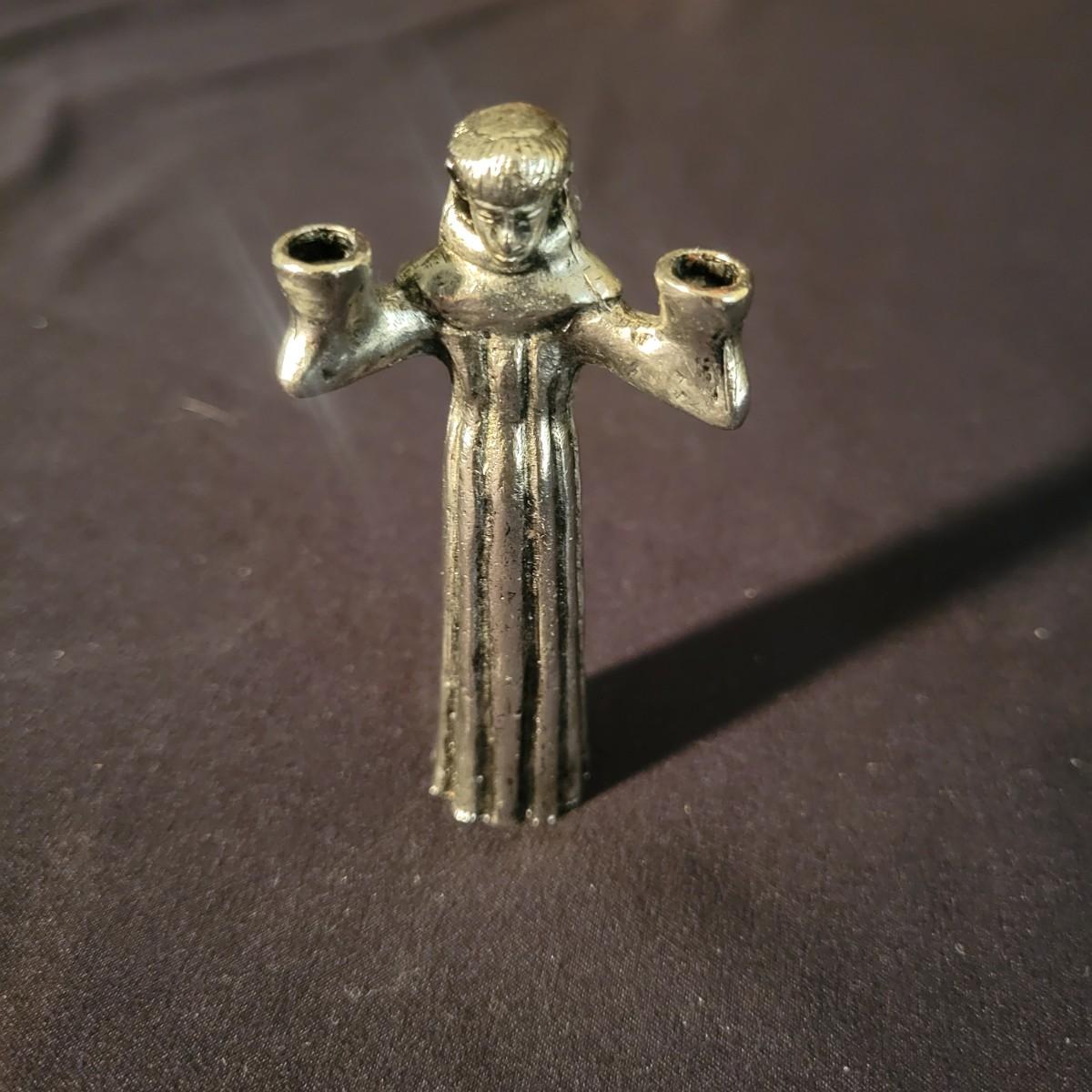 An assortment of crosses, books, and a figurine in good condition with no notable damage. Included are two wooden crosses, the largest measuring 8.5" x 14" x .5". Also includes three small crosses made of stained glass, a small pewter monk candleholder, and two books about the stained glass of The Windows of Grace Episcopal Church. Shipping available