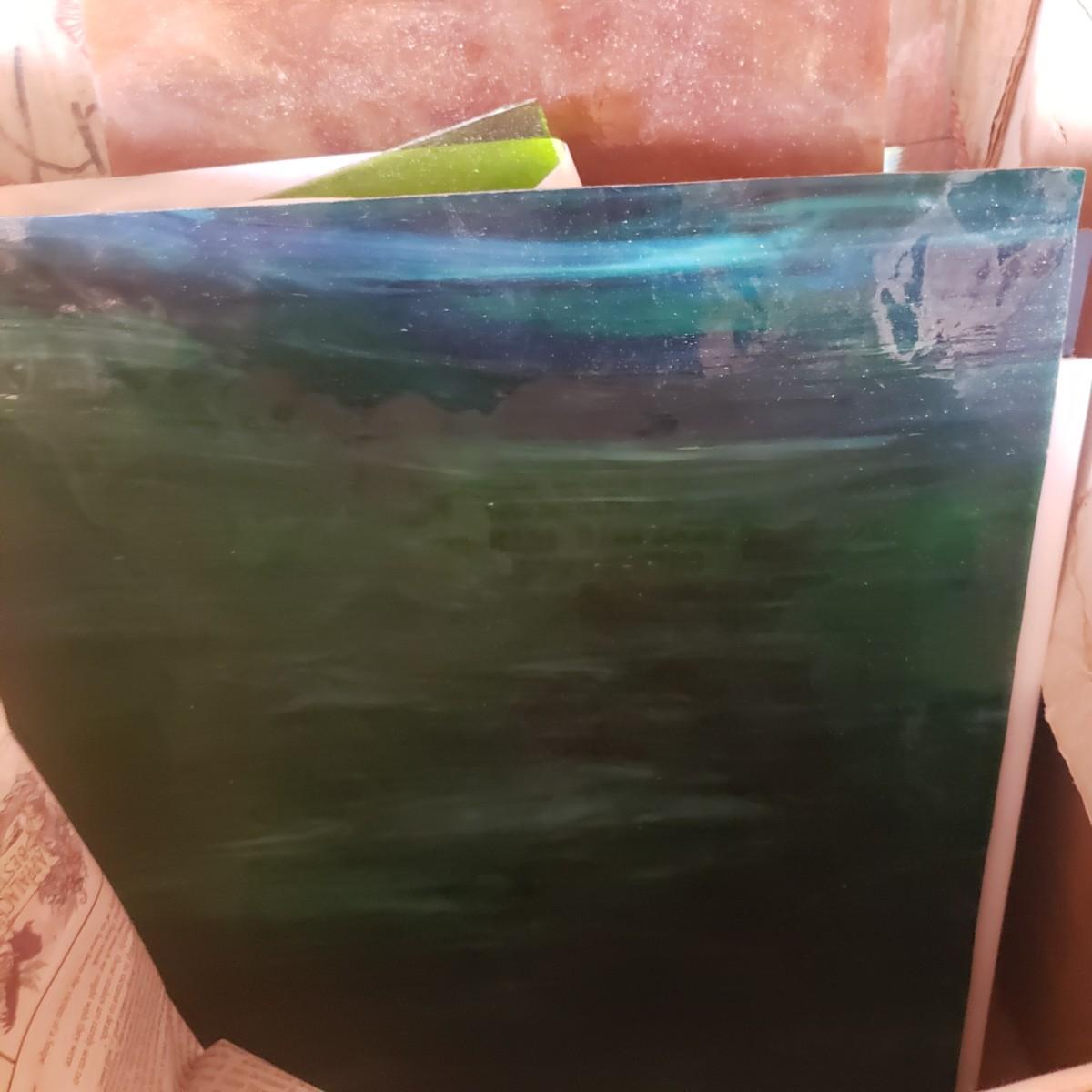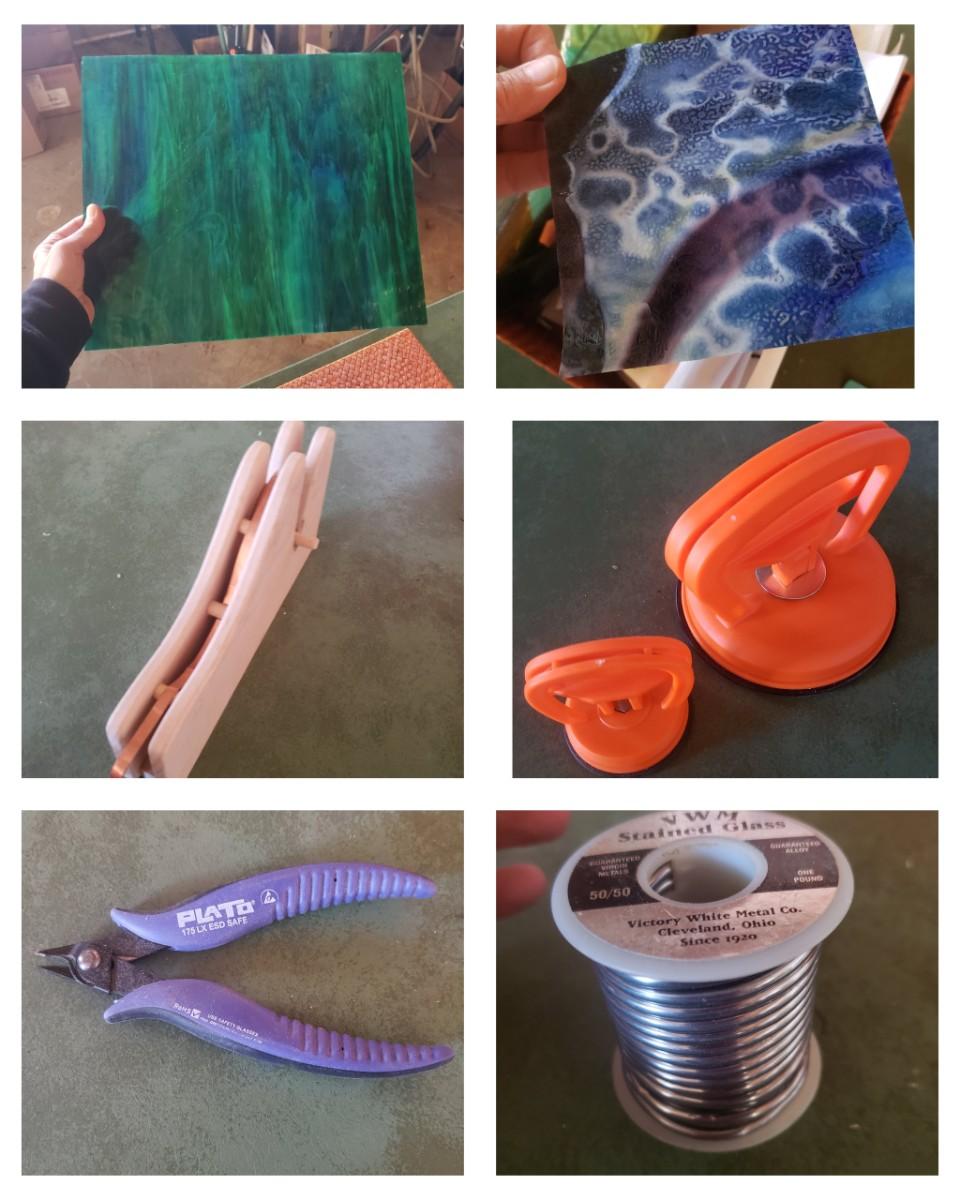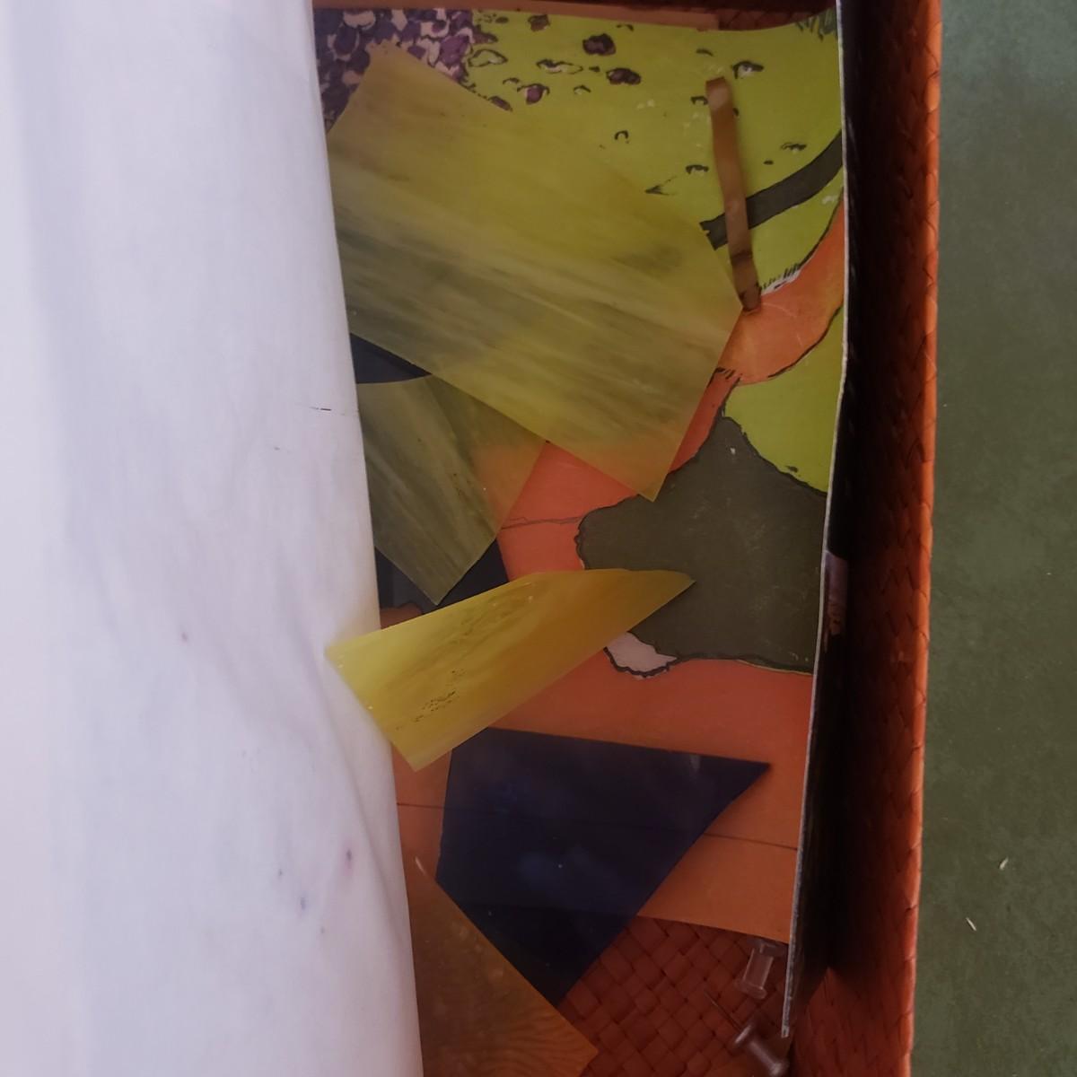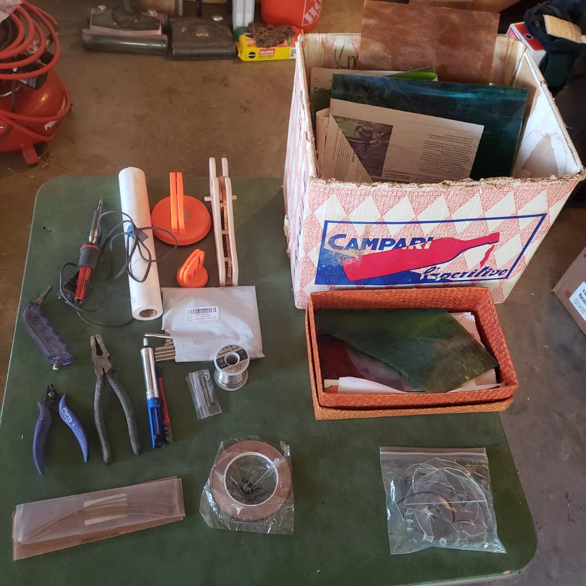 This stained glass lot has everything you need to start the process! There are tools and glass to get you going. The box of glass has sheets and pieces. The largest piece measuring 14" x 12". There is a rectangular basket layered with small pieces between paper, see pictures. There is a handmade copper foil dispenser! See pictures for details.