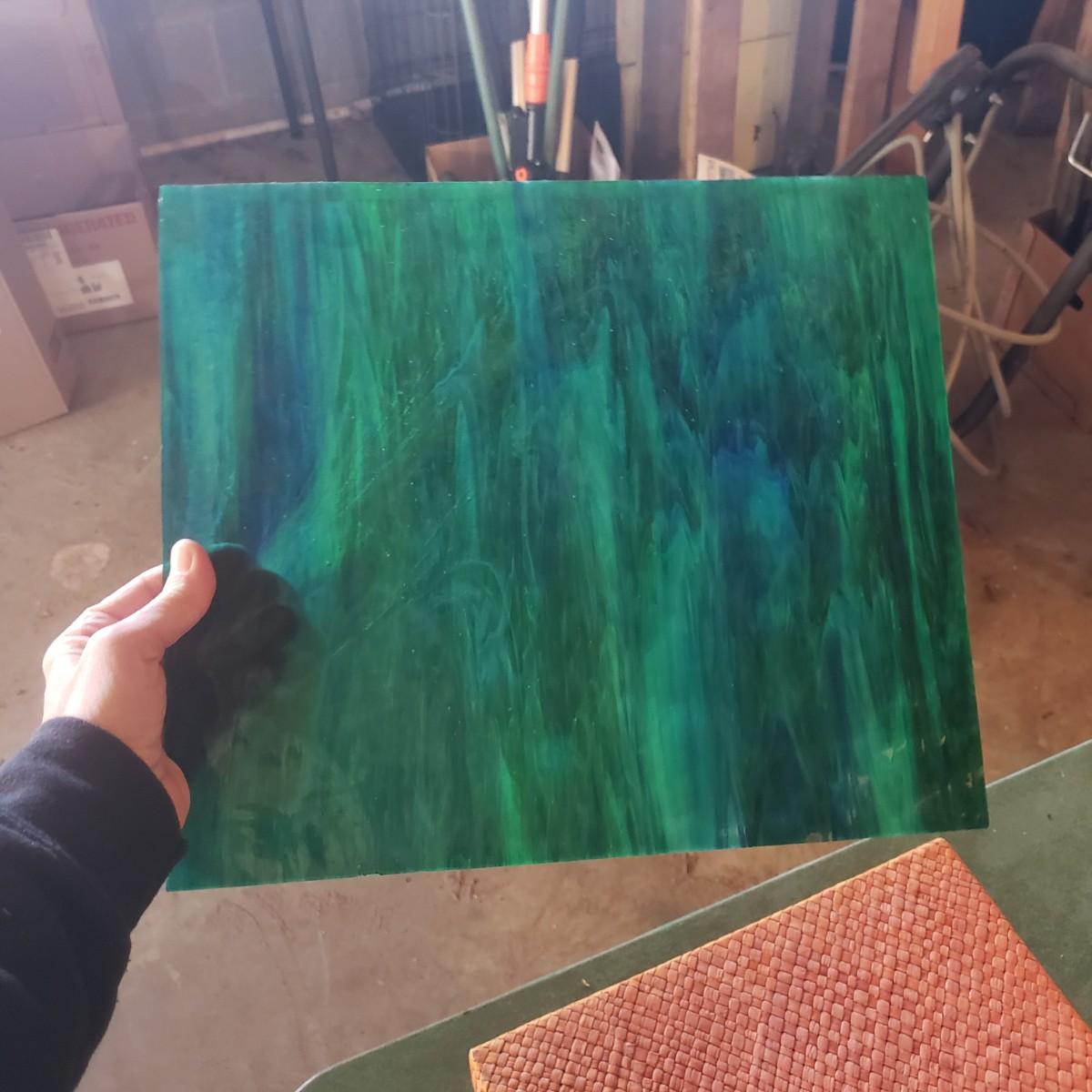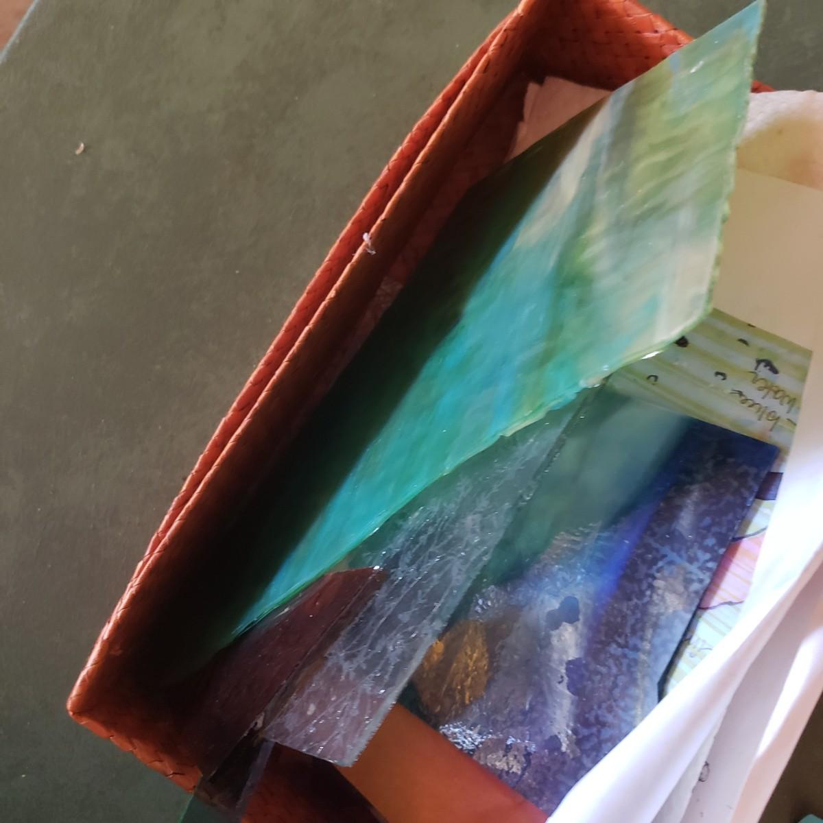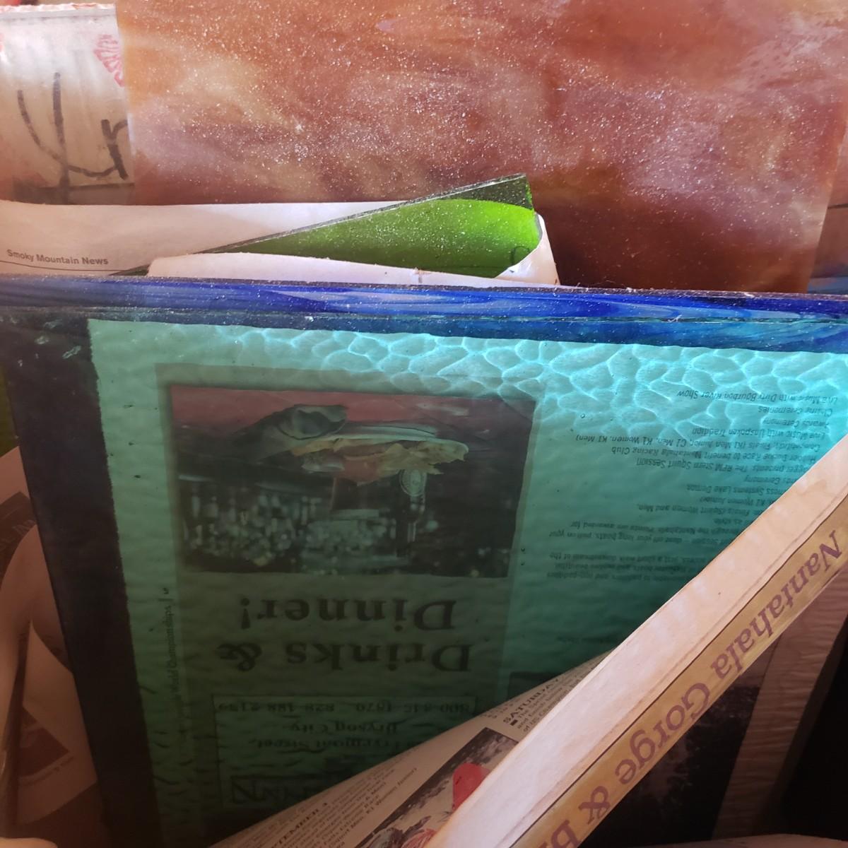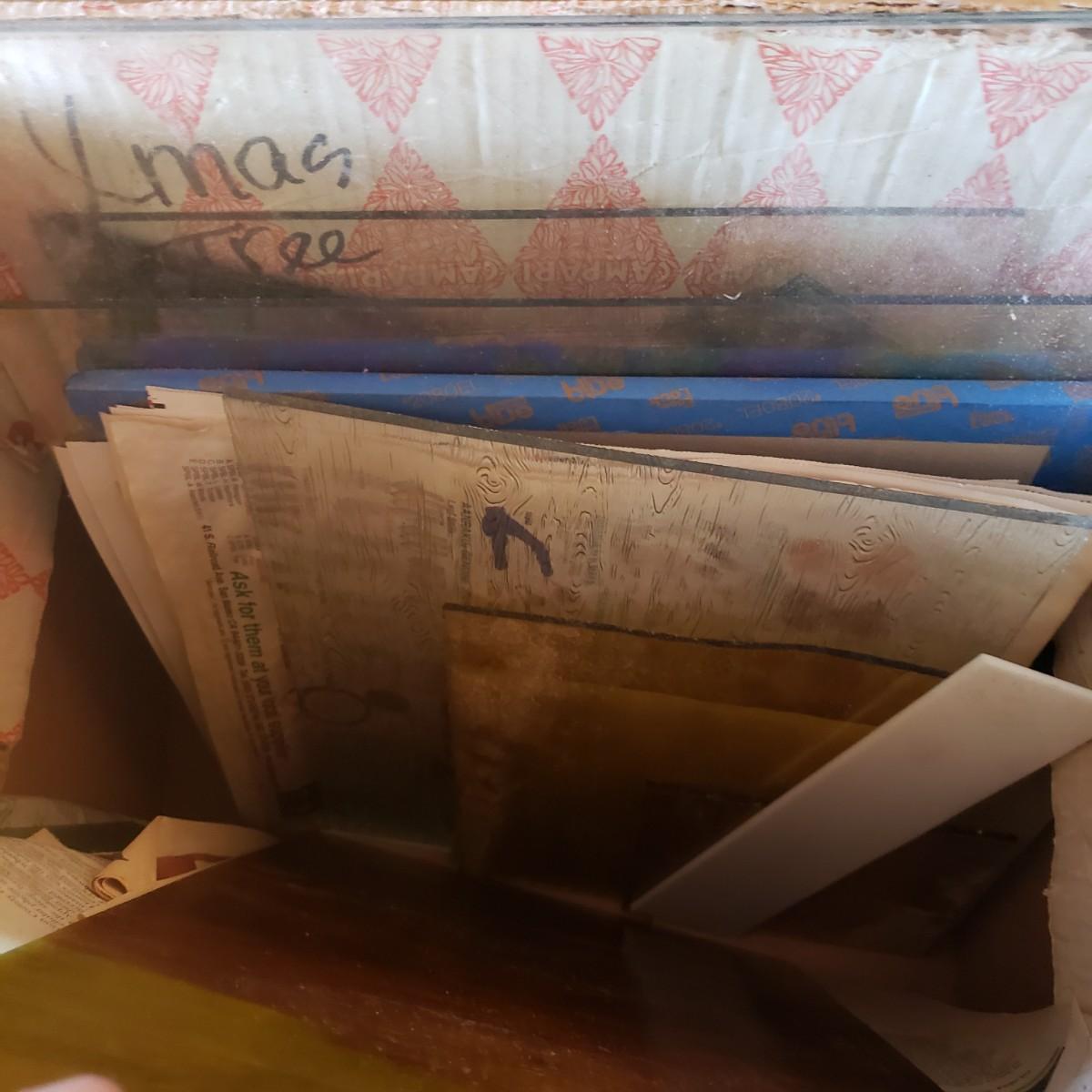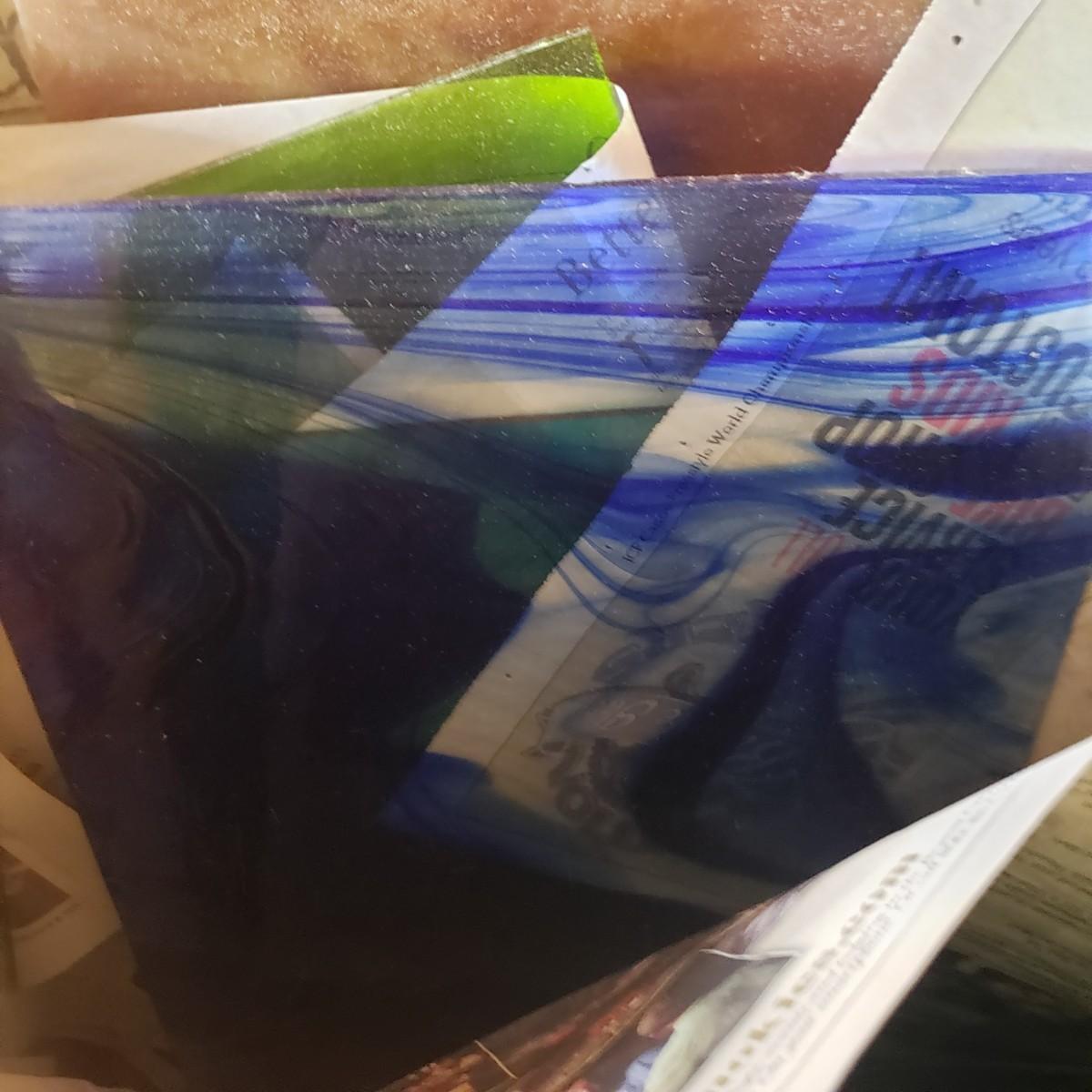This stained glass lot has everything you need to start the process! There are tools and glass to get you going. The box of glass has sheets and pieces. The largest piece measuring 14" x 12". There is a rectangular basket layered with small pieces between paper, see pictures. There is a handmade copper foil dispenser! See pictures for details.