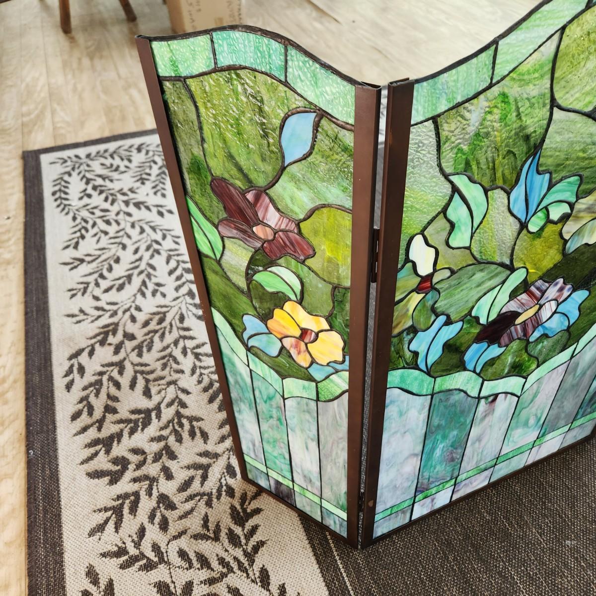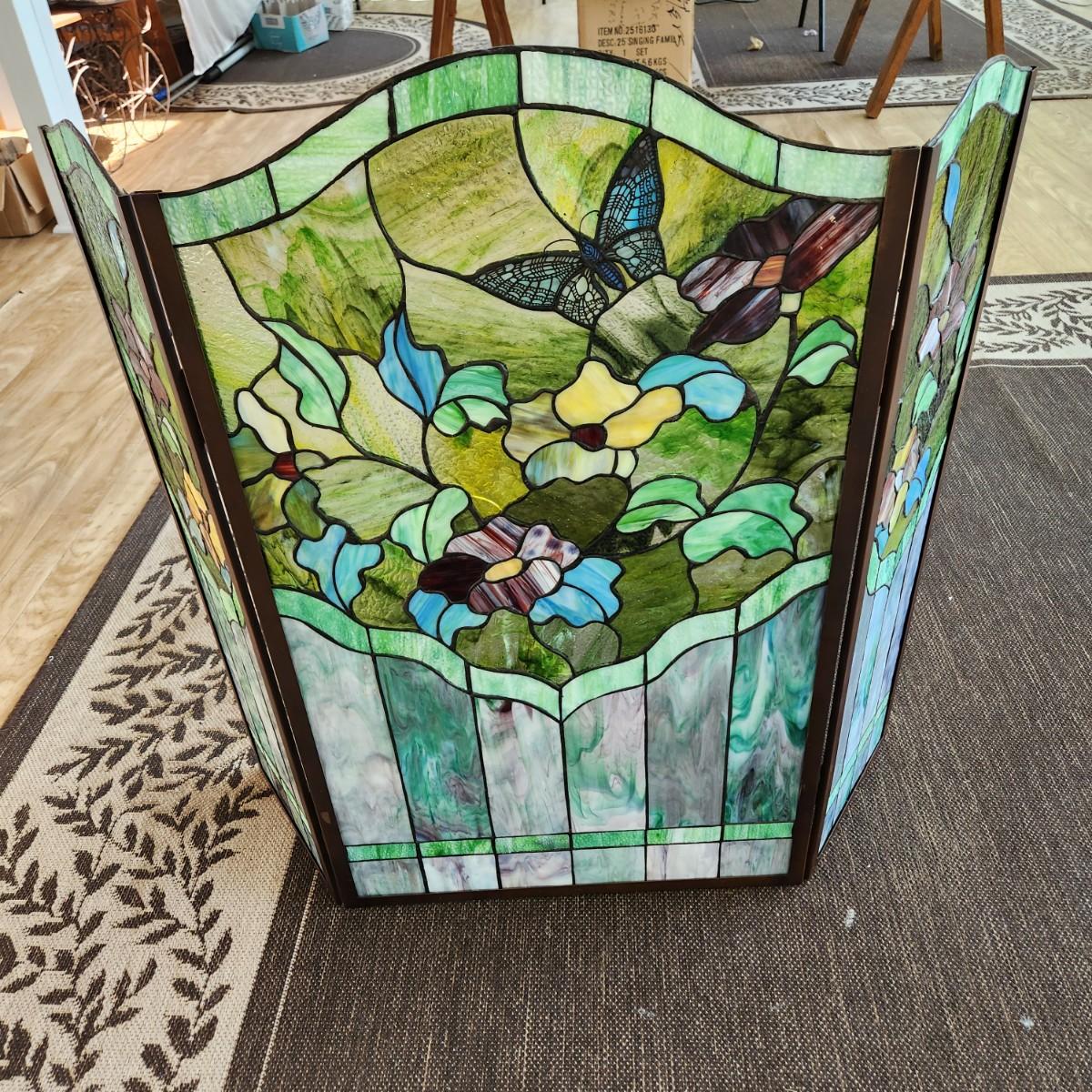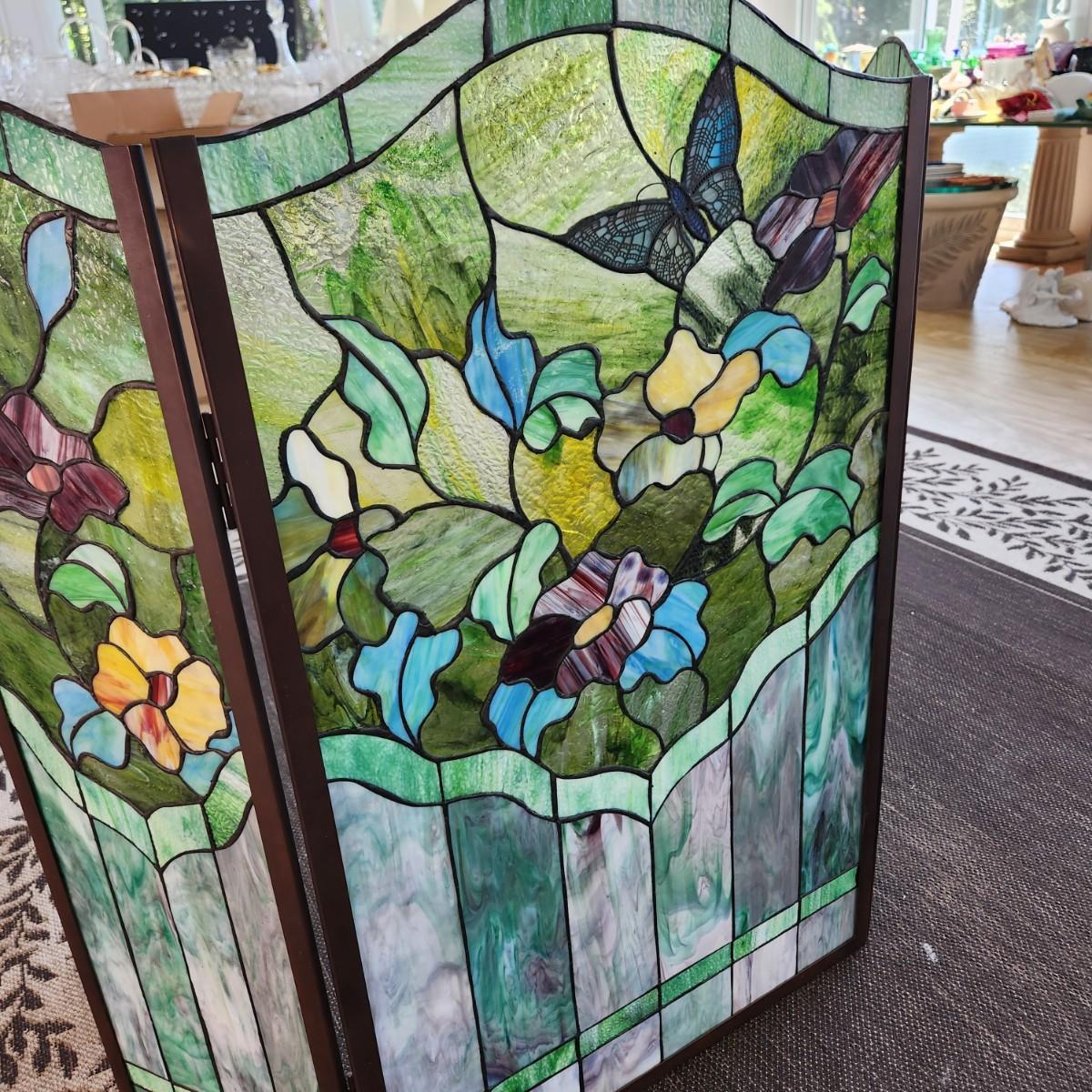 Heavy Stained Glass Fireplace Screen Flowers Butterfly 50"×34"h
