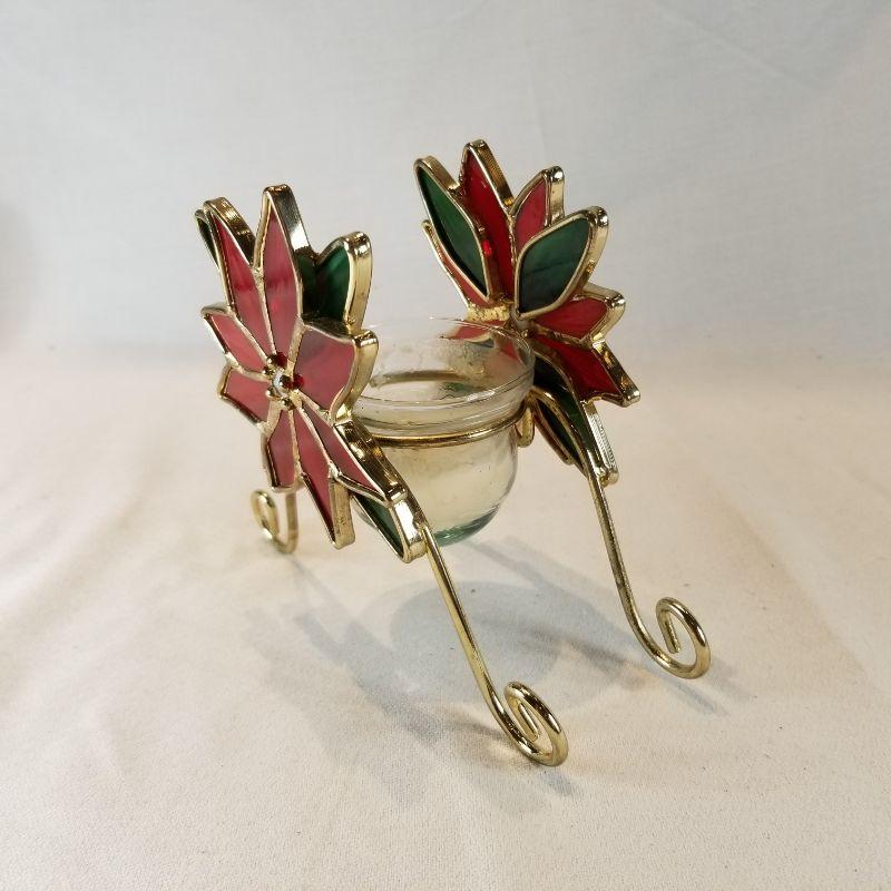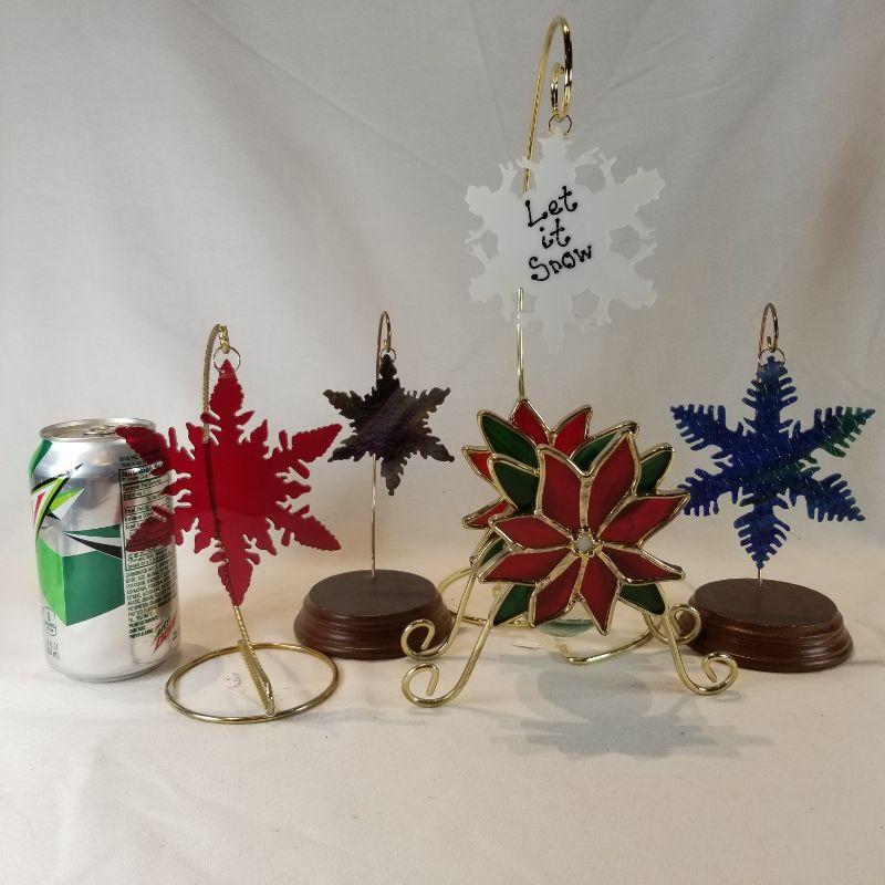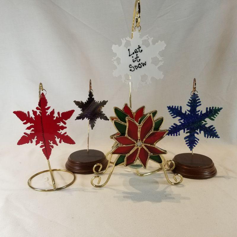 This is a nice collection of stained glass ornaments with a votive holder. The four stained glass snowflake ornaments were made by a local artist and are very pretty and delicate. The stained glass votive holder is outlined in brass and really glows with a lit candle. It has a votive holder inside with a previously-lit candle. All are in very good condition. Snowflake stands are not included.