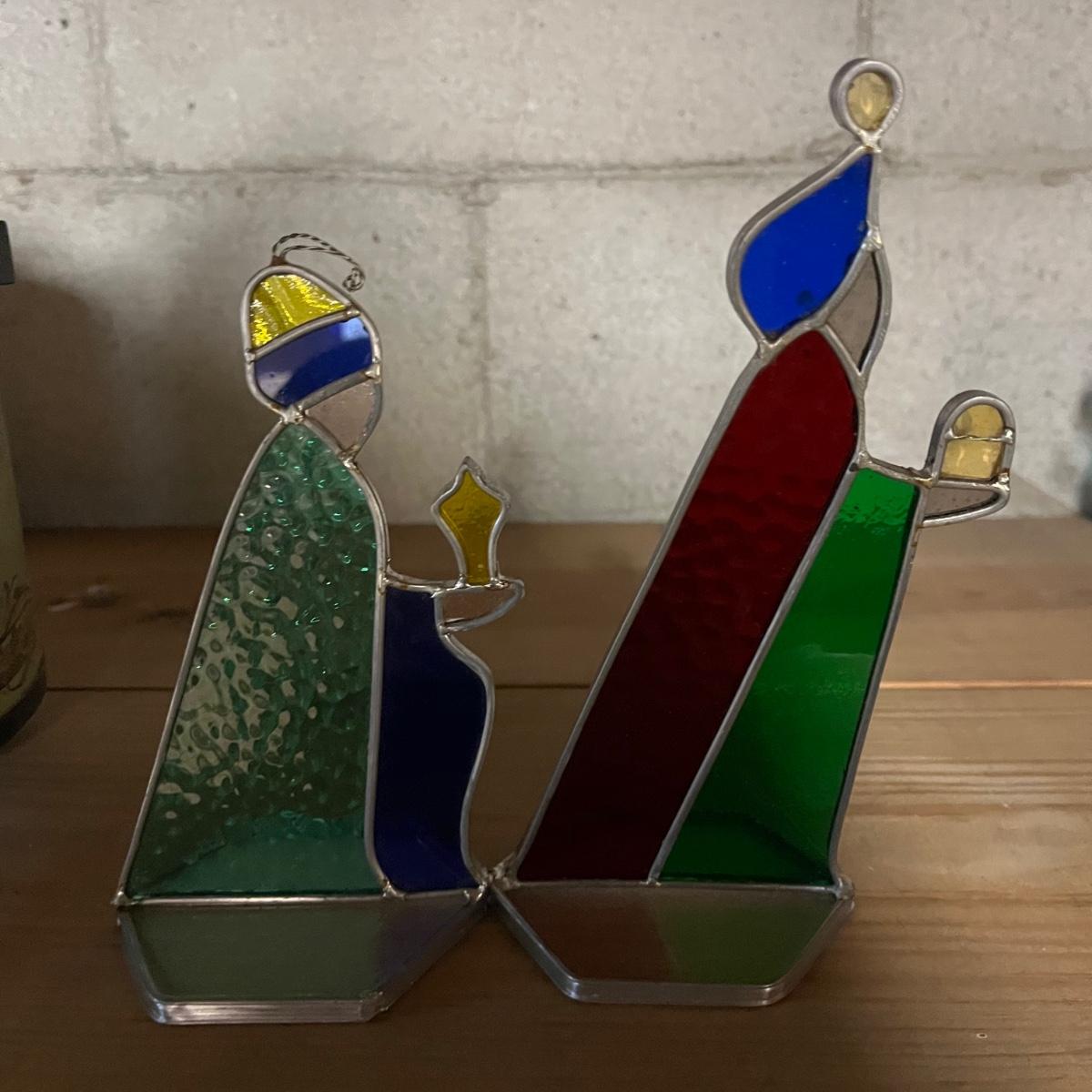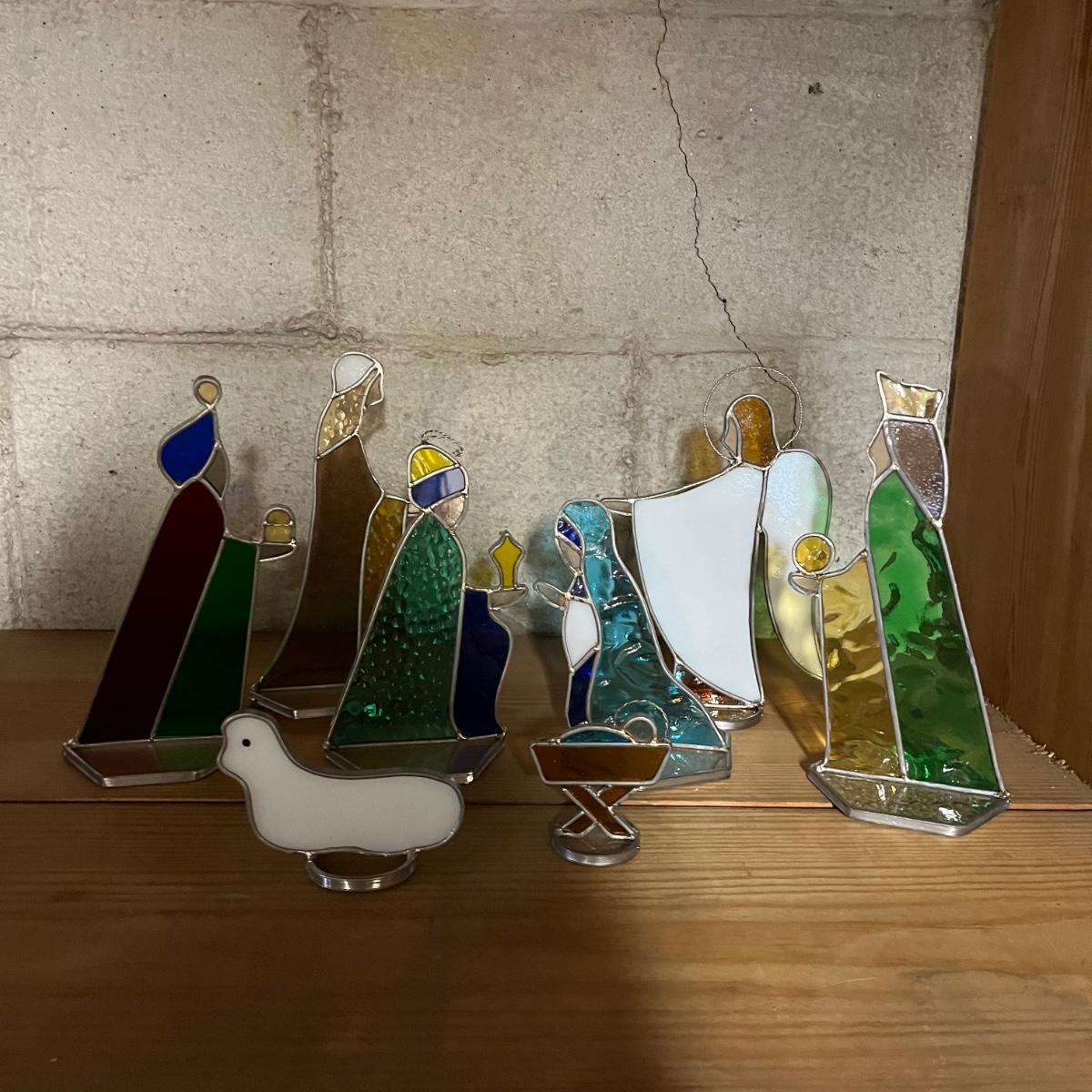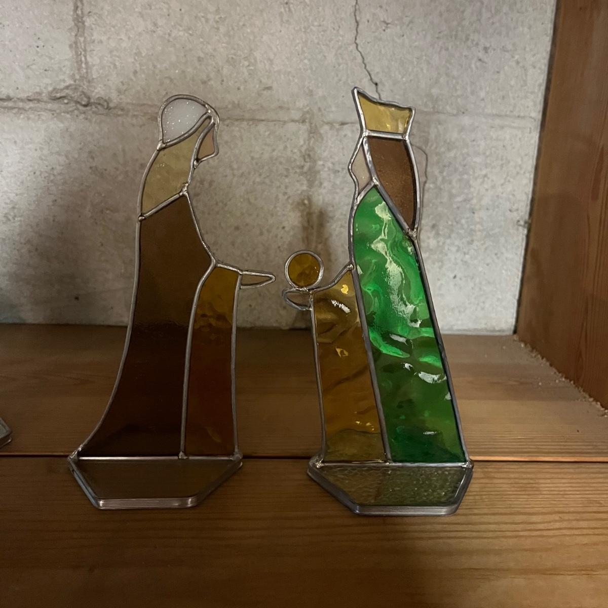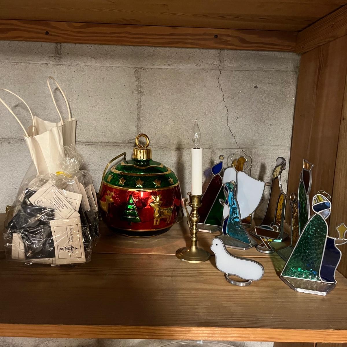 This Lot includes an eight piece stained glass nativity set, an ornament shaped jar, a brass candlestick lamp with extra beeswax cylinders and bulbs. The extra candlestick cylinders are beeswax. Ornament shaped jar measures 8”D x 10” tall. Lamp worked when tested.