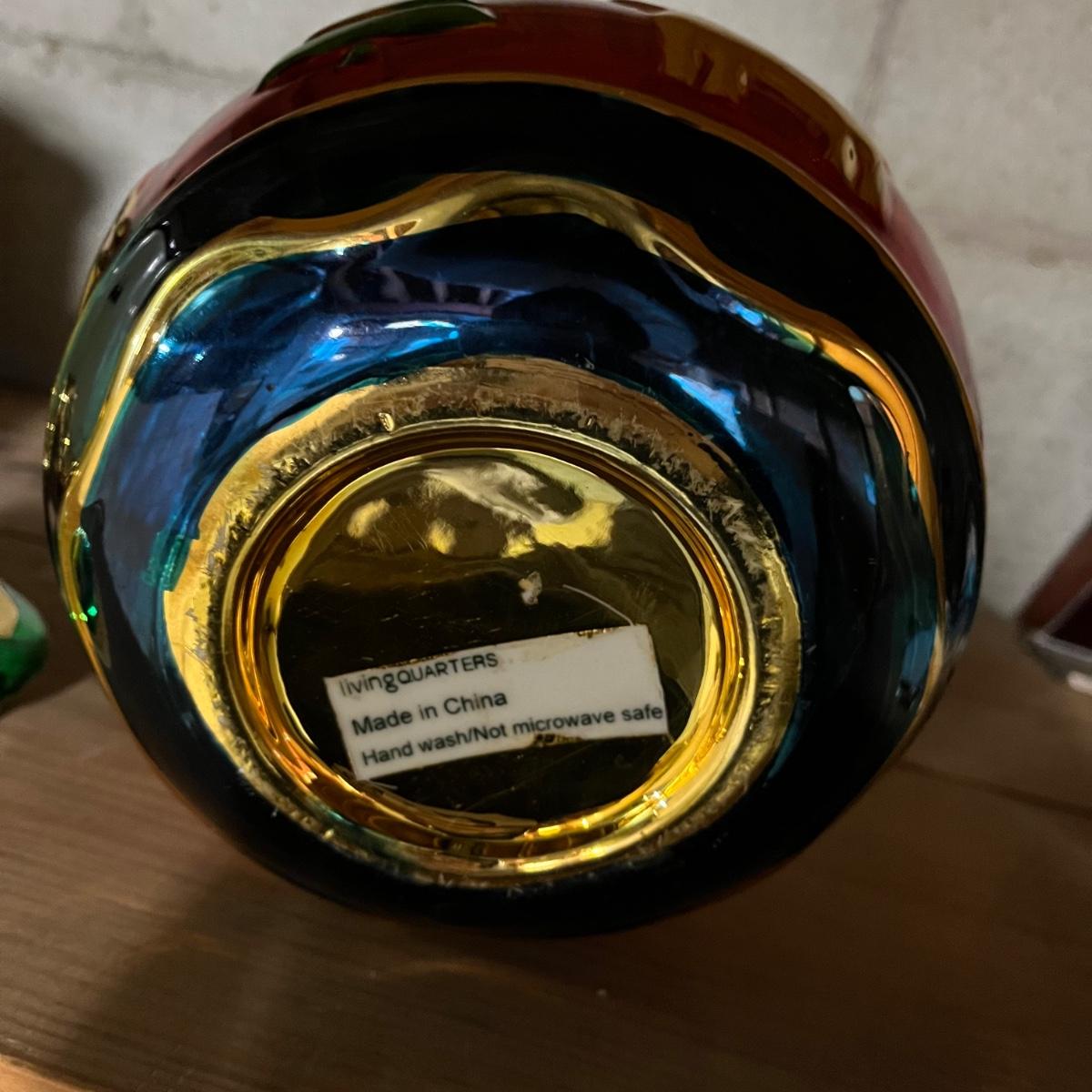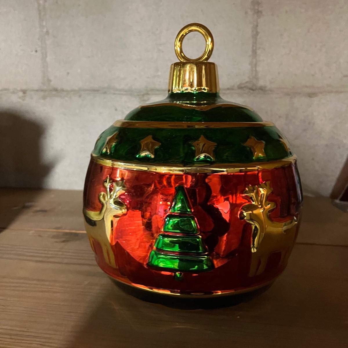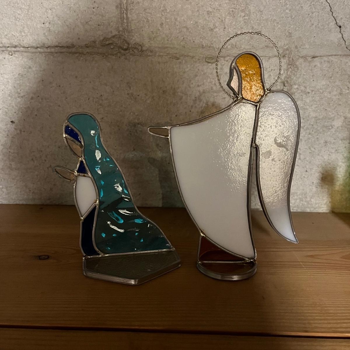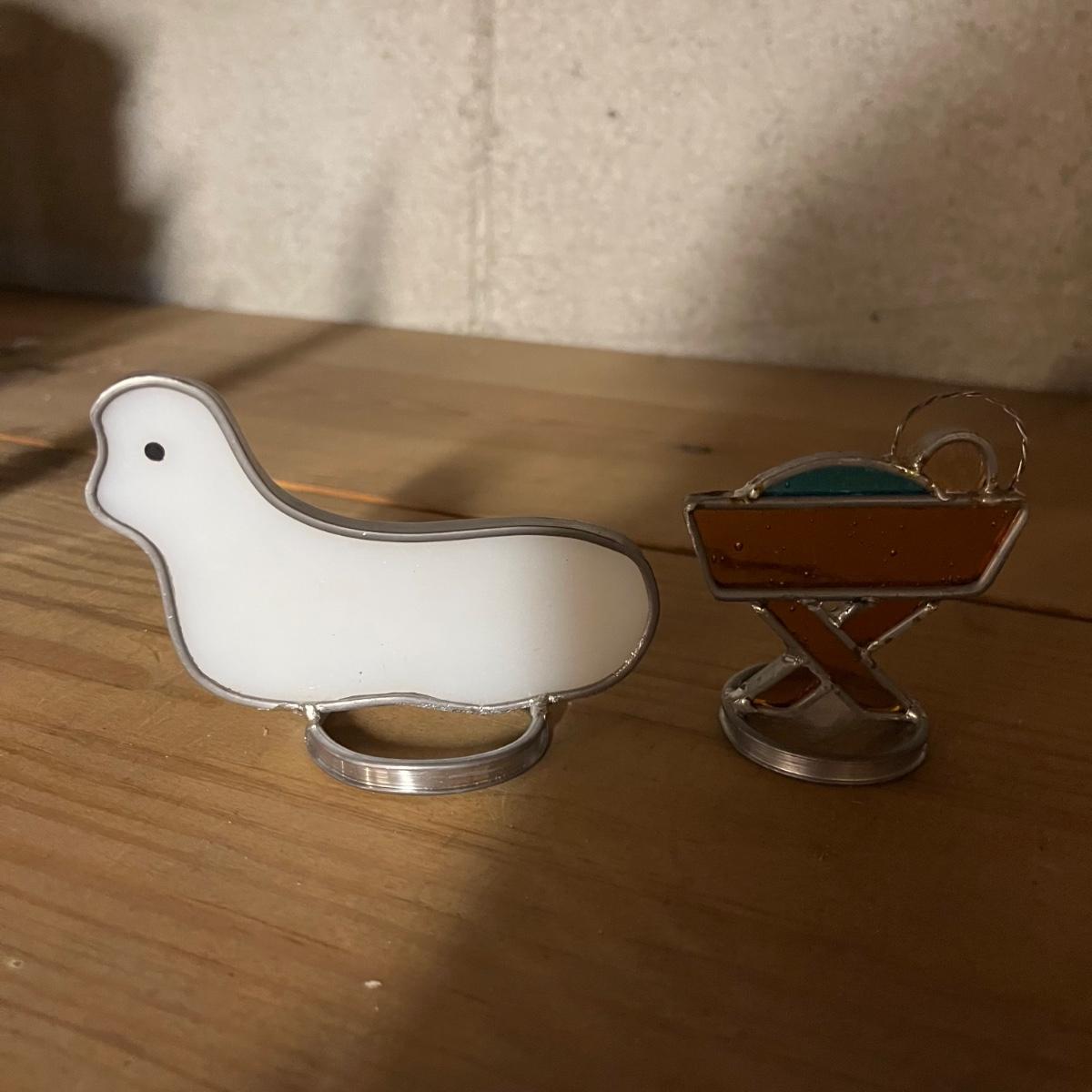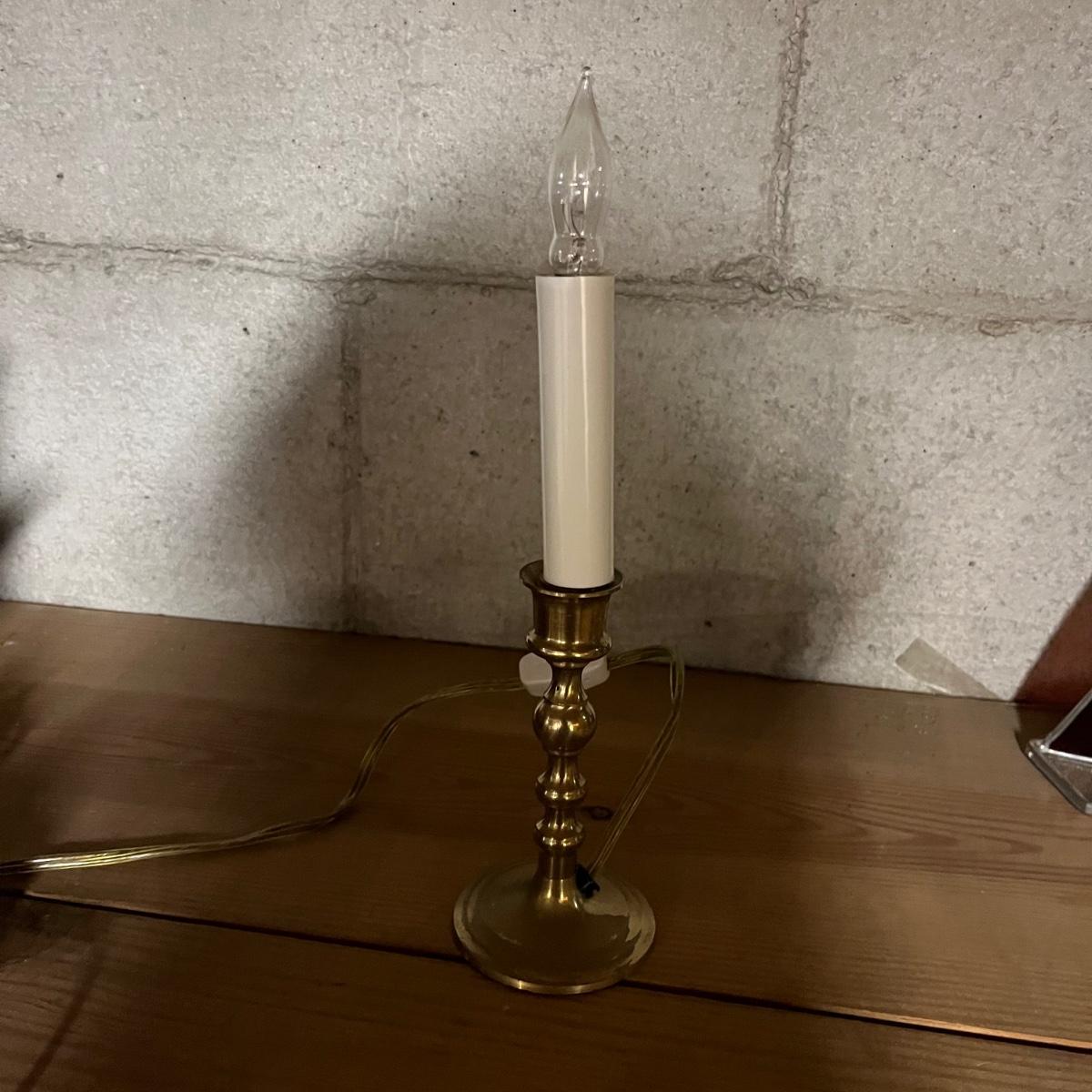 This Lot includes an eight piece stained glass nativity set, an ornament shaped jar, a brass candlestick lamp with extra beeswax cylinders and bulbs. The extra candlestick cylinders are beeswax. Ornament shaped jar measures 8”D x 10” tall. Lamp worked when tested.