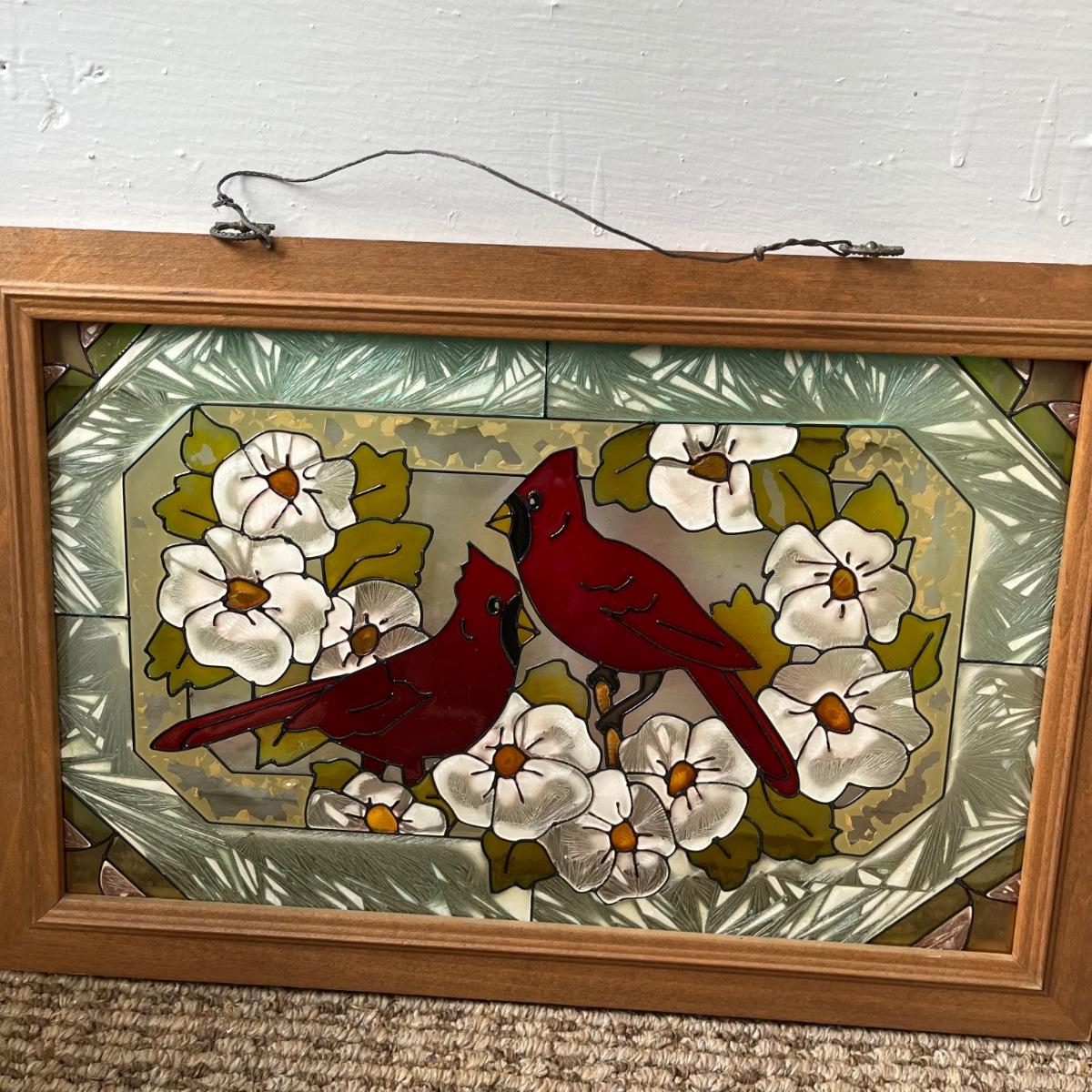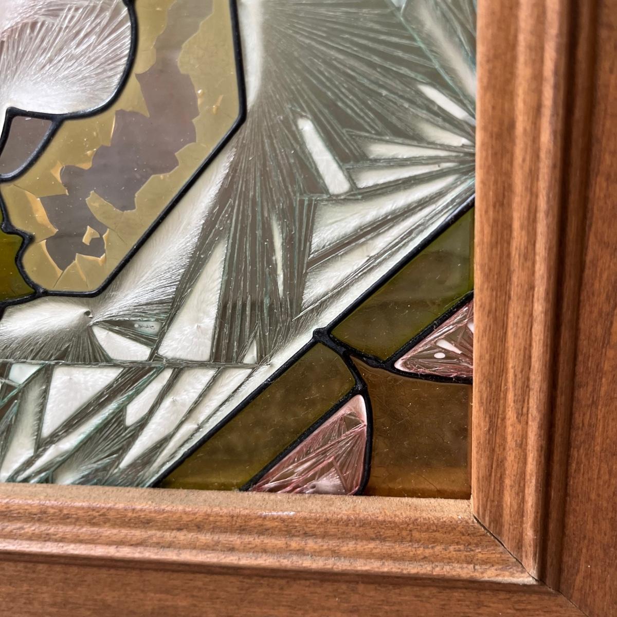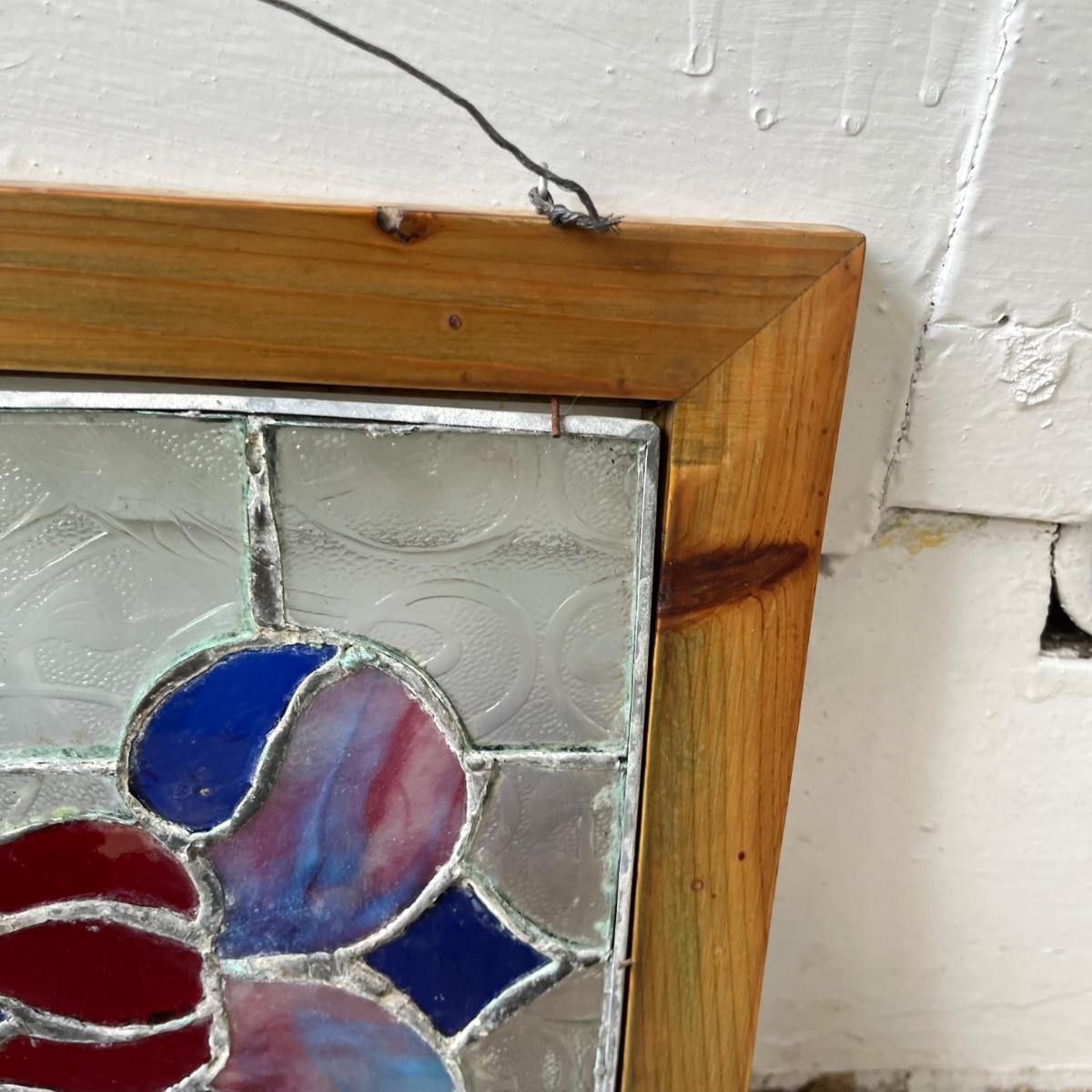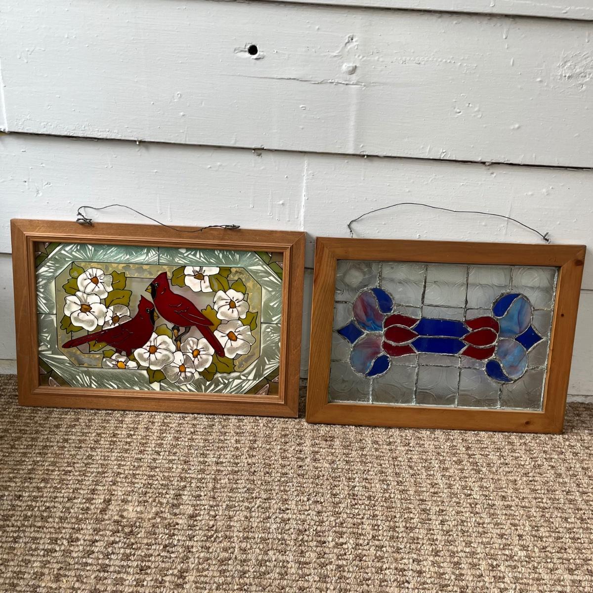 Lot includes a wooden framed stained glass piece of art and a painted glass mounted in a wooden frame. Largest frame measures 14” x 20.5”.