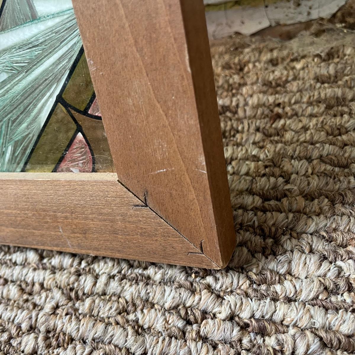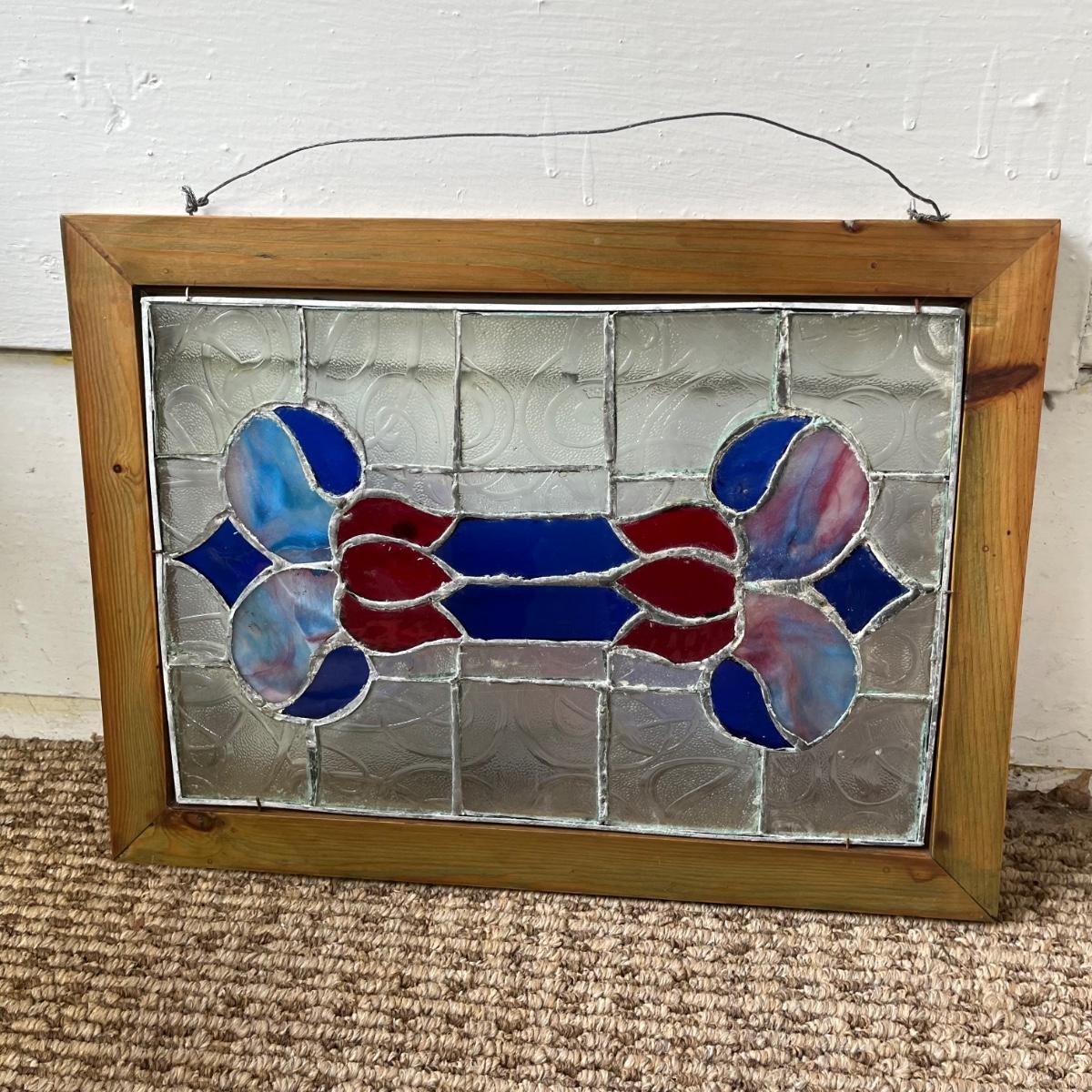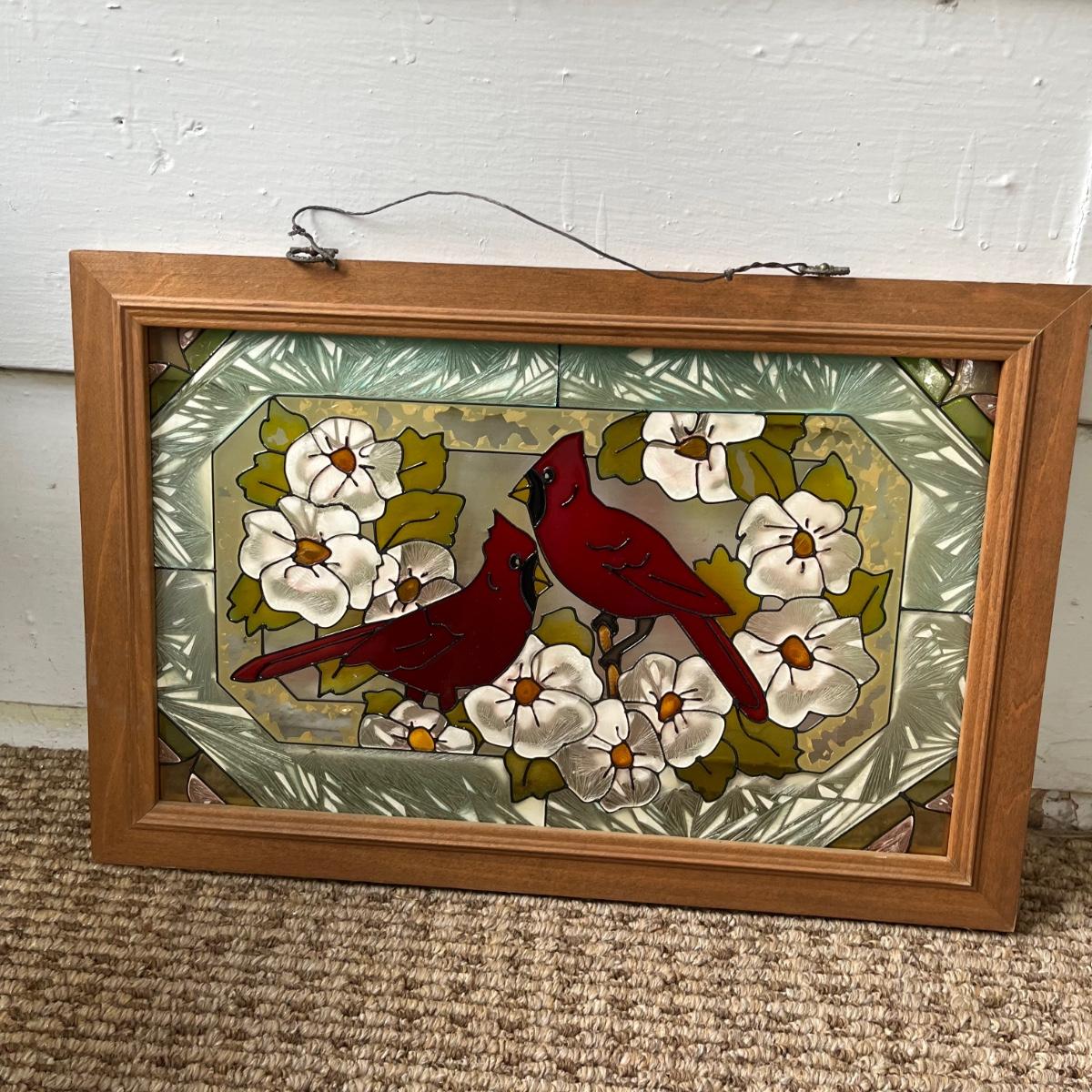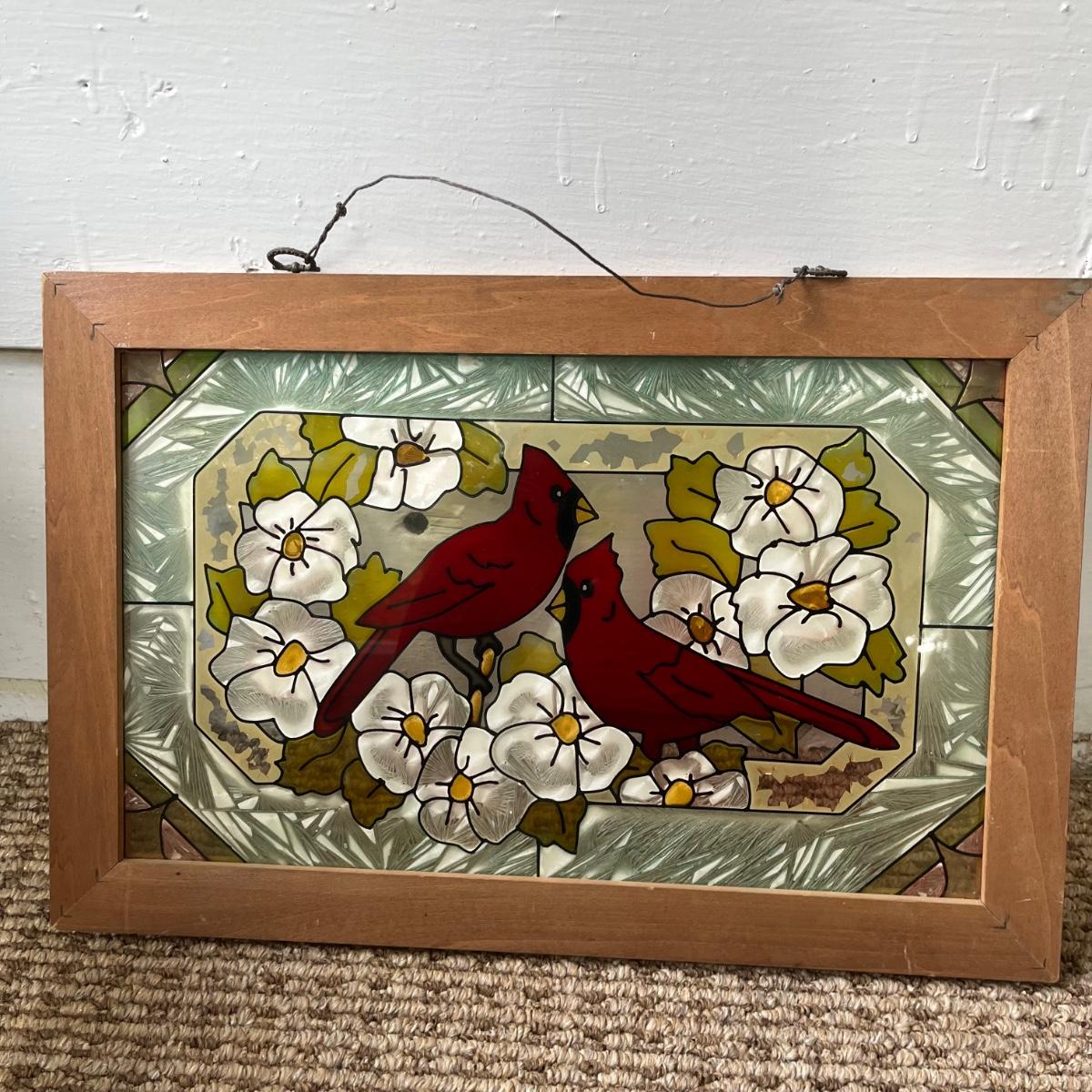 Lot includes a wooden framed stained glass piece of art and a painted glass mounted in a wooden frame. Largest frame measures 14” x 20.5”.