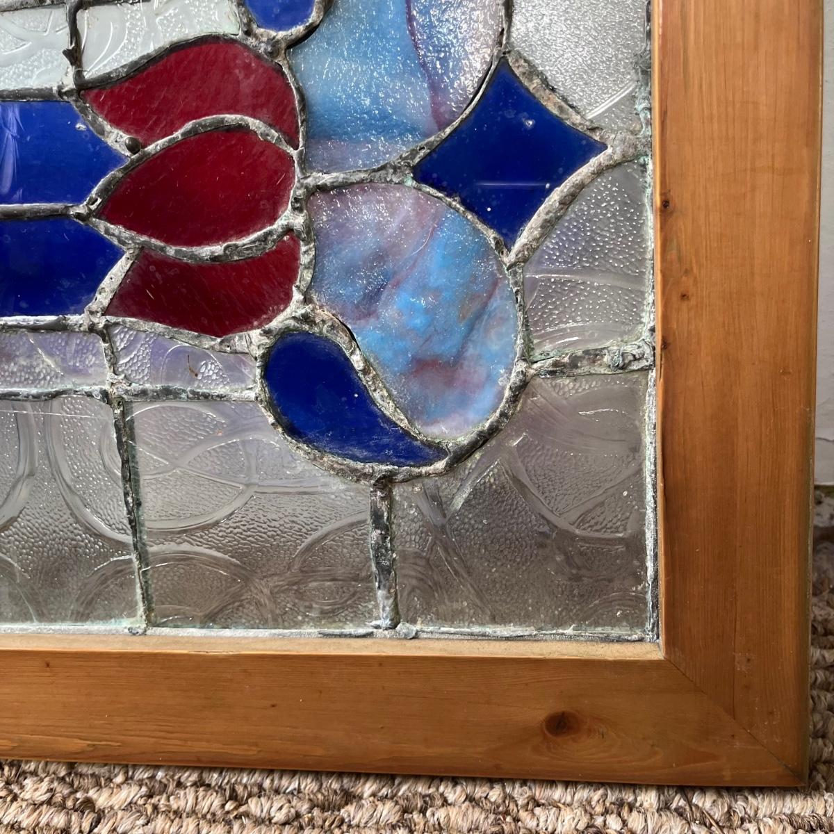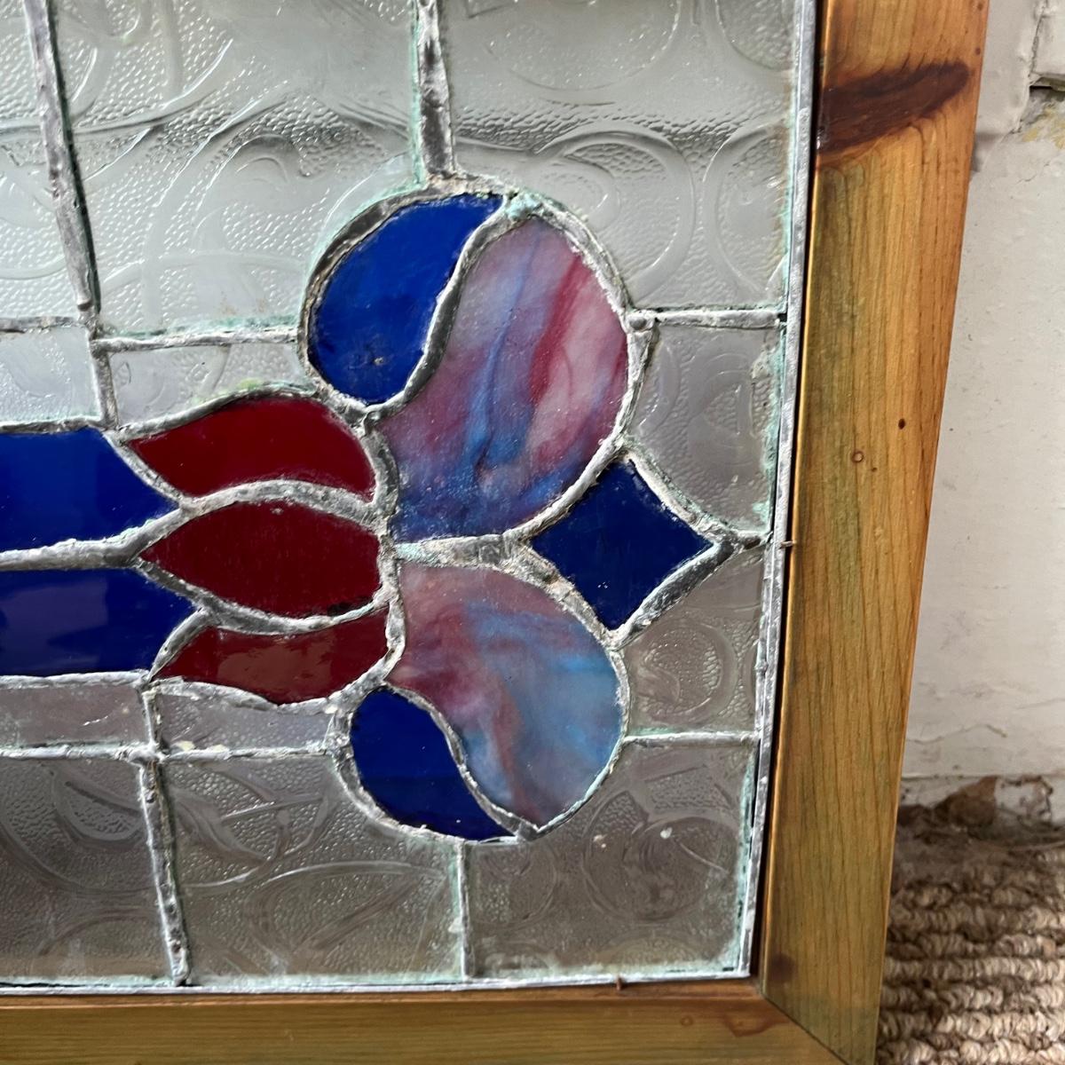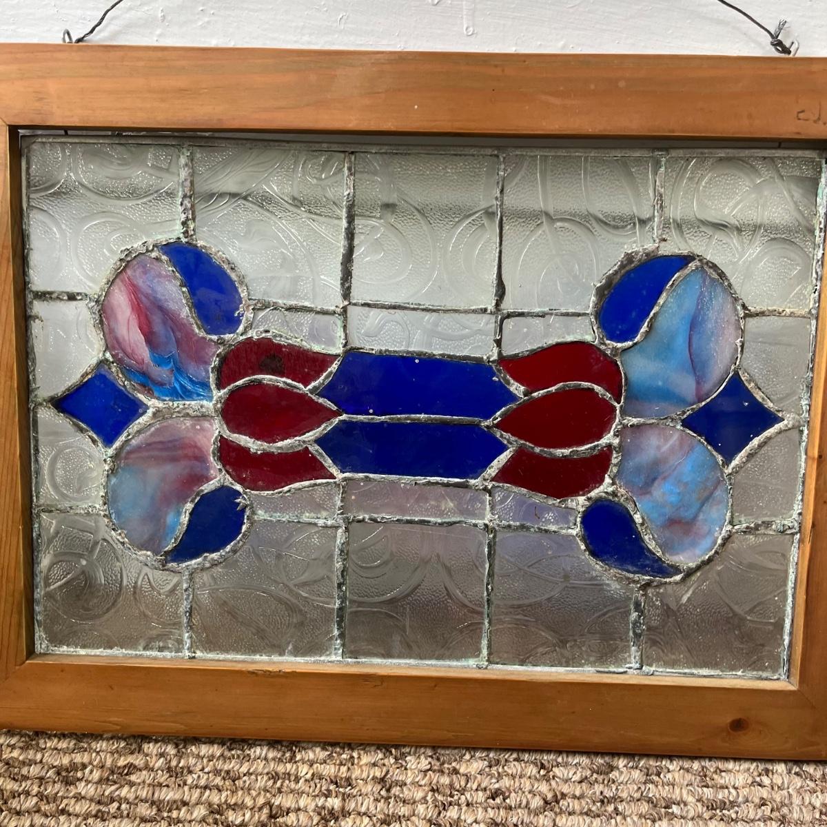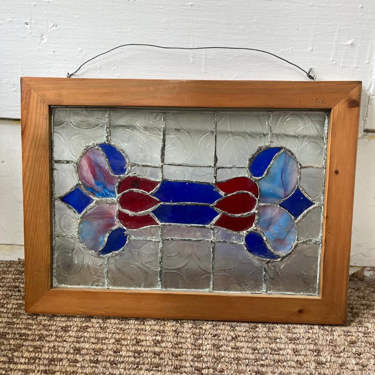 Lot includes a wooden framed stained glass piece of art and a painted glass mounted in a wooden frame. Largest frame measures 14” x 20.5”.