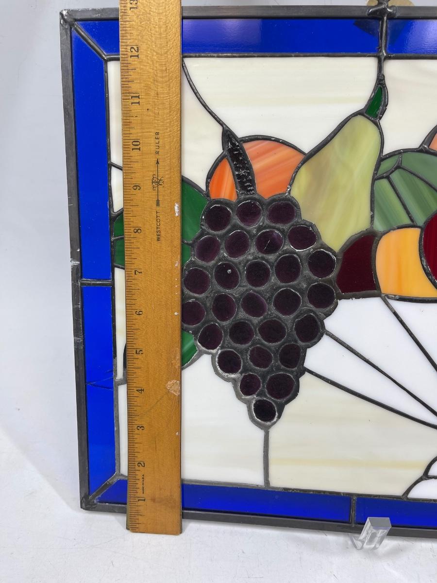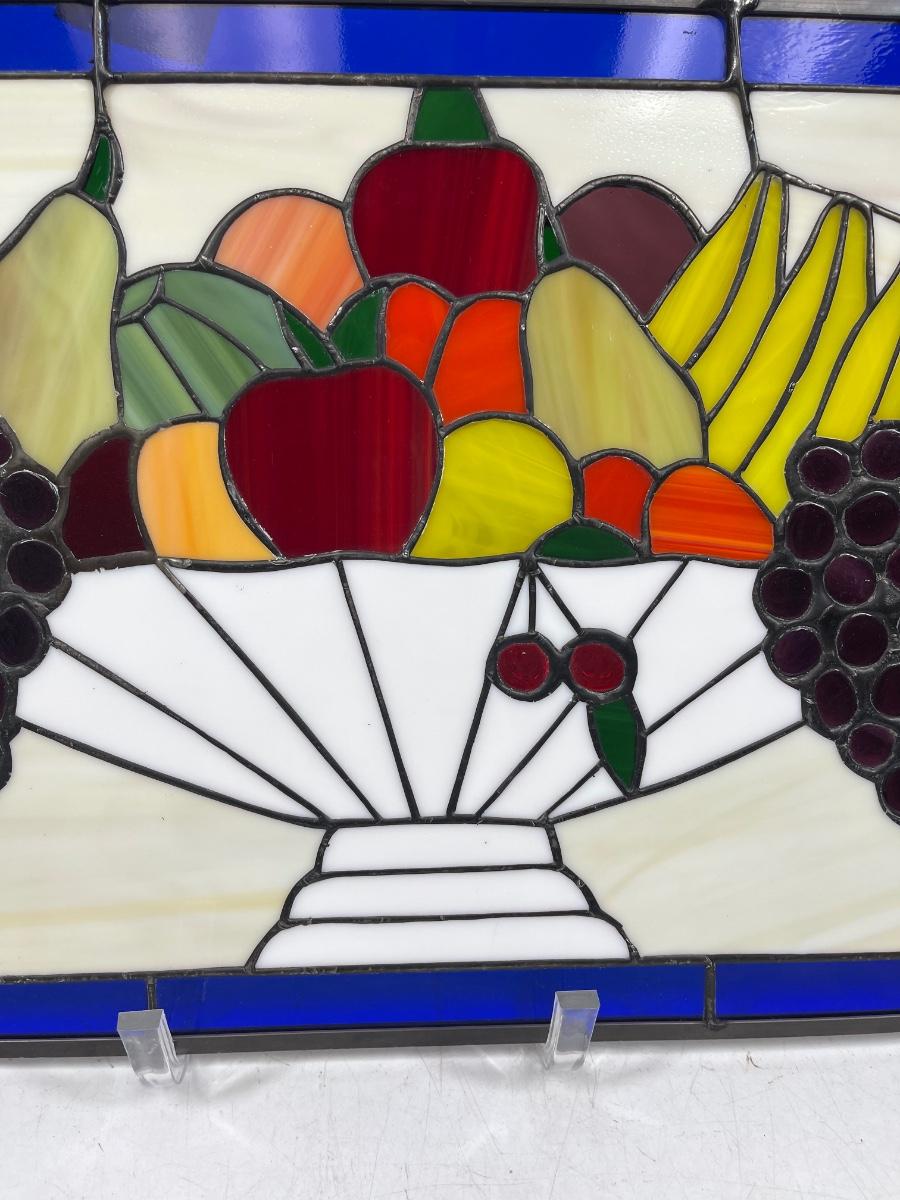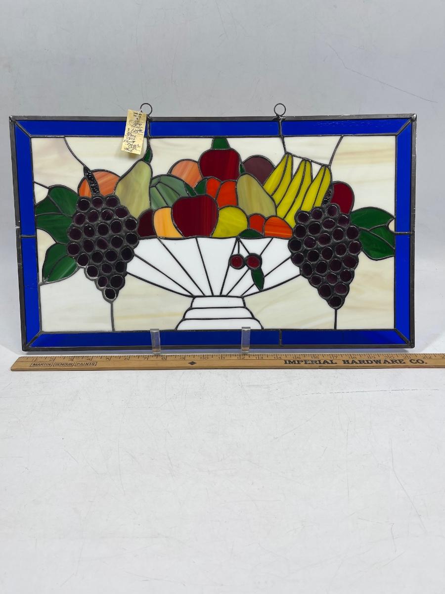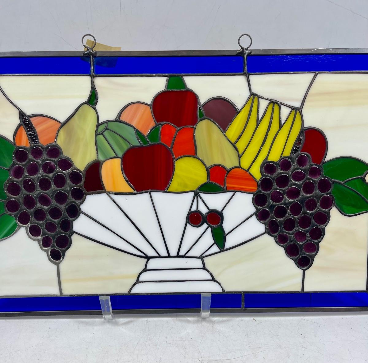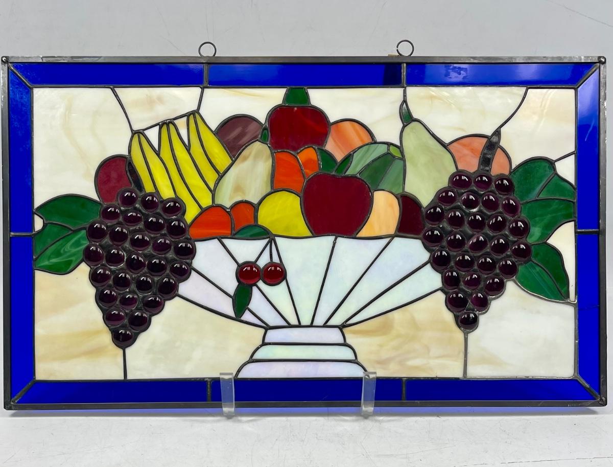 Stained Glass Rectangular Panel Stilllife Bowl of Fruit with Cobalt Blue Border Handcrafted