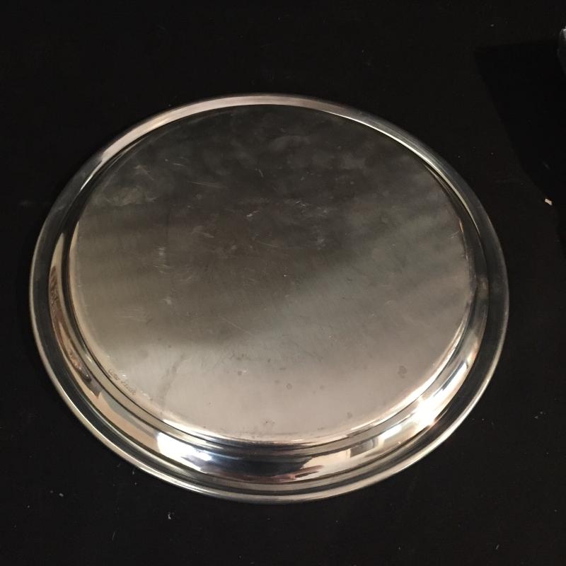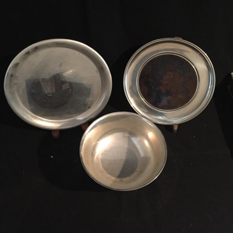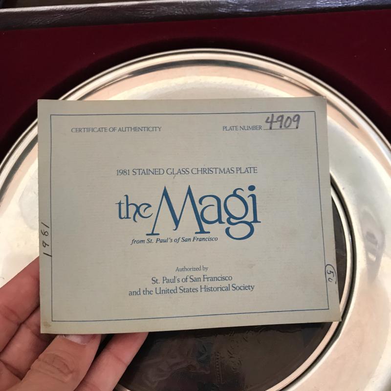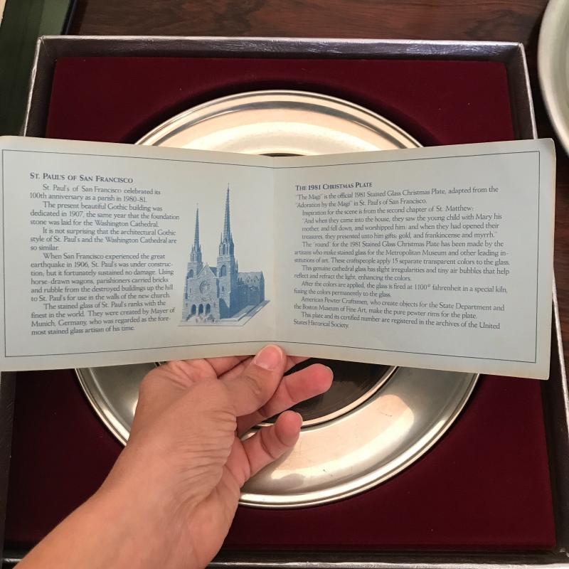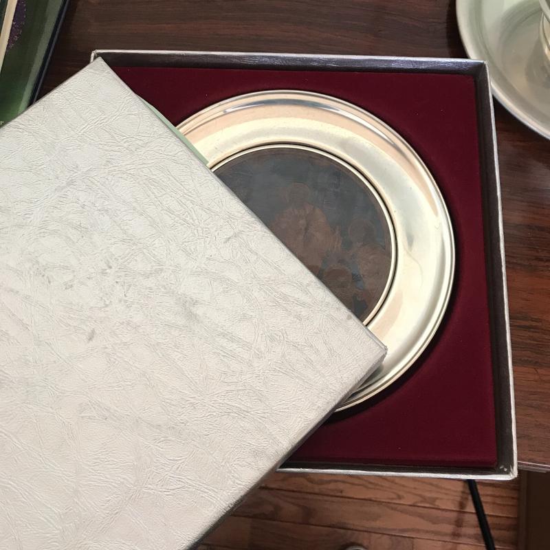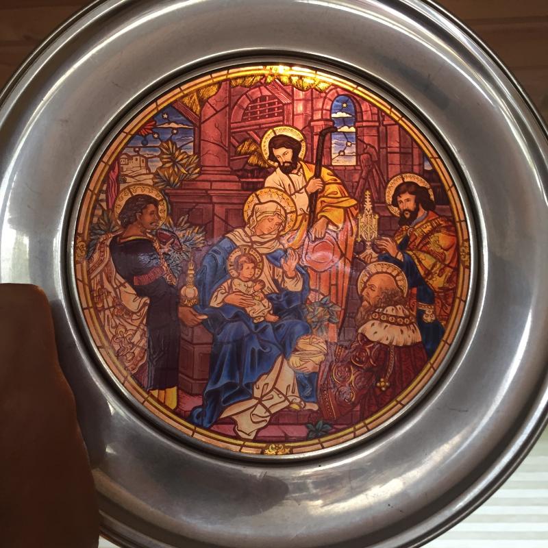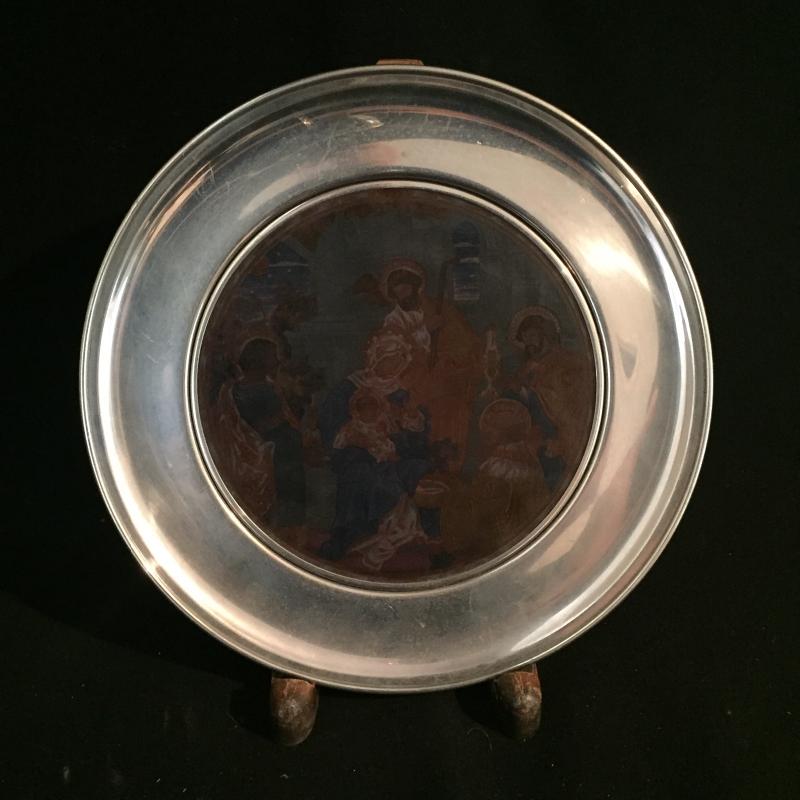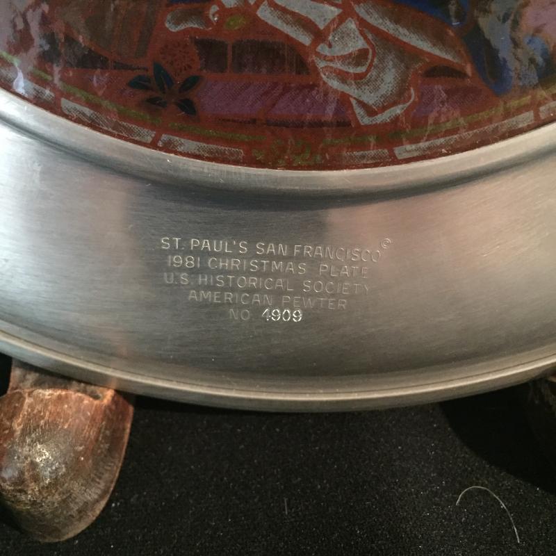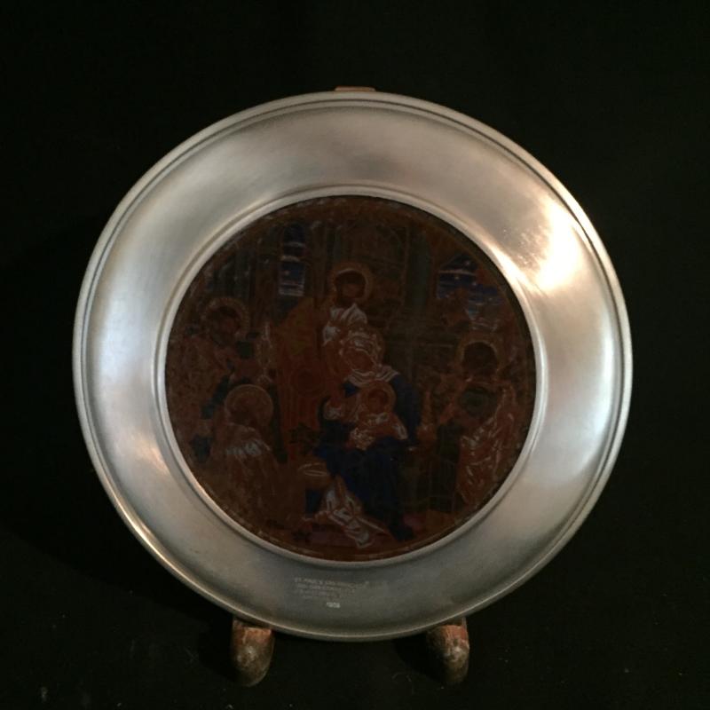 Pewter and Stained Glass 1981 Collectible Christmas Plate in box. Comes with Certificate of Authenticity as Plate #4909. Lot also includes a heavy pewter plate (scratched) that says Cartier on bottom-See Pictures. Largest plate Measures 10.75” D. Shipping Available