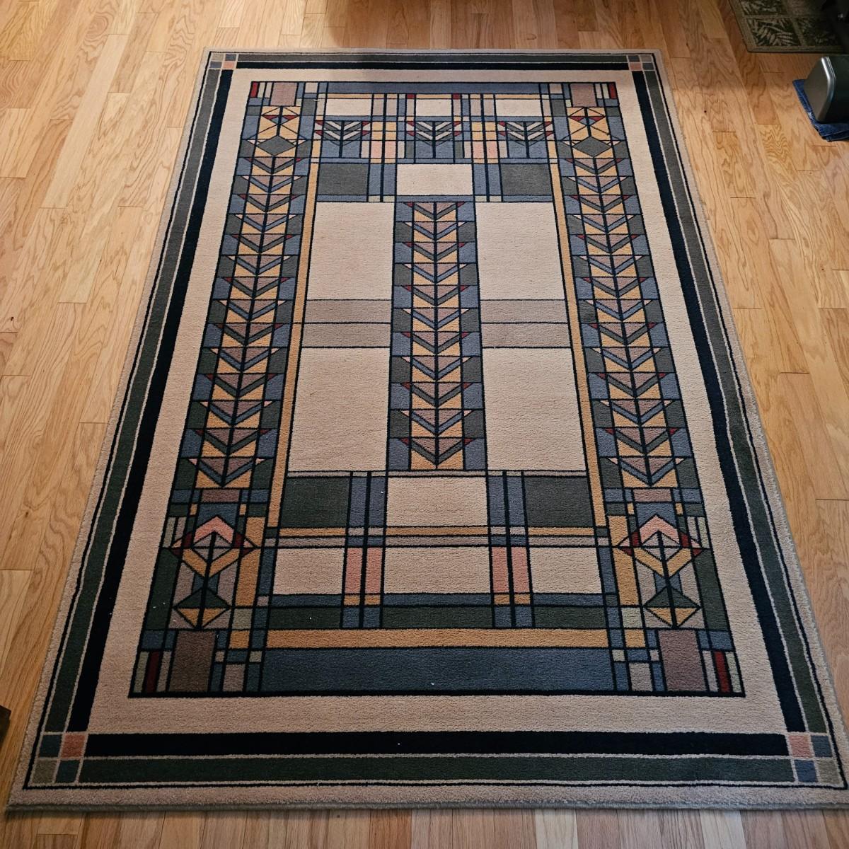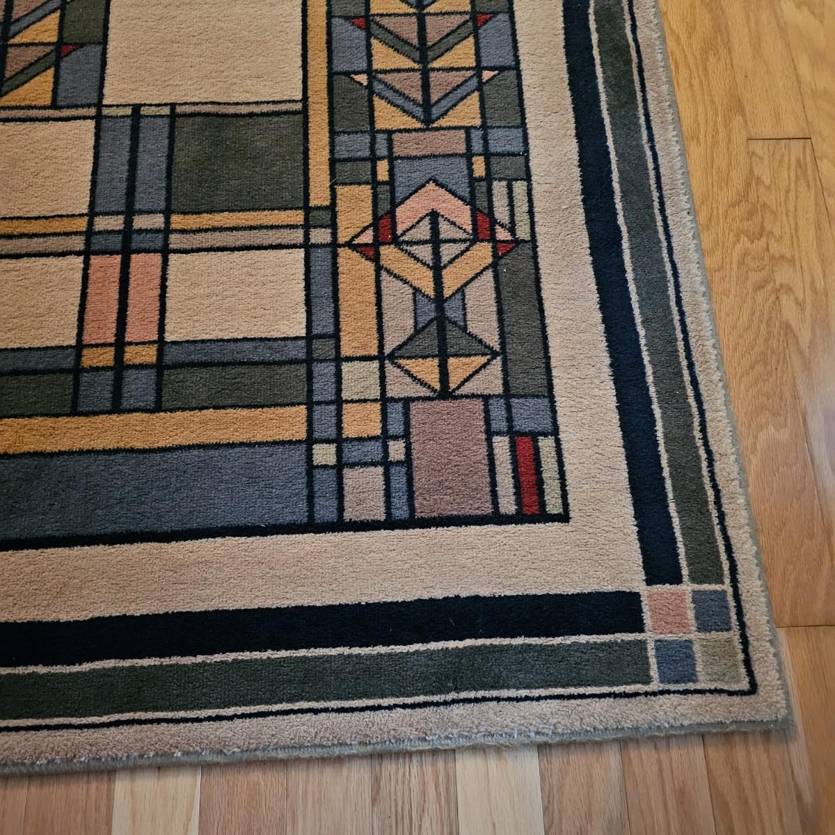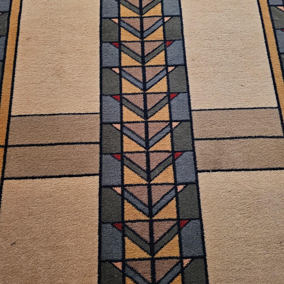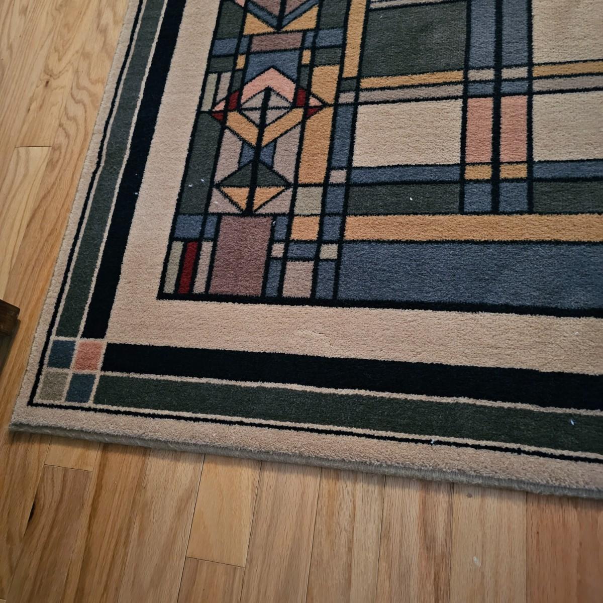 Beautiful prairie style Karastan rug with a stained glass window look. Tans, browns, greens and reds in a chevron style pattern make up this design. Bound edges all around. Pile appears to be wool, but we cannot verify this and there is no label. Rug measures approximately 5' x 8'. See photos for details. Local pickup only.